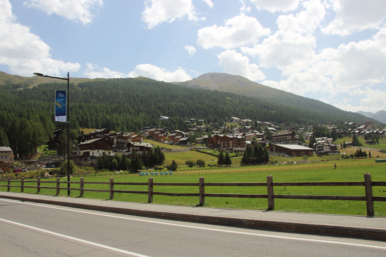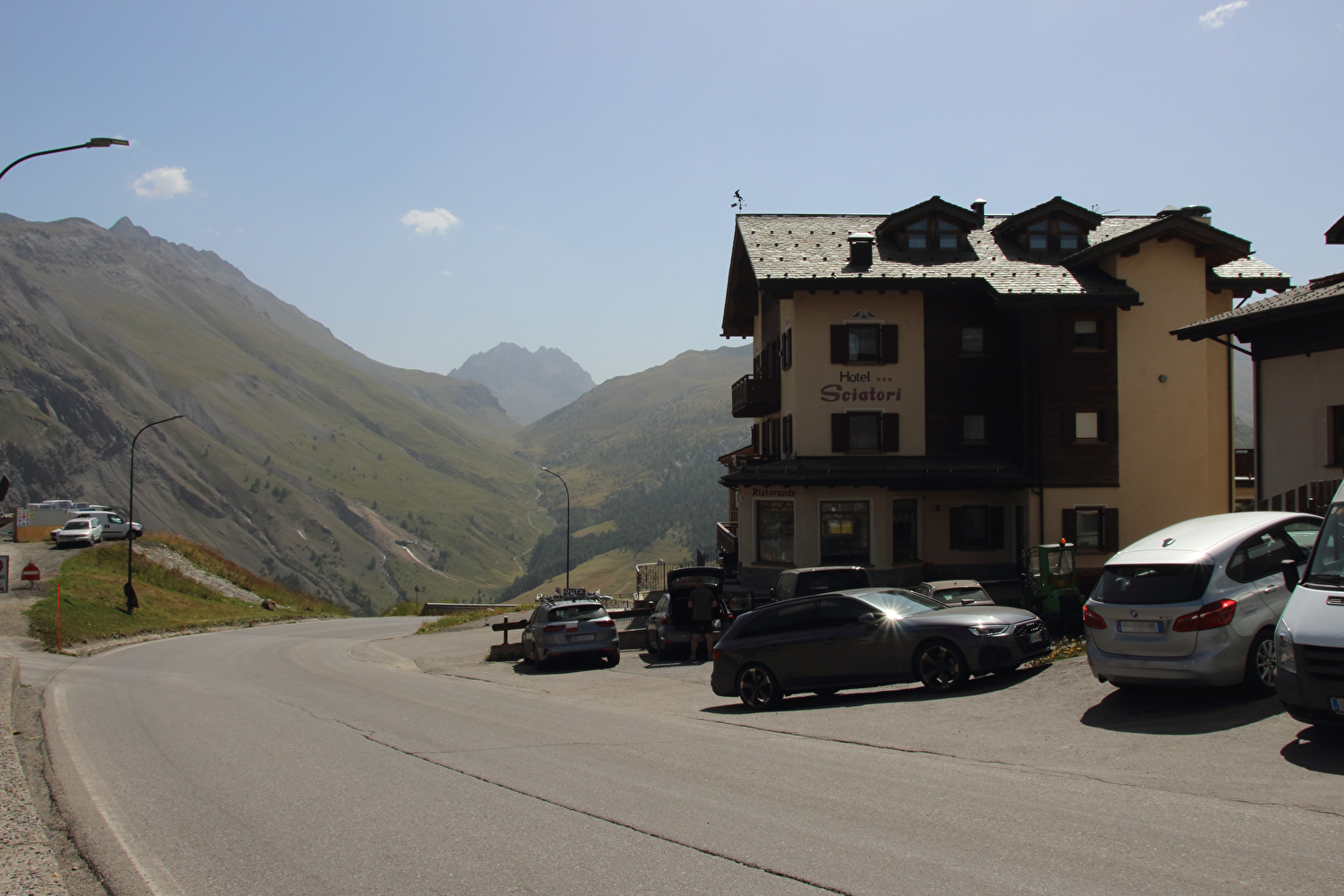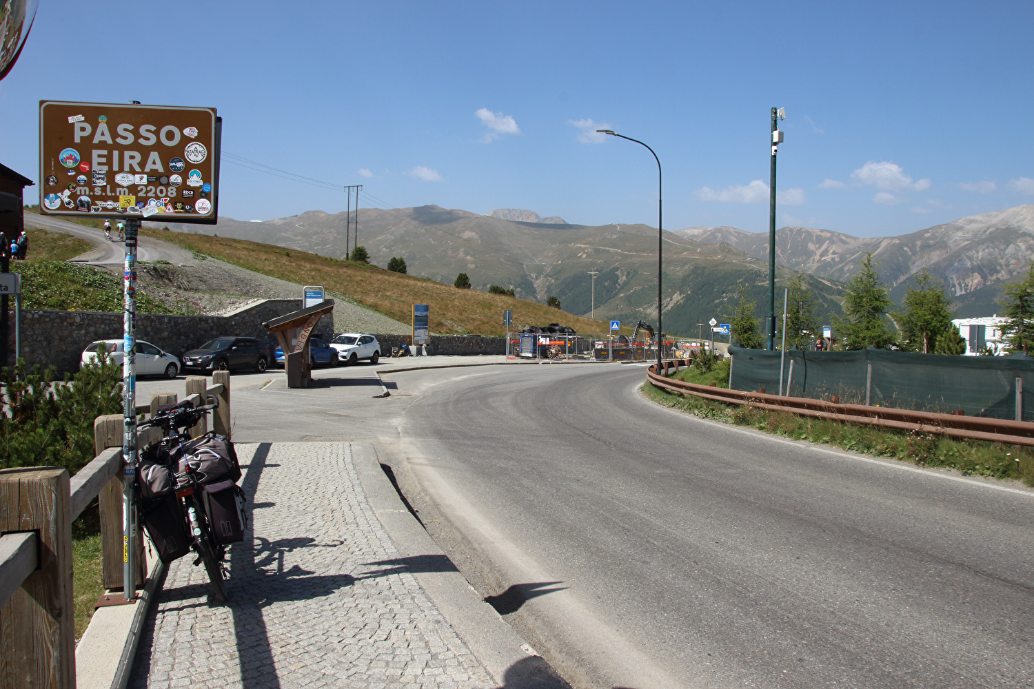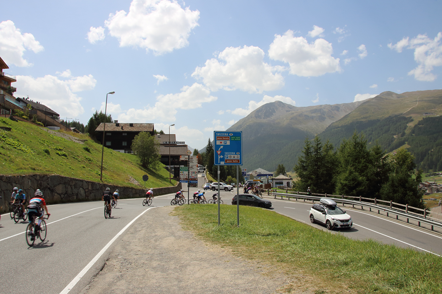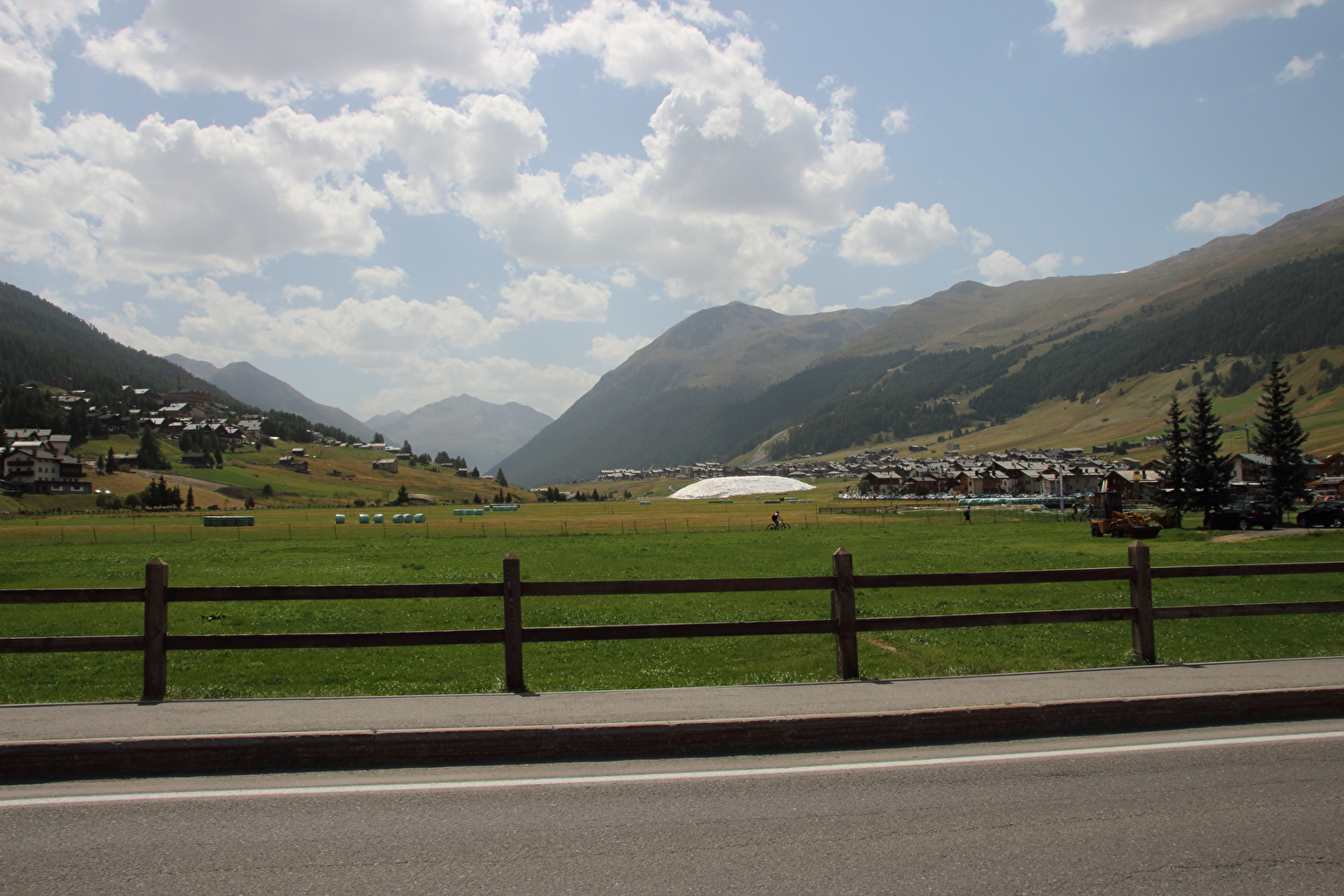 Sonne, Sonne, nichts als Sonne, und dazu wurde es alsbald ungewöhnlich warm. In der Sonne wurden trotz der Höhenlage auf über 1800 m s.l.m. rasch mehr als +30 °C erreicht. Durch die witterungsbedingt notwendige Anpassung der Reisegeschwindigkeit zog sich die Etappe länger als geplant. Erst am Nachmittag zeigten sich einzelne Wolken am Himmel ohne jedoch nennenswert Schatten zu spenden. Bedingt durch die Quartierverfügbarkeit war diese Etappe eine Art „Bummeletappe“, obwohl mit dem Passo d’Eira ein Bergpass auf der Strecke lag. Die Kürze der Etappe passte ganz gut nach dem „Dach der Tour“ und der Königsetappe an den beiden Vortagen. Livigno, das unter anderem zur Proviantergänzung angefahren wurde, war komplett überlaufen. Zu allem Überfluss riss im Ort eine Speiche im Hinterrad. ☹ Um den Schaden nicht zu vergrößern, wurde bis zur Fahrradwerkstatt geschoben, die natürlich genau am anderen Ende von Livigno lag. Daraus resultieren die lange Reisezeit und der niedrige Schnitt. Im Lebensmittelladen, der nach der Reparatur angefahren wurde, zeigte sich, womit die dort ihr Geld verdienen. Ein Gang war komplett mit Sprit (für den Fahrer, nicht für den Tank) und Fluppen belegt. Das übrige recht übersichtliche Warensortiment war auf die übrigen Gänge verteilt.