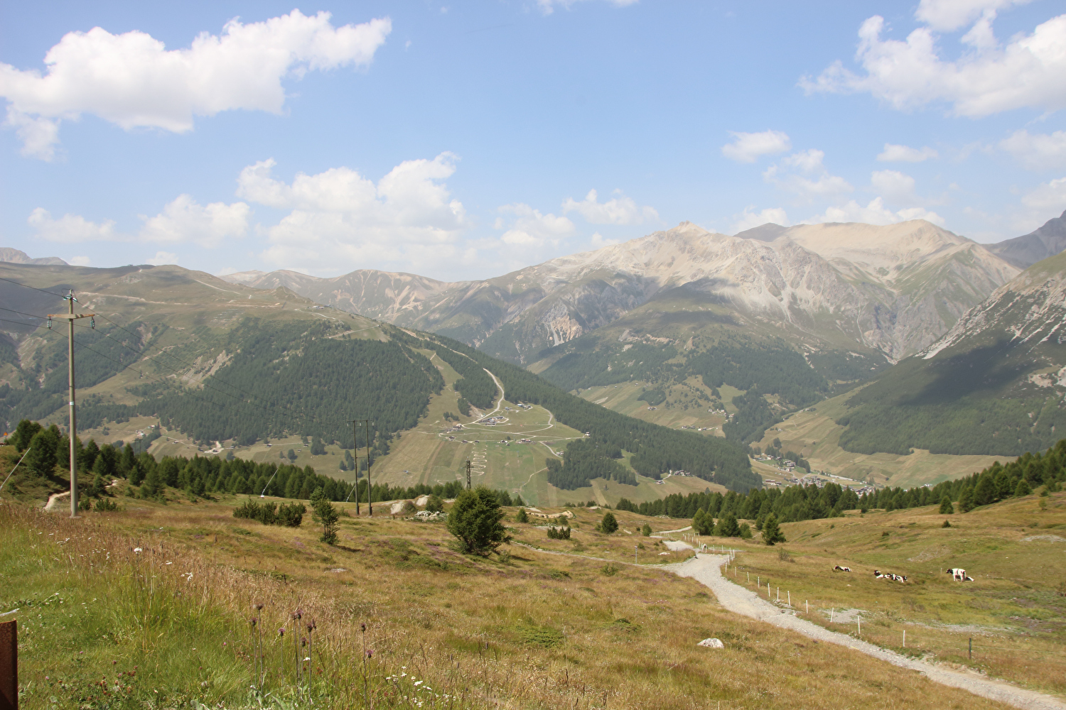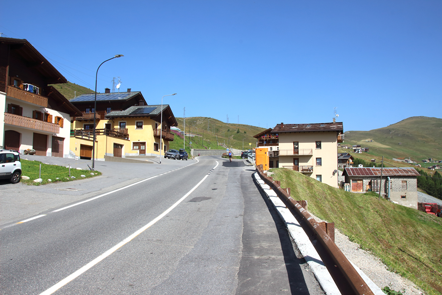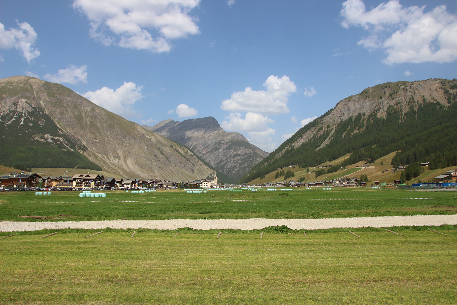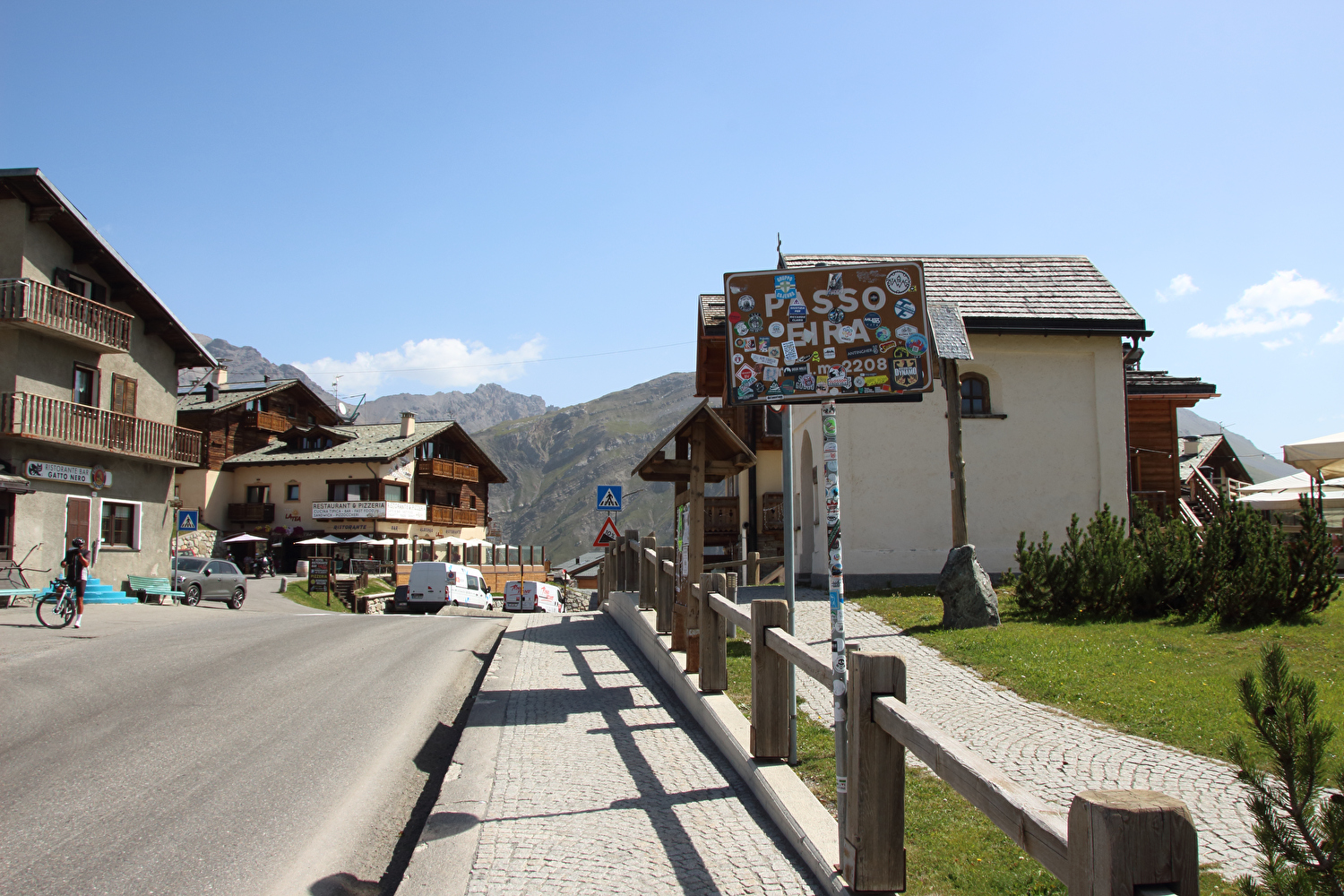 Sonne, Sonne, nichts als Sonne, und dazu wurde es alsbald ungewöhnlich warm. In der Sonne wurden trotz der Höhenlage auf über 1800 m s.l.m. rasch mehr als +30 °C erreicht. Durch die witterungsbedingt notwendige Anpassung der Reisegeschwindigkeit zog sich die Etappe länger als geplant. Erst am Nachmittag zeigten sich einzelne Wolken am Himmel ohne jedoch nennenswert Schatten zu spenden. Bedingt durch die Quartierverfügbarkeit war diese Etappe eine Art „Bummeletappe“, obwohl mit dem Passo d’Eira ein Bergpass auf der Strecke lag. Die Kürze der Etappe passte ganz gut nach dem „Dach der Tour“ und der Königsetappe an den beiden Vortagen. Livigno, das unter anderem zur Proviantergänzung angefahren wurde, war komplett überlaufen. Zu allem Überfluss riss im Ort eine Speiche im Hinterrad. ☹ Um den Schaden nicht zu vergrößern, wurde bis zur Fahrradwerkstatt geschoben, die natürlich genau am anderen Ende von Livigno lag. Daraus resultieren die lange Reisezeit und der niedrige Schnitt. Im Lebensmittelladen, der nach der Reparatur angefahren wurde, zeigte sich, womit die dort ihr Geld verdienen. Ein Gang war komplett mit Sprit (für den Fahrer, nicht für den Tank) und Fluppen belegt. Das übrige recht übersichtliche Warensortiment war auf die übrigen Gänge verteilt.