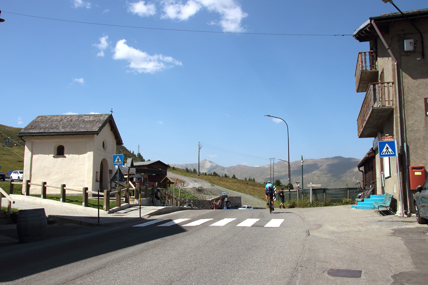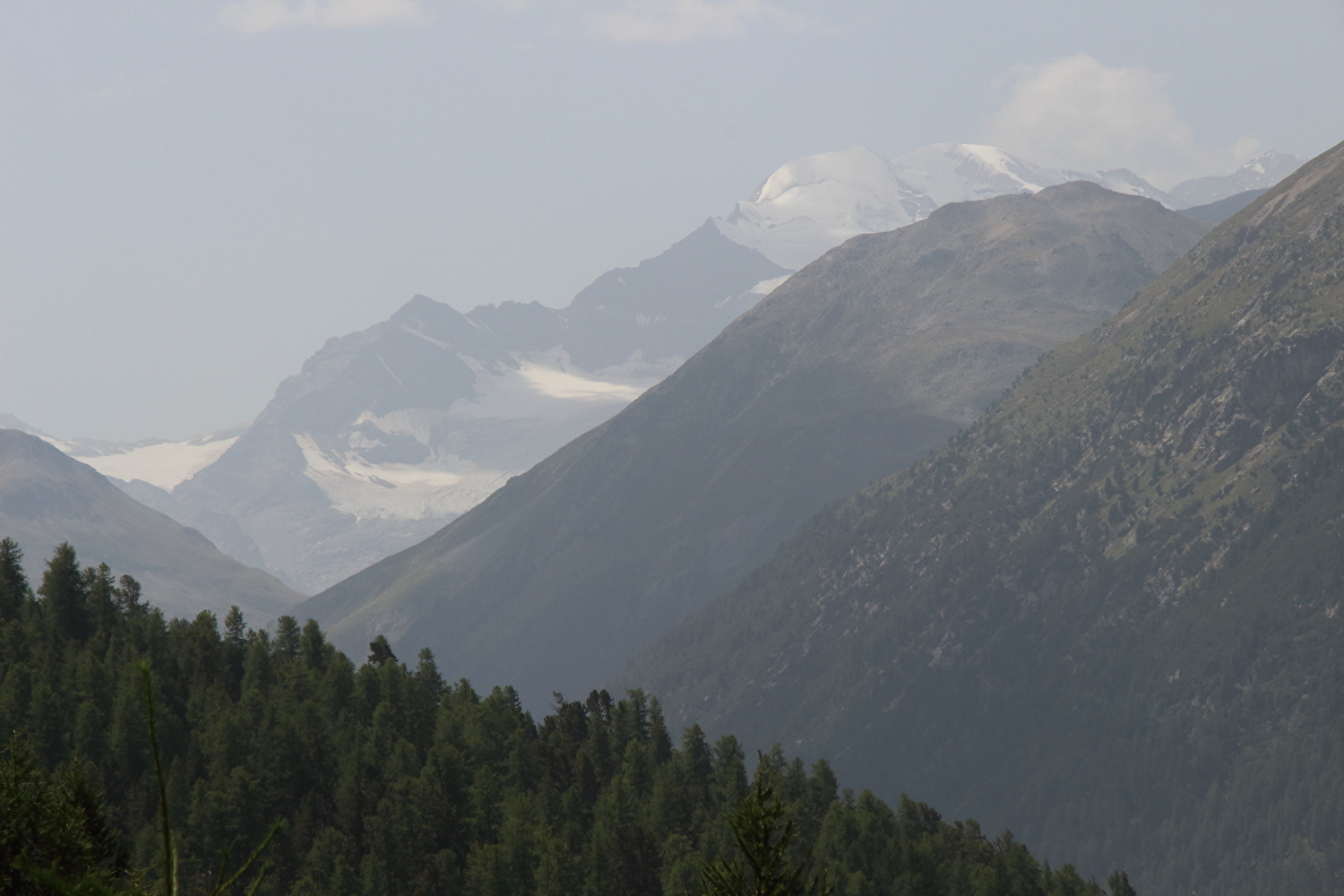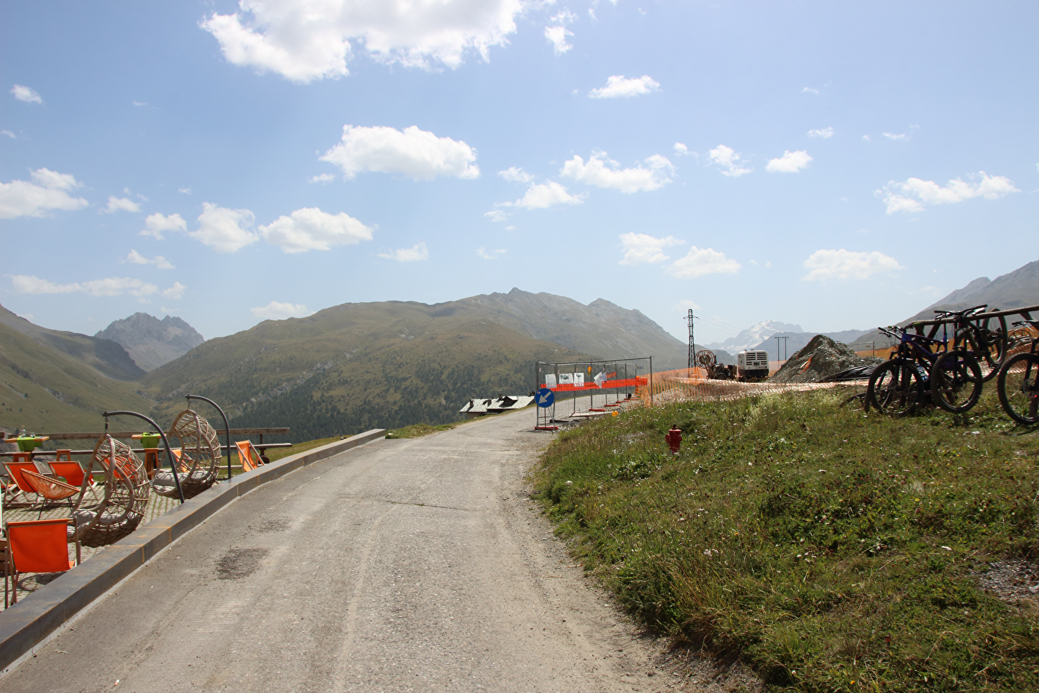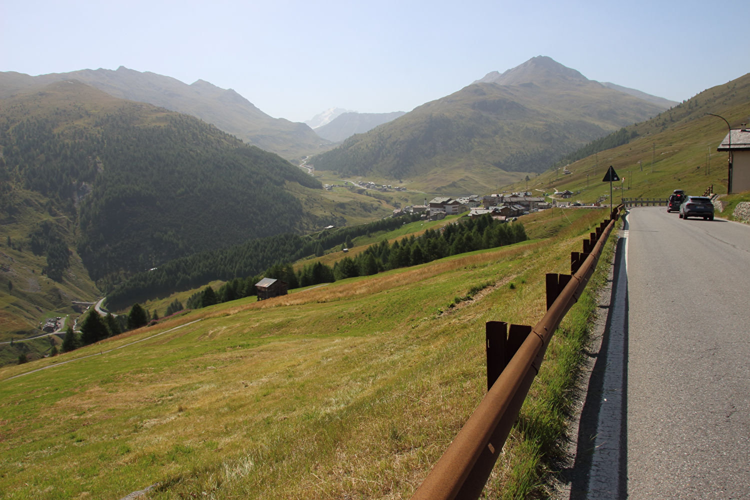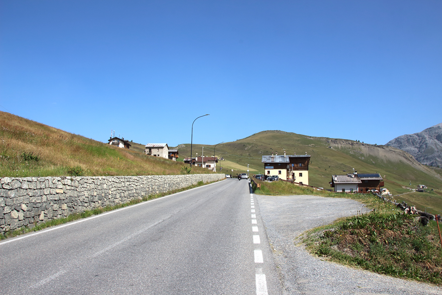 Sonne, Sonne, nichts als Sonne, und dazu wurde es alsbald ungewöhnlich warm. In der Sonne wurden trotz der Höhenlage auf über 1800 m s.l.m. rasch mehr als +30 °C erreicht. Durch die witterungsbedingt notwendige Anpassung der Reisegeschwindigkeit zog sich die Etappe länger als geplant. Erst am Nachmittag zeigten sich einzelne Wolken am Himmel ohne jedoch nennenswert Schatten zu spenden. Bedingt durch die Quartierverfügbarkeit war diese Etappe eine Art „Bummeletappe“, obwohl mit dem Passo d’Eira ein Bergpass auf der Strecke lag. Die Kürze der Etappe passte ganz gut nach dem „Dach der Tour“ und der Königsetappe an den beiden Vortagen. Livigno, das unter anderem zur Proviantergänzung angefahren wurde, war komplett überlaufen. Zu allem Überfluss riss im Ort eine Speiche im Hinterrad. ☹ Um den Schaden nicht zu vergrößern, wurde bis zur Fahrradwerkstatt geschoben, die natürlich genau am anderen Ende von Livigno lag. Daraus resultieren die lange Reisezeit und der niedrige Schnitt. Im Lebensmittelladen, der nach der Reparatur angefahren wurde, zeigte sich, womit die dort ihr Geld verdienen. Ein Gang war komplett mit Sprit (für den Fahrer, nicht für den Tank) und Fluppen belegt. Das übrige recht übersichtliche Warensortiment war auf die übrigen Gänge verteilt.