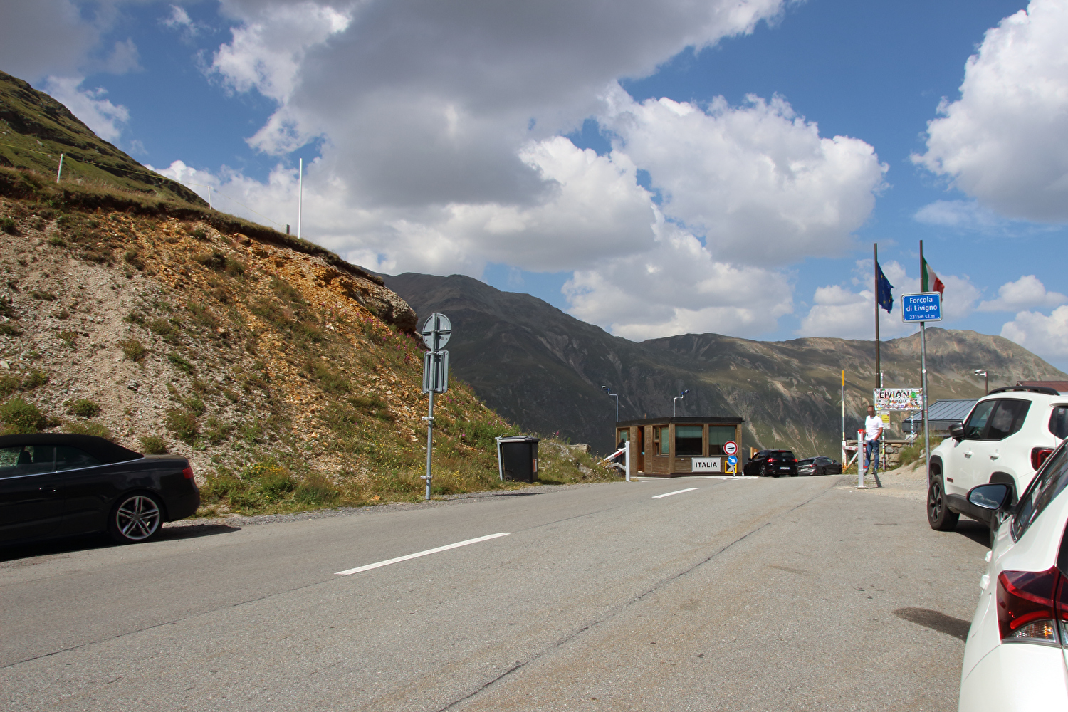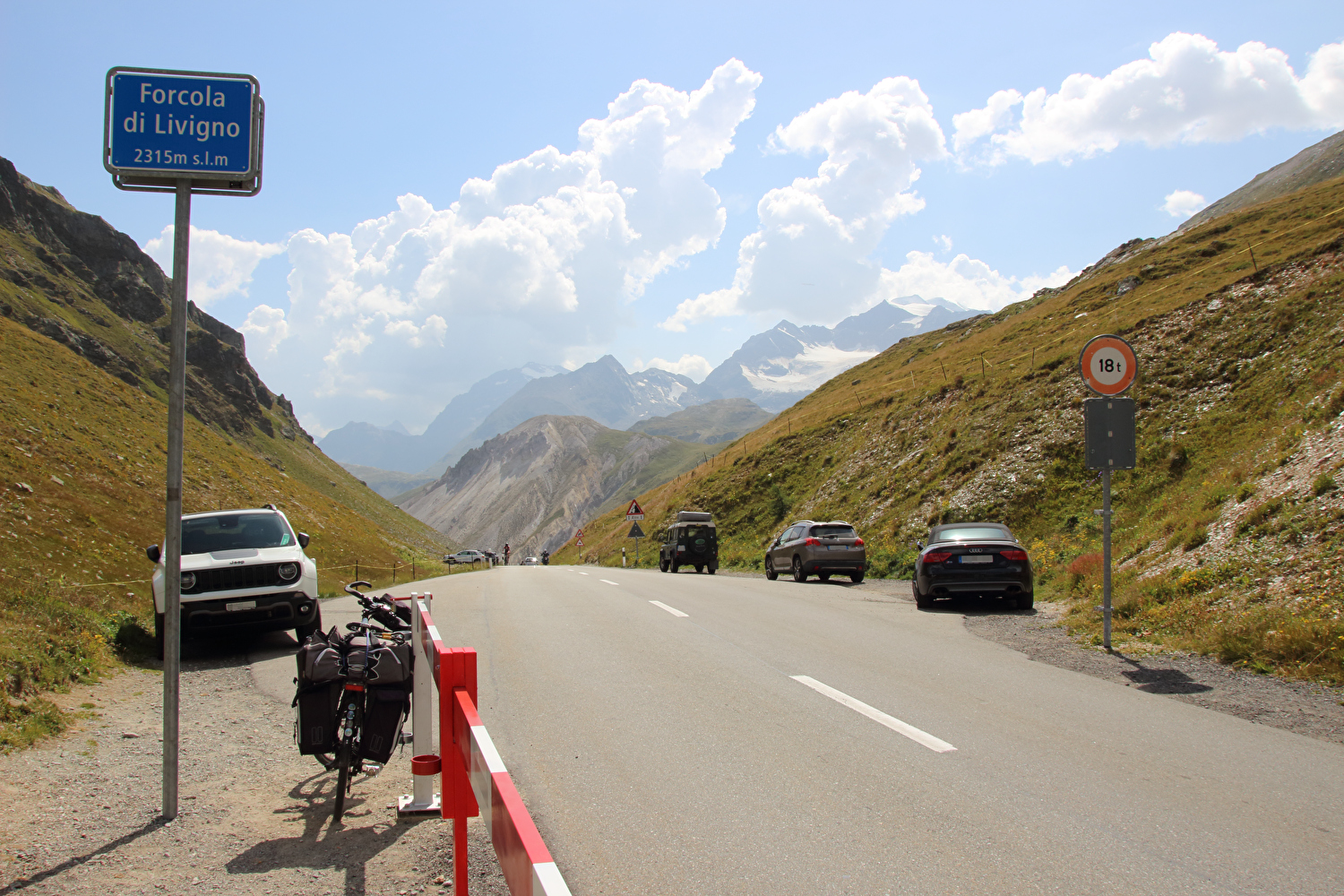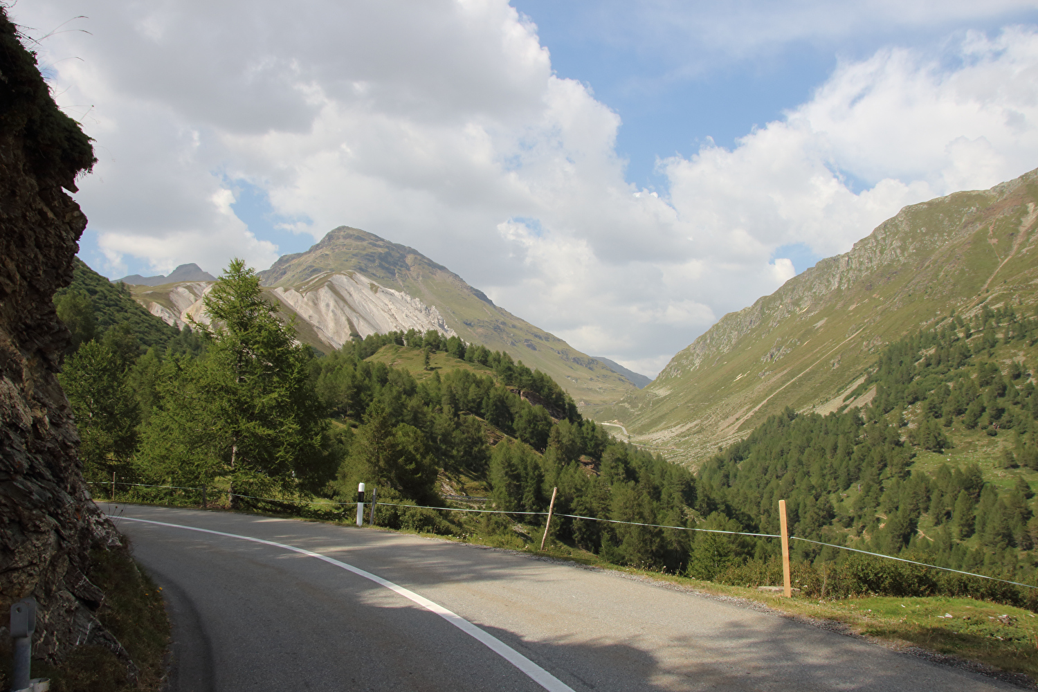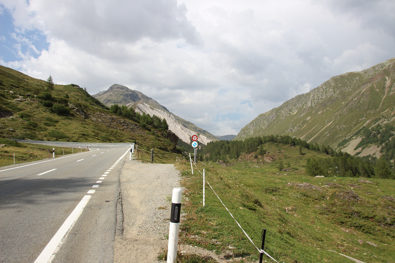 Trotz der Höhenlage auf über 1800 m s.l.m. war es schon zu Beginn der Etappe sehr warm. Zunächst schien die Sonne auch noch recht ungestört durch wenige Schleierwolken. Diese verdichteten sich jedoch zeitweise, lösten sich zum Mittag hin aber auf. Dafür zogen vermehrt Quellwolken auf und am Nachmittag streifte ein lokal begrenztes Regengebiet die Route. Die volle Ladung kam jedoch knapp östlich, vermutlich im Val di Livigno nieder. Ein Schauer fiel aber doch so kräftig, das wegen nicht vorhandener Unterstellmöglichkeiten kurz die Norddeutsche Trachtenkleidung (mit kurzer Regenhose und ohne Regenüberhandschuhe) angezogen werden musste. Auf der Passhöhe des Passo Forcola di Livigno, der bei dieser Doppelpassetappe trotz seiner Höhe von 2315 m s.l.m. nicht das „Dach der Etappe“ war, wurde die Staatsgrenze zwischen Italien und der Schweiz überquert.