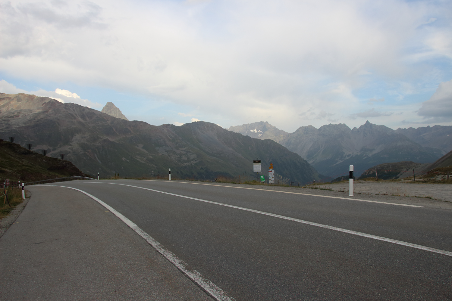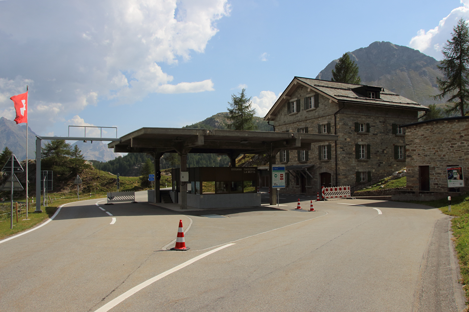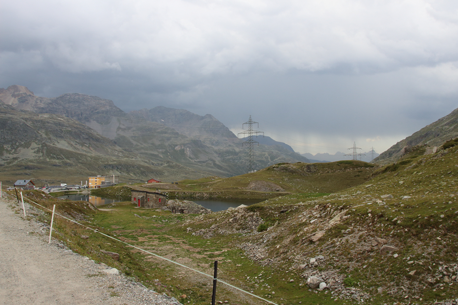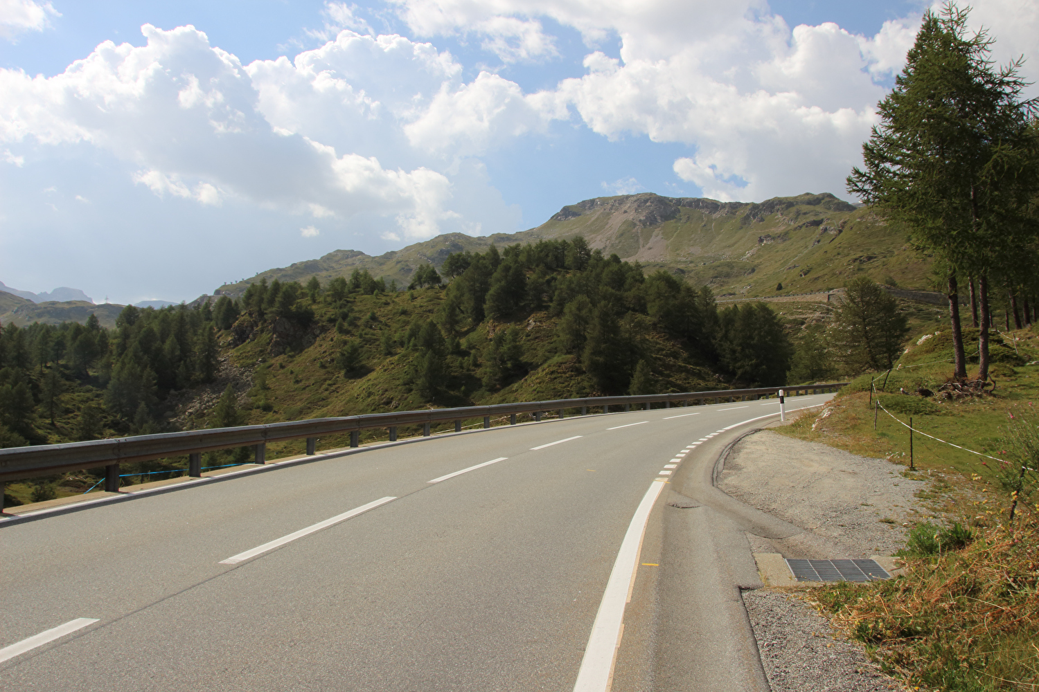 Trotz der Höhenlage auf über 1800 m s.l.m. war es schon zu Beginn der Etappe sehr warm. Zunächst schien die Sonne auch noch recht ungestört durch wenige Schleierwolken. Diese verdichteten sich jedoch zeitweise, lösten sich zum Mittag hin aber auf. Dafür zogen vermehrt Quellwolken auf und am Nachmittag streifte ein lokal begrenztes Regengebiet die Route. Die volle Ladung kam jedoch knapp östlich, vermutlich im Val di Livigno nieder. Ein Schauer fiel aber doch so kräftig, das wegen nicht vorhandener Unterstellmöglichkeiten kurz die Norddeutsche Trachtenkleidung (mit kurzer Regenhose und ohne Regenüberhandschuhe) angezogen werden musste. Auf der Passhöhe des Passo Forcola di Livigno, der bei dieser Doppelpassetappe trotz seiner Höhe von 2315 m s.l.m. nicht das „Dach der Etappe“ war, wurde die Staatsgrenze zwischen Italien und der Schweiz überquert.