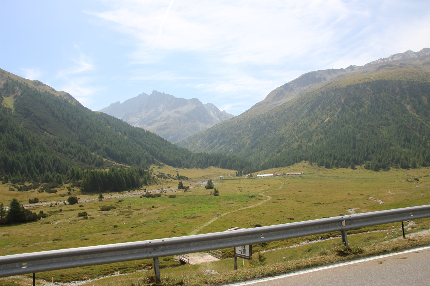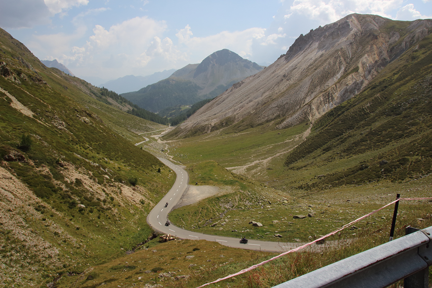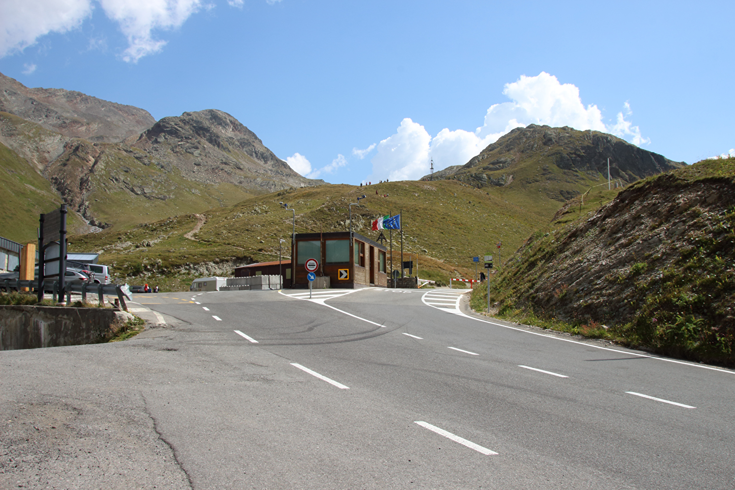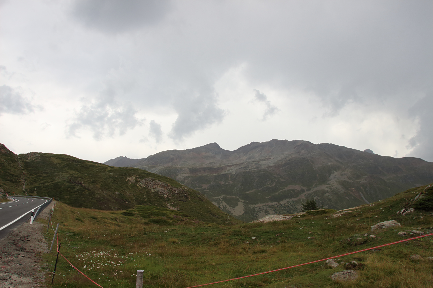 Trotz der Höhenlage auf über 1800 m s.l.m. war es schon zu Beginn der Etappe sehr warm. Zunächst schien die Sonne auch noch recht ungestört durch wenige Schleierwolken. Diese verdichteten sich jedoch zeitweise, lösten sich zum Mittag hin aber auf. Dafür zogen vermehrt Quellwolken auf und am Nachmittag streifte ein lokal begrenztes Regengebiet die Route. Die volle Ladung kam jedoch knapp östlich, vermutlich im Val di Livigno nieder. Ein Schauer fiel aber doch so kräftig, das wegen nicht vorhandener Unterstellmöglichkeiten kurz die Norddeutsche Trachtenkleidung (mit kurzer Regenhose und ohne Regenüberhandschuhe) angezogen werden musste. Auf der Passhöhe des Passo Forcola di Livigno, der bei dieser Doppelpassetappe trotz seiner Höhe von 2315 m s.l.m. nicht das „Dach der Etappe“ war, wurde die Staatsgrenze zwischen Italien und der Schweiz überquert.