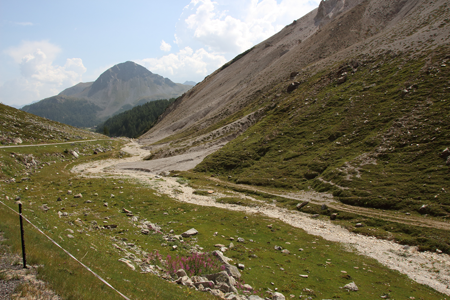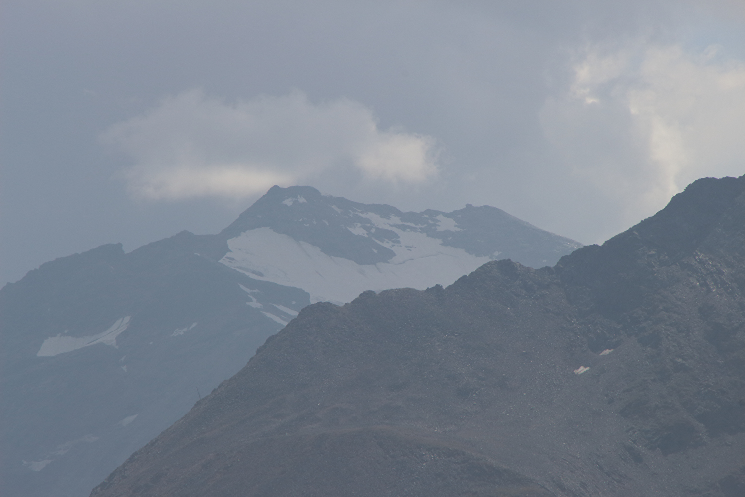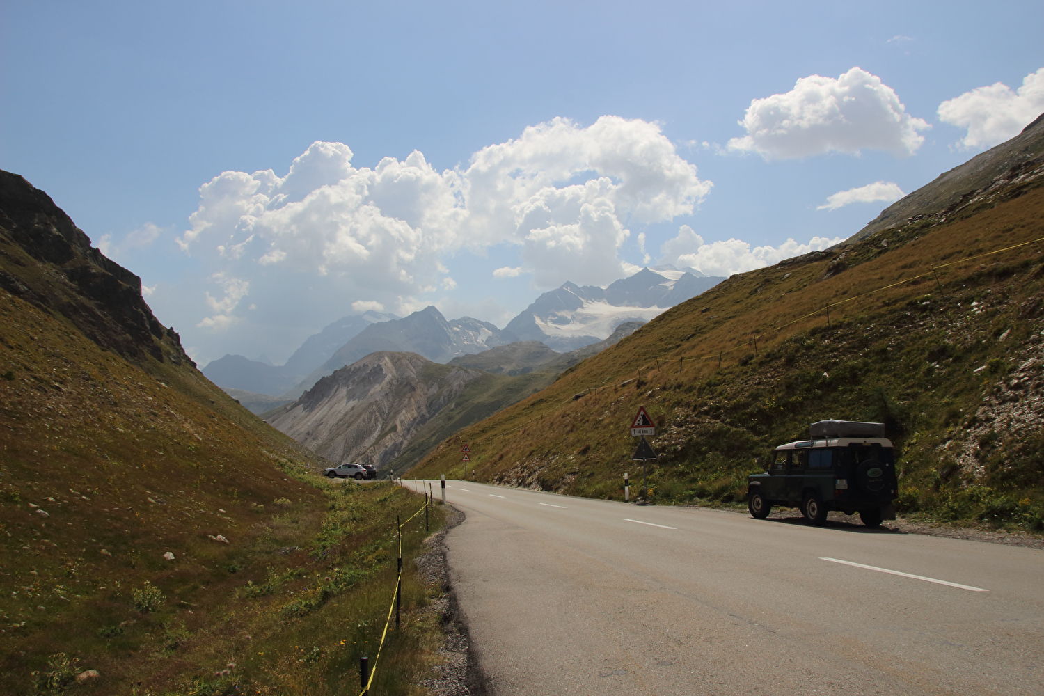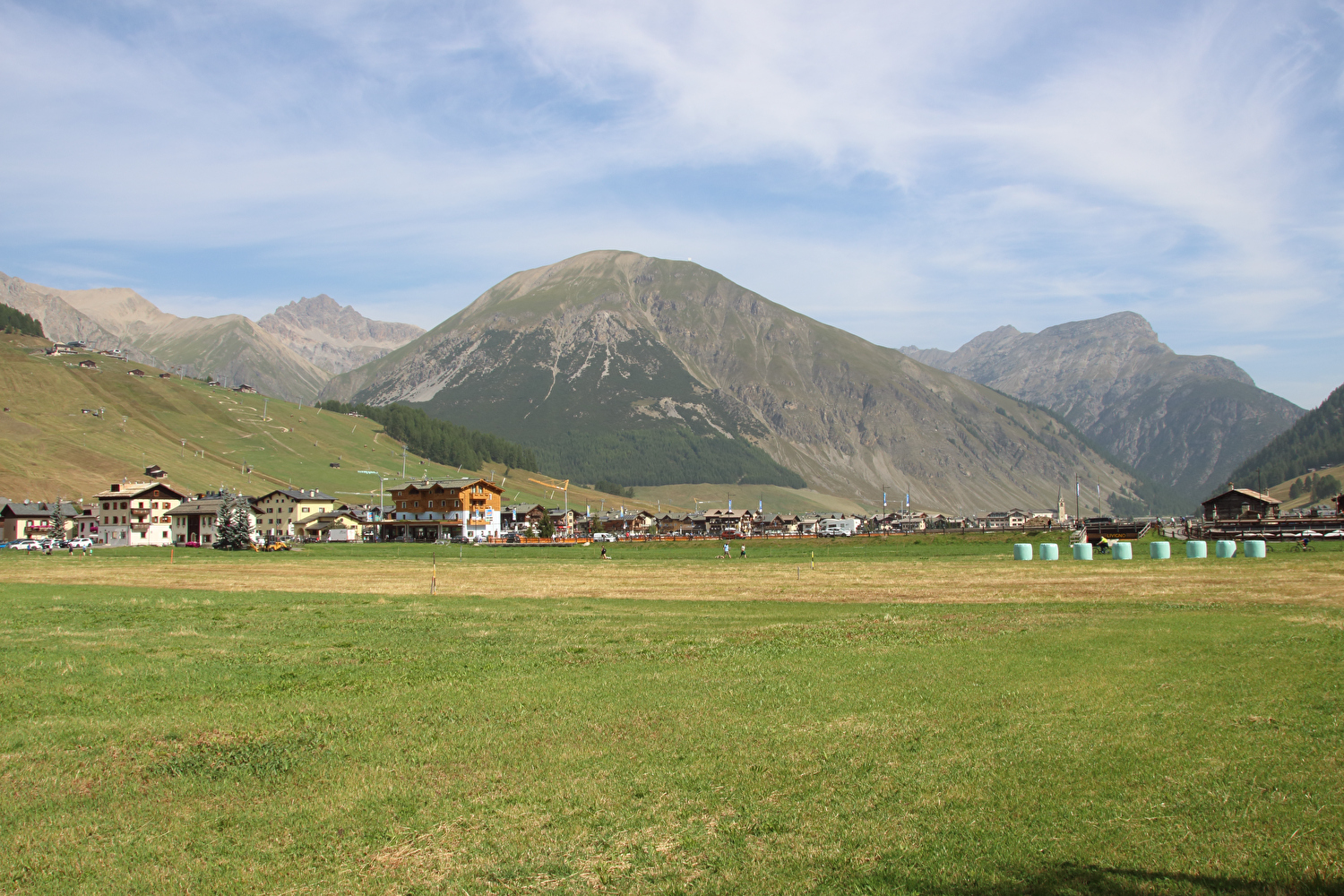 Trotz der Höhenlage auf über 1800 m s.l.m. war es schon zu Beginn der Etappe sehr warm. Zunächst schien die Sonne auch noch recht ungestört durch wenige Schleierwolken. Diese verdichteten sich jedoch zeitweise, lösten sich zum Mittag hin aber auf. Dafür zogen vermehrt Quellwolken auf und am Nachmittag streifte ein lokal begrenztes Regengebiet die Route. Die volle Ladung kam jedoch knapp östlich, vermutlich im Val di Livigno nieder. Ein Schauer fiel aber doch so kräftig, das wegen nicht vorhandener Unterstellmöglichkeiten kurz die Norddeutsche Trachtenkleidung (mit kurzer Regenhose und ohne Regenüberhandschuhe) angezogen werden musste. Auf der Passhöhe des Passo Forcola di Livigno, der bei dieser Doppelpassetappe trotz seiner Höhe von 2315 m s.l.m. nicht das „Dach der Etappe“ war, wurde die Staatsgrenze zwischen Italien und der Schweiz überquert.