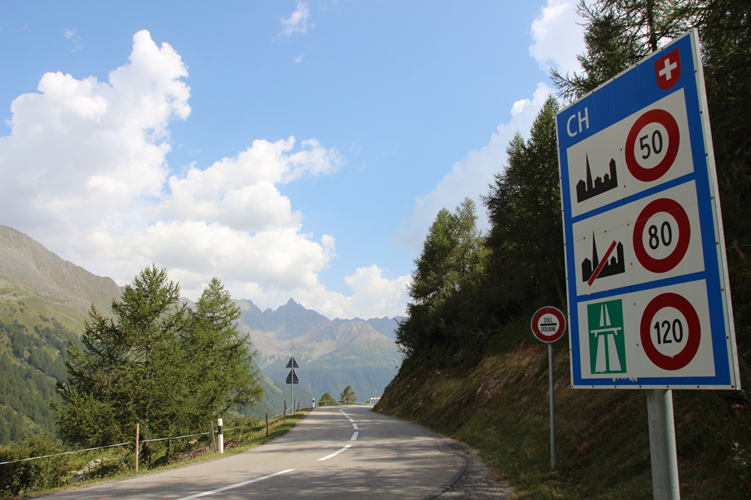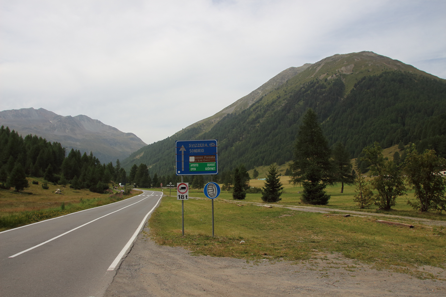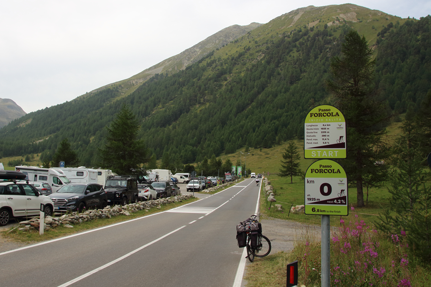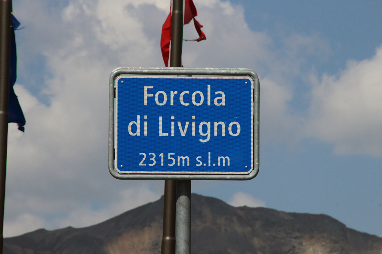Am unteren Ende der Nordrampe des Passo Forcola di Livigno steht ein Schild, wie es an jedem unteren Ende jeder Rampe über jeden Bergpass stehen sollte. Auf dem Schild sind angegeben die Länge der Strecke zwischen Standort, also dem unteren Ende der Rampe, und Ziel, also der Passhöhe, die Höhe am Standort, die Höhe am Ziel, die Höhendifferenz zwischen Start und Ziel, die maximale Steigung auf der Strecke und die mittlere Steigung der Strecke.