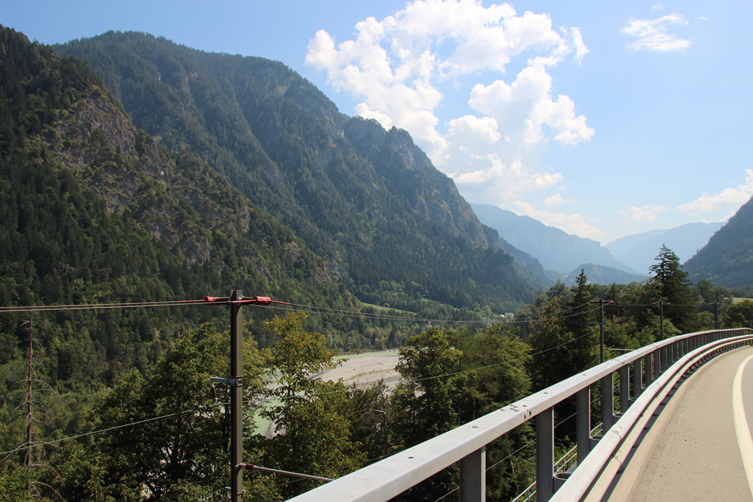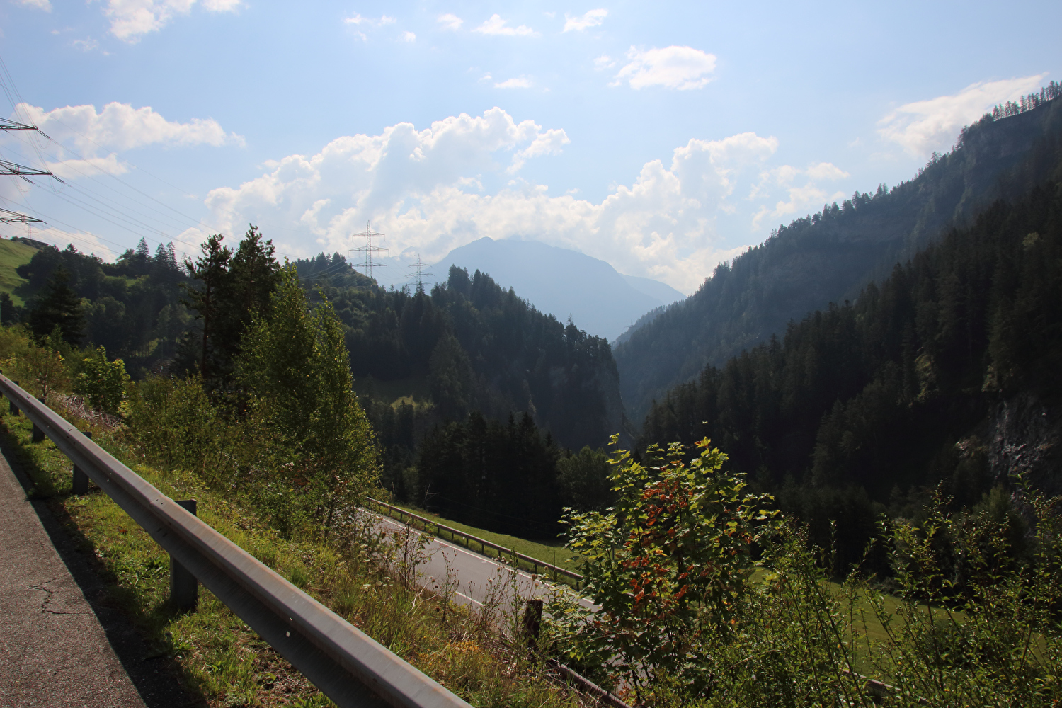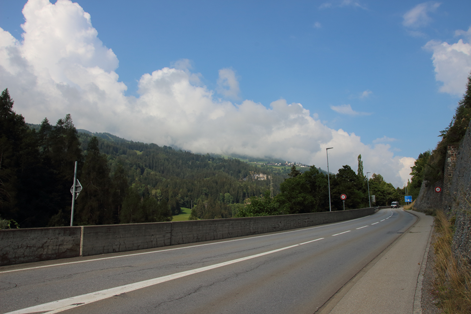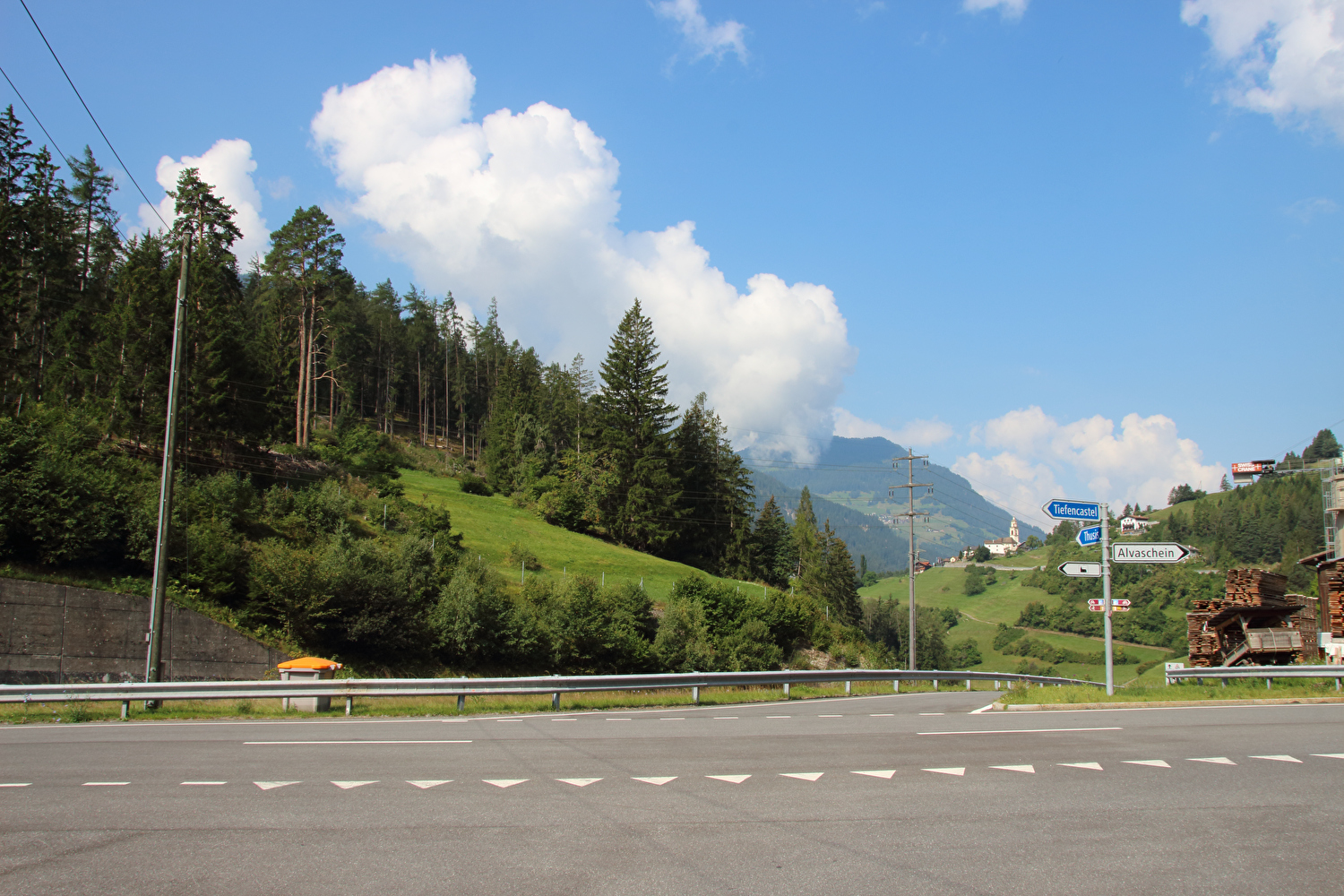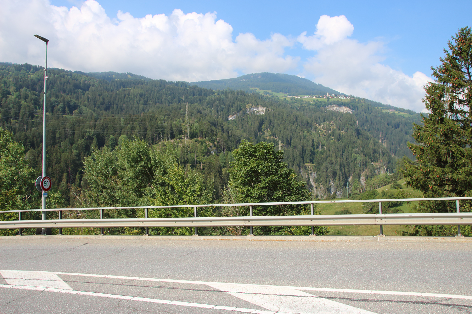Sonne, Sonne, nichts als Sonne, und dazu wurde es in der tiefen Lage auch recht warm. In der Sonne wurden rasch mehr als +30 °C erreicht. Im Schatten machte sich jedoch die mit dem neuen Hoch eingeflossene kühlere Luftmasse bemerkbar. In der Schinschlucht sowieso und dann auch im Hinterrheintal gab es passend zur Mittagszeit reichlich Schatten. Somit geriet diese letzte Etappe nicht zu einer Hitzeetappe. Davon hatte es bei dieser Tour schon mehr als genug gegeben. Vom Profil her war diese Etappe eine Mittelgebirgsetappe, die auch in entsprechenden Höhenlagen verlief. Das „Dach der Etappe“ in Alvaschein lag gerade so eben über 1000 m ü. M., für eine Etappe in den Alpen also sehr niedrig. In Tiefencastel wurde auf die Veloroute 6 „Graubünden-Route“ aufgefahren.
