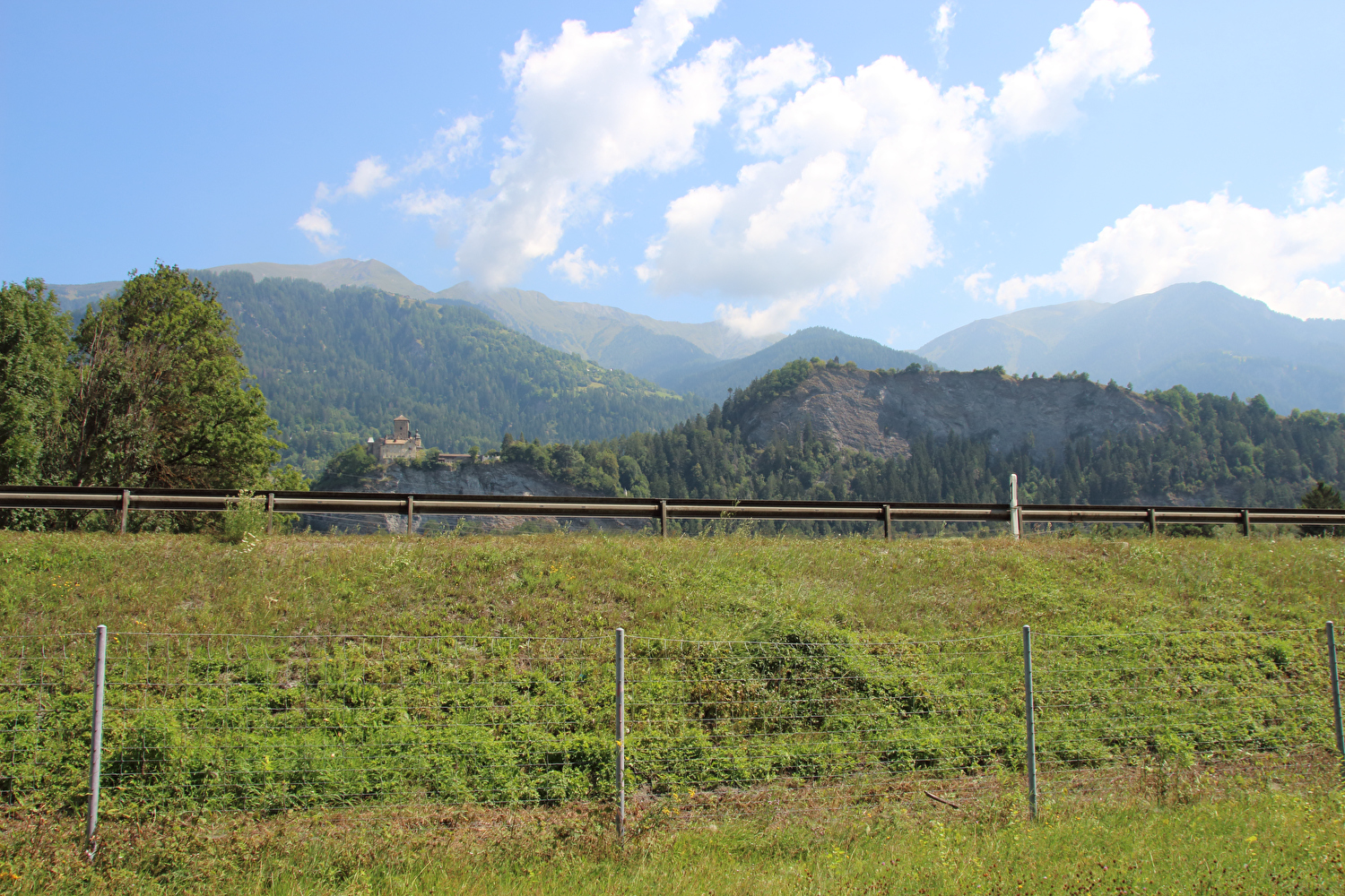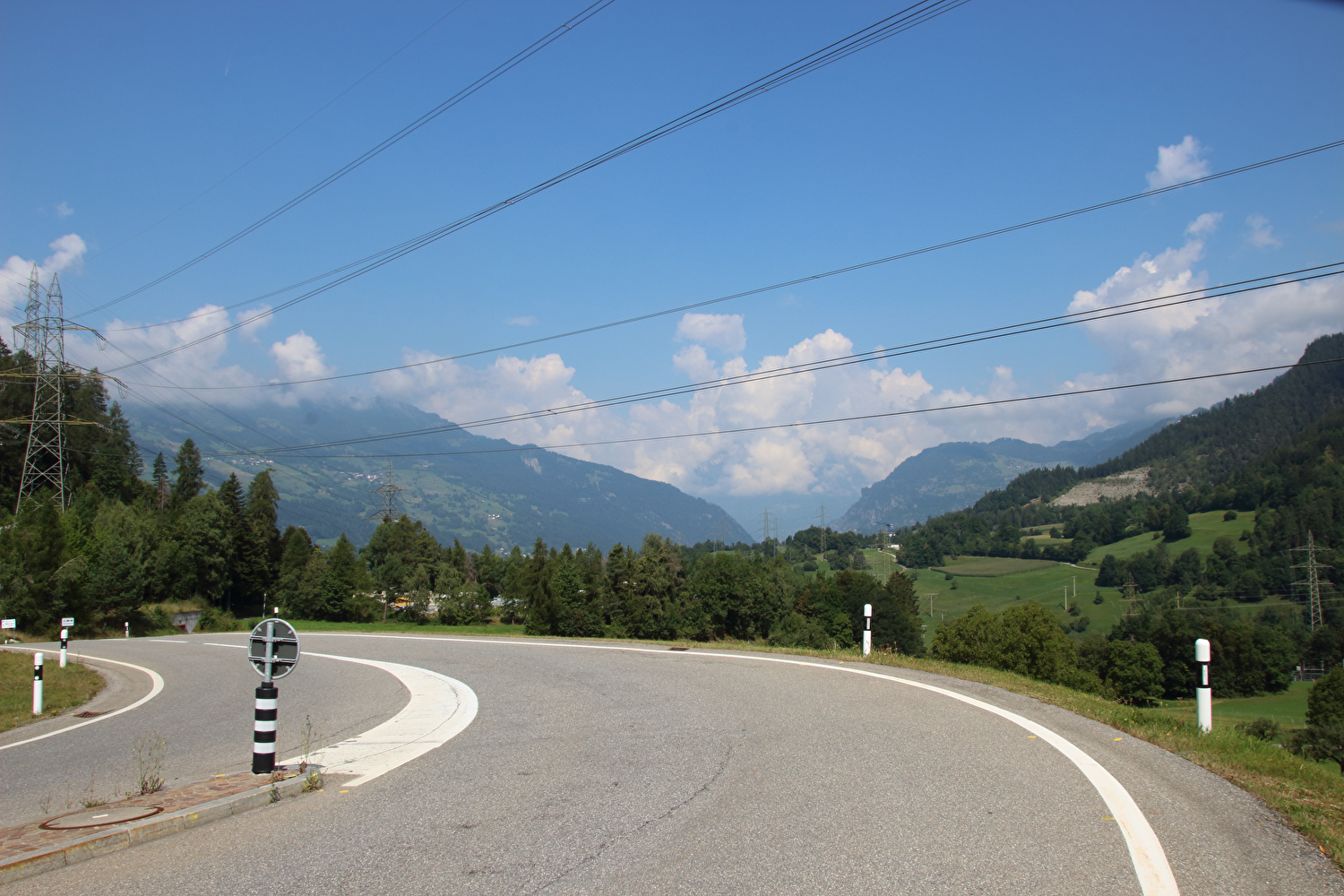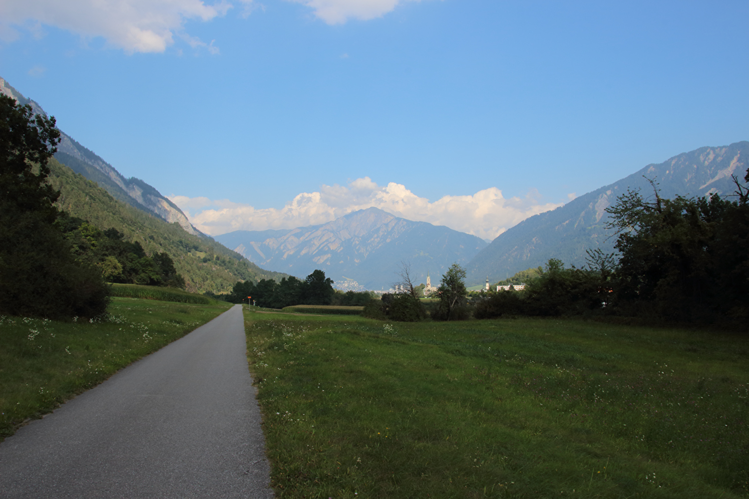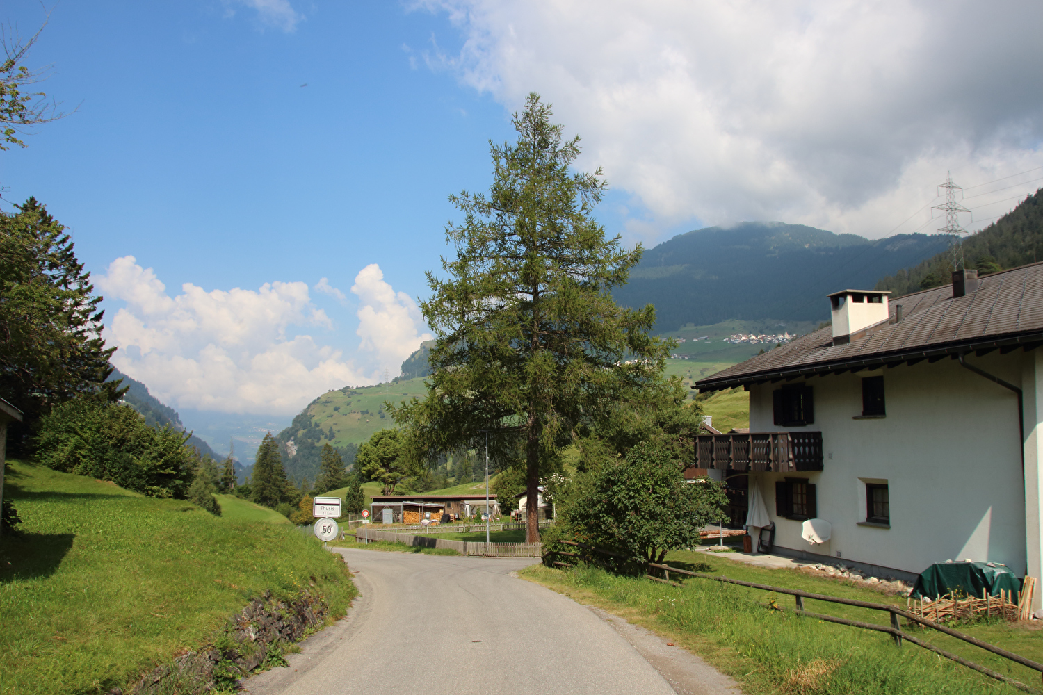 Sonne, Sonne, nichts als Sonne, und dazu wurde es in der tiefen Lage auch recht warm. In der Sonne wurden rasch mehr als +30 °C erreicht. Im Schatten machte sich jedoch die mit dem neuen Hoch eingeflossene kühlere Luftmasse bemerkbar. In der Schinschlucht sowieso und dann auch im Hinterrheintal gab es passend zur Mittagszeit reichlich Schatten. Somit geriet diese letzte Etappe nicht zu einer Hitzeetappe. Davon hatte es bei dieser Tour schon mehr als genug gegeben. Vom Profil her war diese Etappe eine Mittelgebirgsetappe, die auch in entsprechenden Höhenlagen verlief. Das „Dach der Etappe“ in Alvaschein lag gerade so eben über 1000 m ü. M., für eine Etappe in den Alpen also sehr niedrig. In Tiefencastel wurde auf die Veloroute 6 „Graubünden-Route“ aufgefahren.