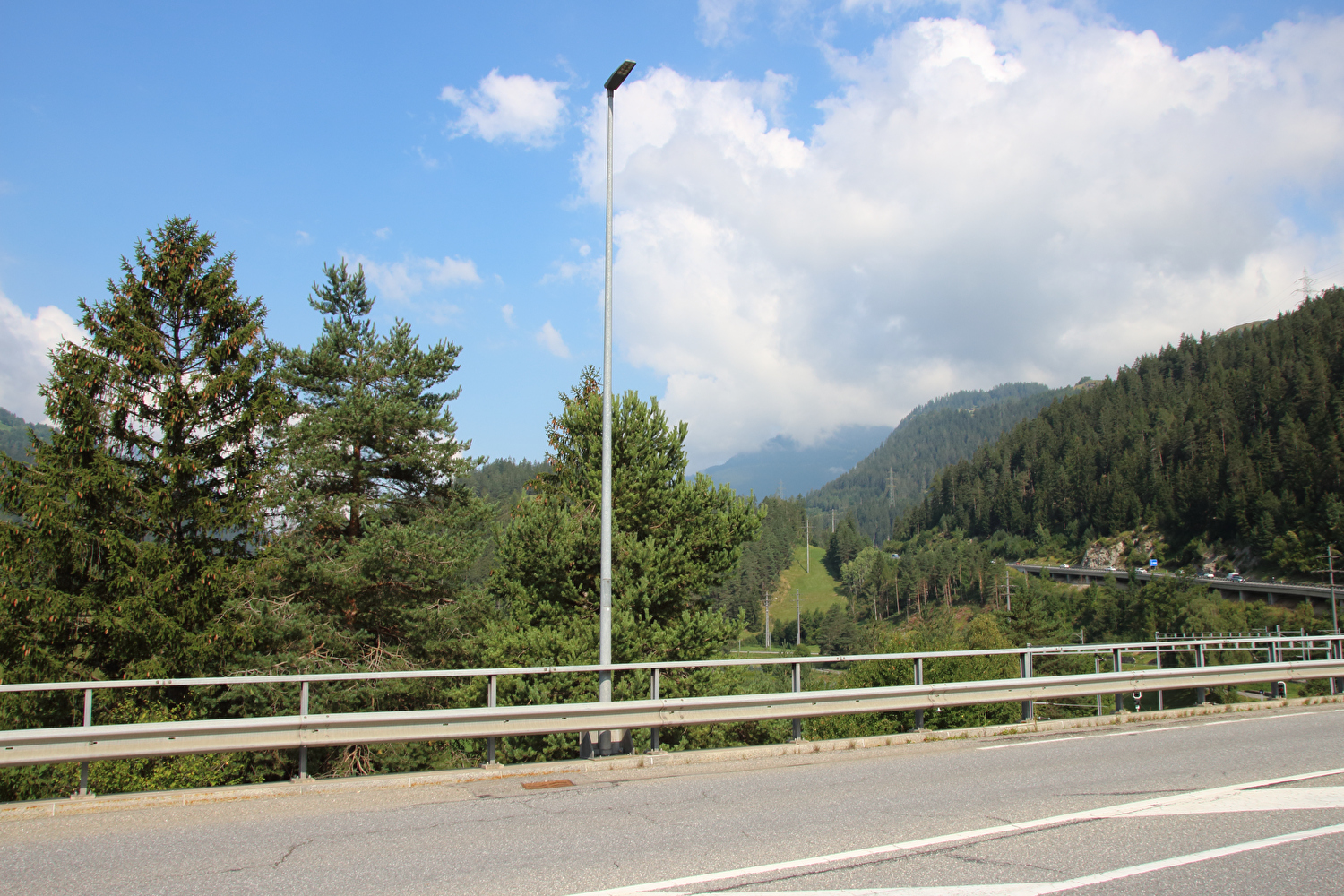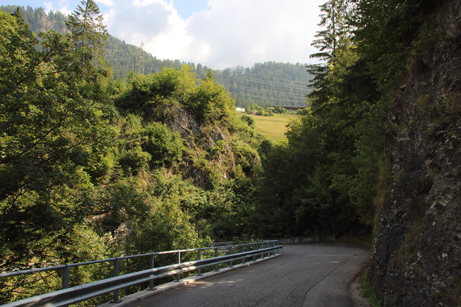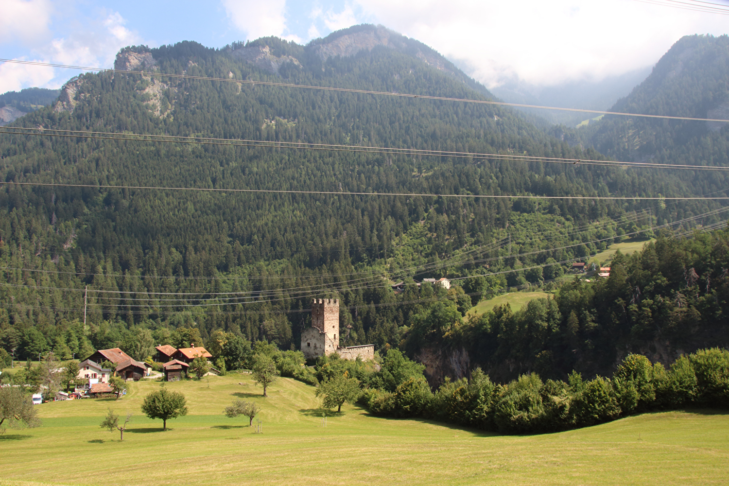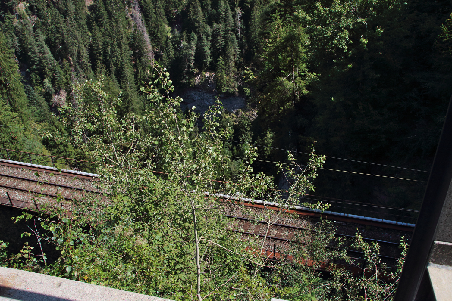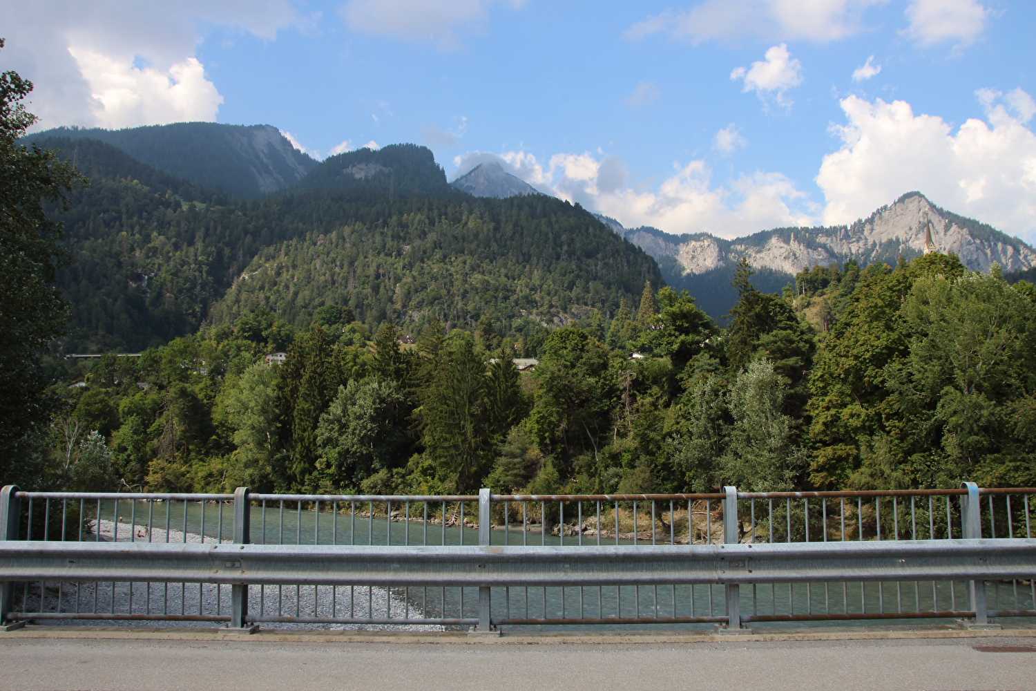 Sonne, Sonne, nichts als Sonne, und dazu wurde es in der tiefen Lage auch recht warm. In der Sonne wurden rasch mehr als +30 °C erreicht. Im Schatten machte sich jedoch die mit dem neuen Hoch eingeflossene kühlere Luftmasse bemerkbar. In der Schinschlucht sowieso und dann auch im Hinterrheintal gab es passend zur Mittagszeit reichlich Schatten. Somit geriet diese letzte Etappe nicht zu einer Hitzeetappe. Davon hatte es bei dieser Tour schon mehr als genug gegeben. Vom Profil her war diese Etappe eine Mittelgebirgsetappe, die auch in entsprechenden Höhenlagen verlief. Das „Dach der Etappe“ in Alvaschein lag gerade so eben über 1000 m ü. M., für eine Etappe in den Alpen also sehr niedrig. In Tiefencastel wurde auf die Veloroute 6 „Graubünden-Route“ aufgefahren.