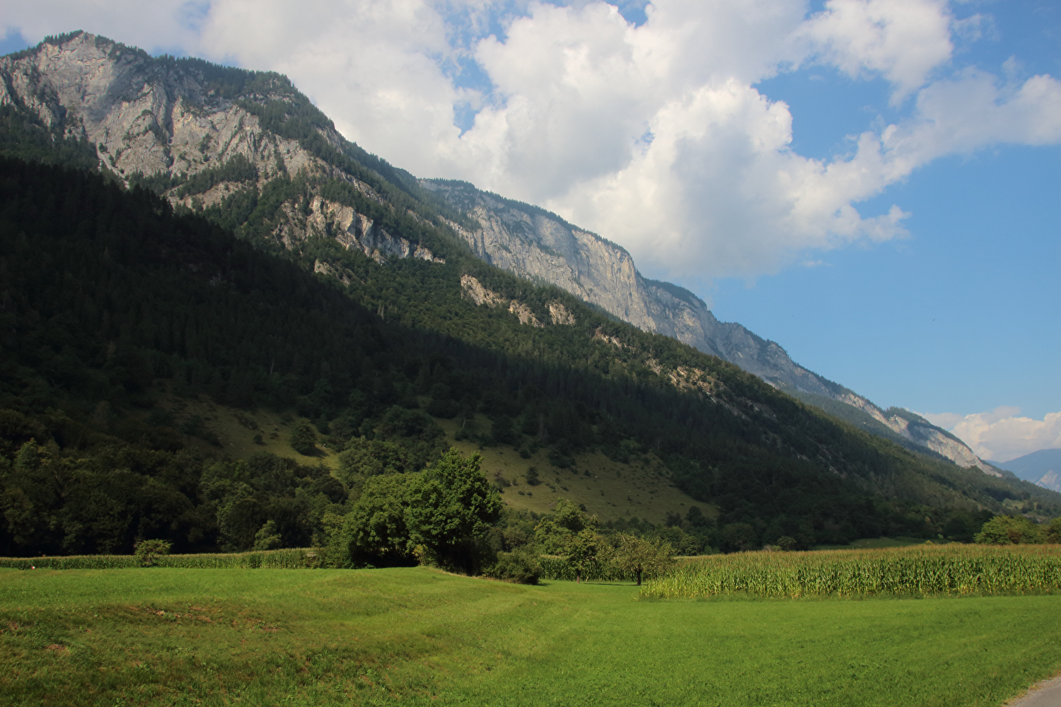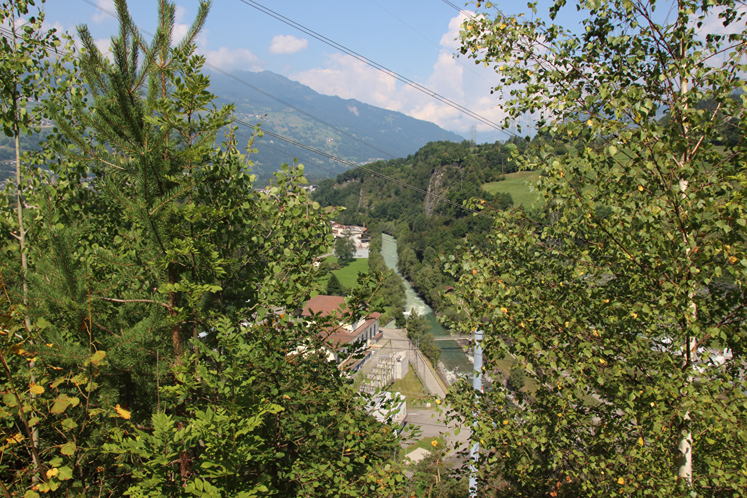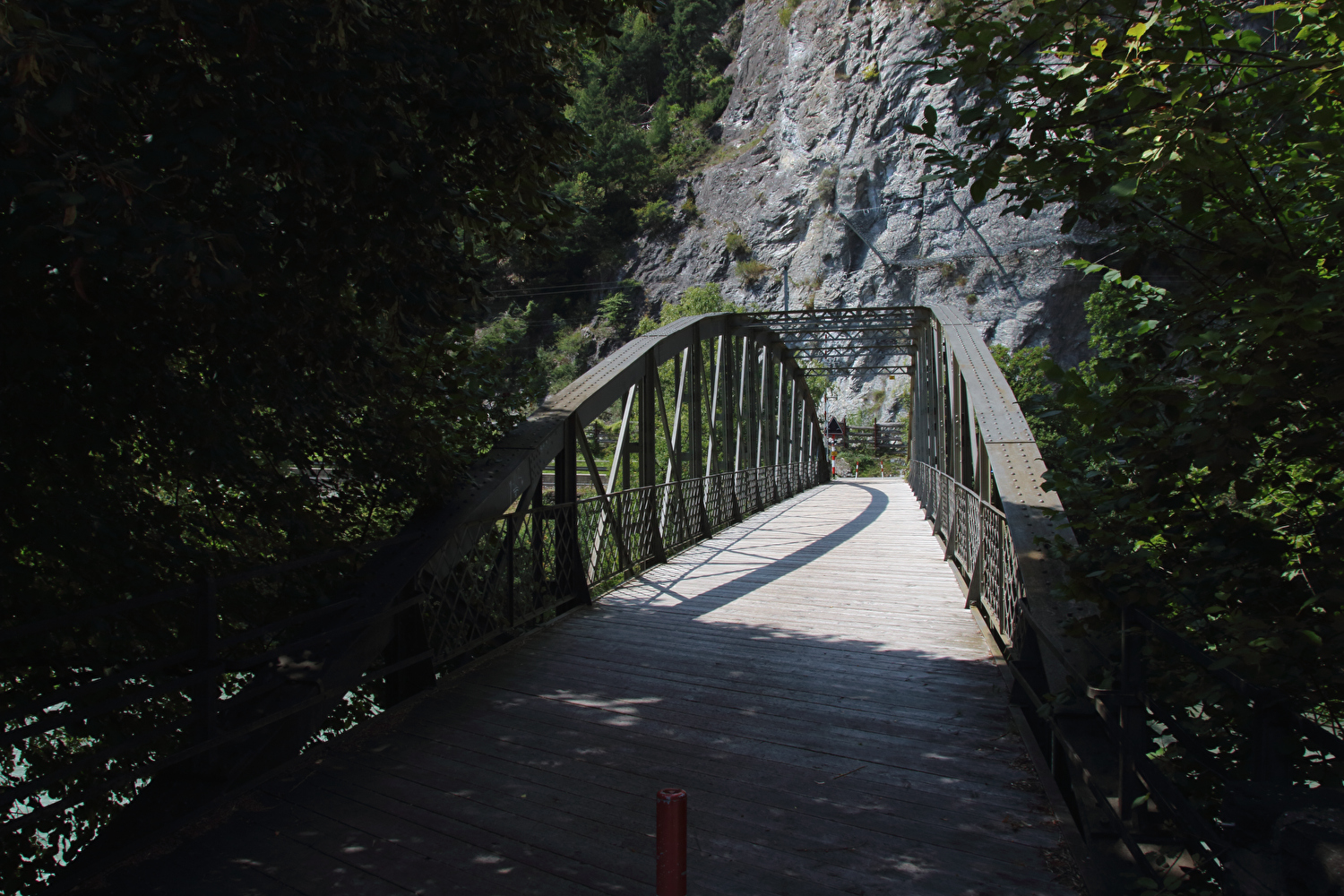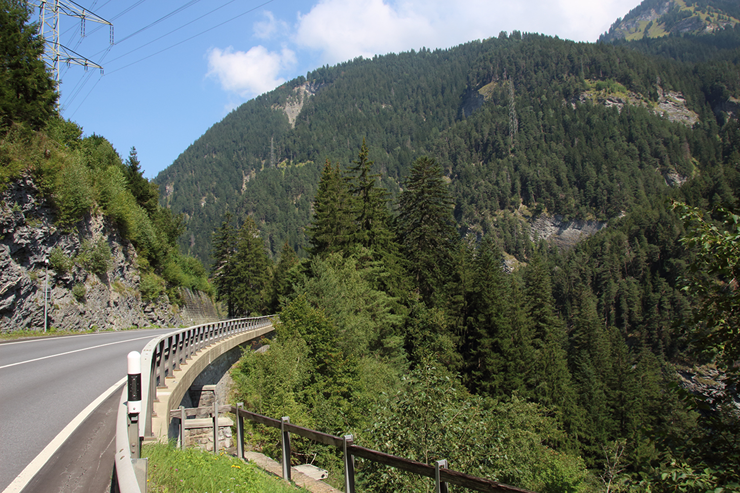 Sonne, Sonne, nichts als Sonne, und dazu wurde es in der tiefen Lage auch recht warm. In der Sonne wurden rasch mehr als +30 °C erreicht. Im Schatten machte sich jedoch die mit dem neuen Hoch eingeflossene kühlere Luftmasse bemerkbar. In der Schinschlucht sowieso und dann auch im Hinterrheintal gab es passend zur Mittagszeit reichlich Schatten. Somit geriet diese letzte Etappe nicht zu einer Hitzeetappe. Davon hatte es bei dieser Tour schon mehr als genug gegeben. Vom Profil her war diese Etappe eine Mittelgebirgsetappe, die auch in entsprechenden Höhenlagen verlief. Das „Dach der Etappe“ in Alvaschein lag gerade so eben über 1000 m ü. M., für eine Etappe in den Alpen also sehr niedrig. In Tiefencastel wurde auf die Veloroute 6 „Graubünden-Route“ aufgefahren.