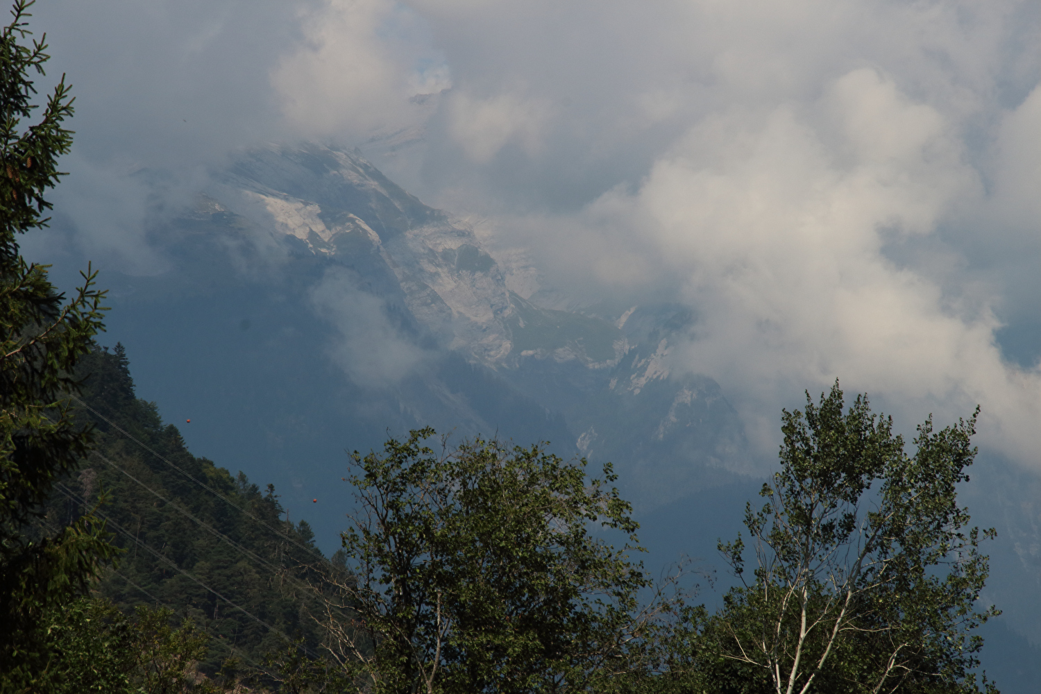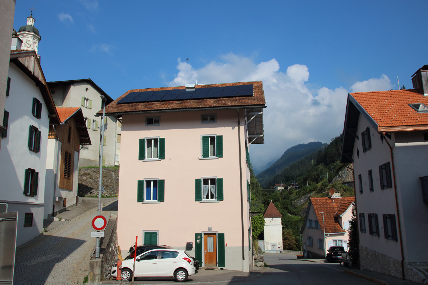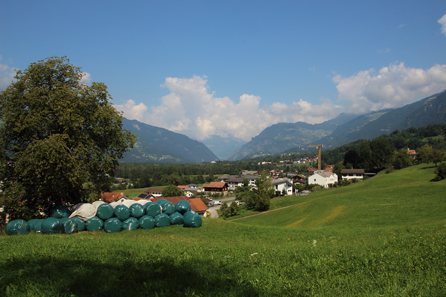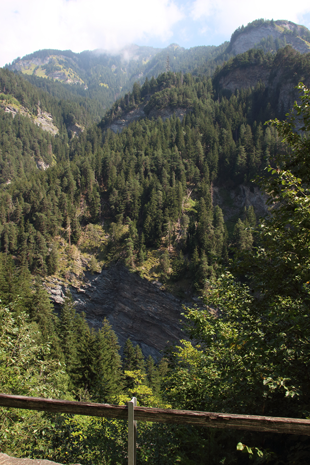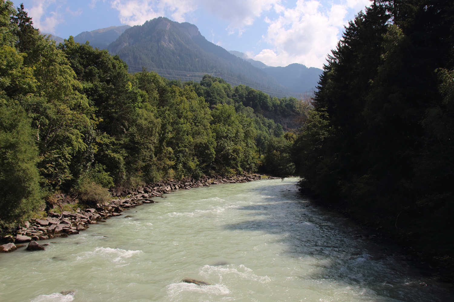 Sonne, Sonne, nichts als Sonne, und dazu wurde es in der tiefen Lage auch recht warm. In der Sonne wurden rasch mehr als +30 °C erreicht. Im Schatten machte sich jedoch die mit dem neuen Hoch eingeflossene kühlere Luftmasse bemerkbar. In der Schinschlucht sowieso und dann auch im Hinterrheintal gab es passend zur Mittagszeit reichlich Schatten. Somit geriet diese letzte Etappe nicht zu einer Hitzeetappe. Davon hatte es bei dieser Tour schon mehr als genug gegeben. Vom Profil her war diese Etappe eine Mittelgebirgsetappe, die auch in entsprechenden Höhenlagen verlief. Das „Dach der Etappe“ in Alvaschein lag gerade so eben über 1000 m ü. M., für eine Etappe in den Alpen also sehr niedrig. In Tiefencastel wurde auf die Veloroute 6 „Graubünden-Route“ aufgefahren.