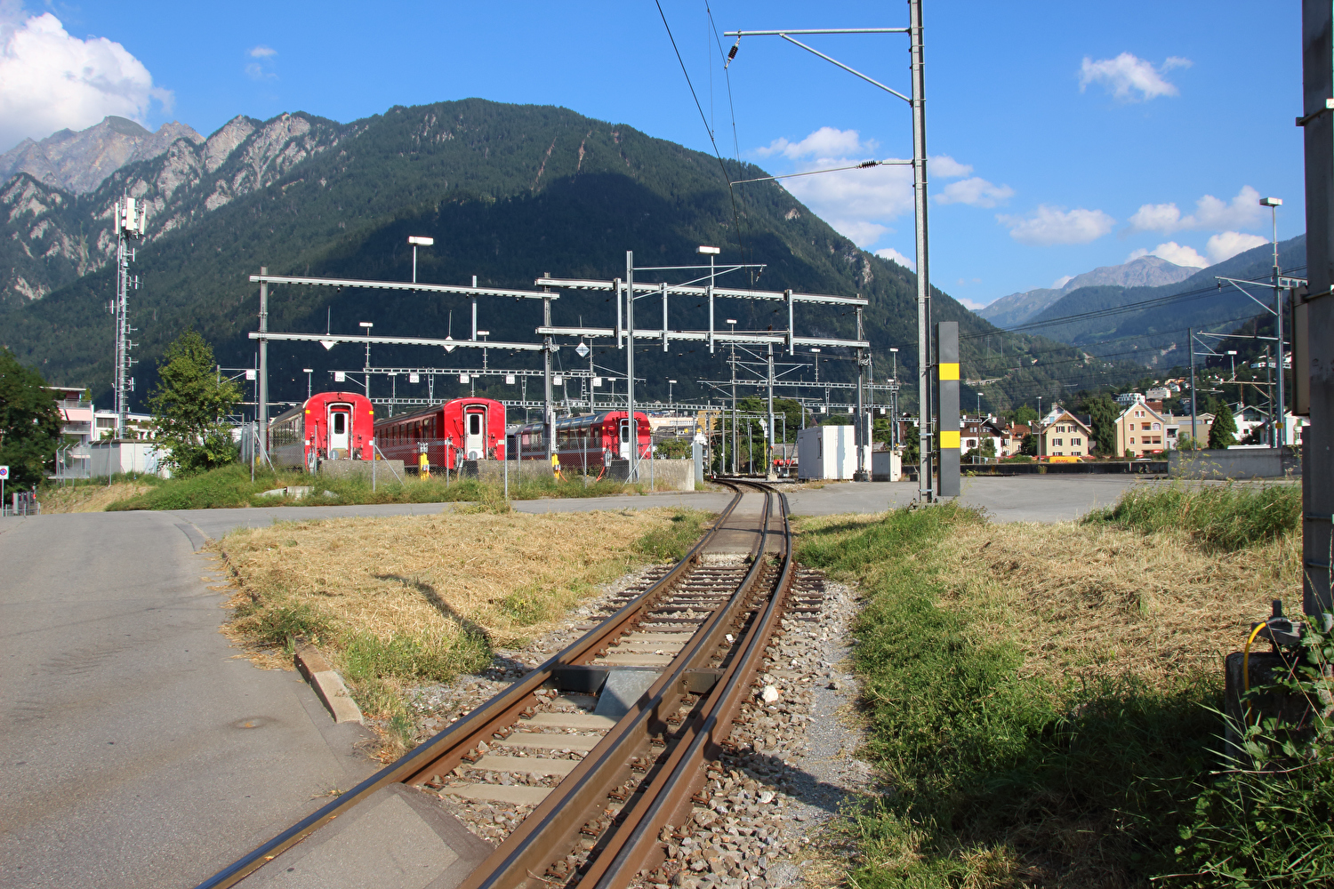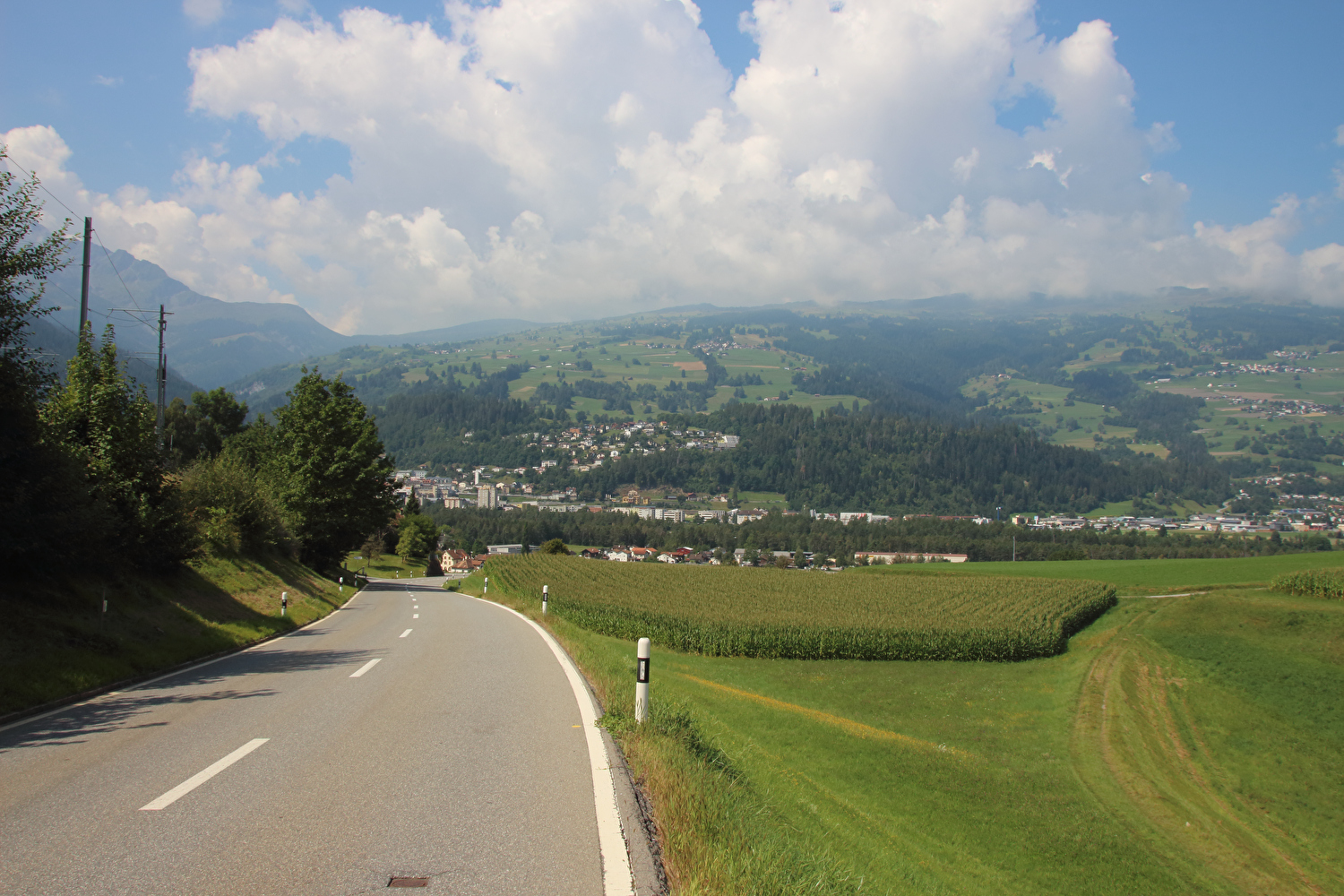 Nach dem letzten kurzen aber knackigen Anstieg dieser Tour folgte ab Tamins eine langgezogene Abfahrt bis Felsberg. Dort erfolgte die letzte Rheinüberquerung der Tour. In Chur wurde zunächst der Bahnhof angefahren. Dort hatte sogar am Sonntag ein Lebensmittelladen geöffnet, in dem Proviant für die Rückreise ergänzt wurde.