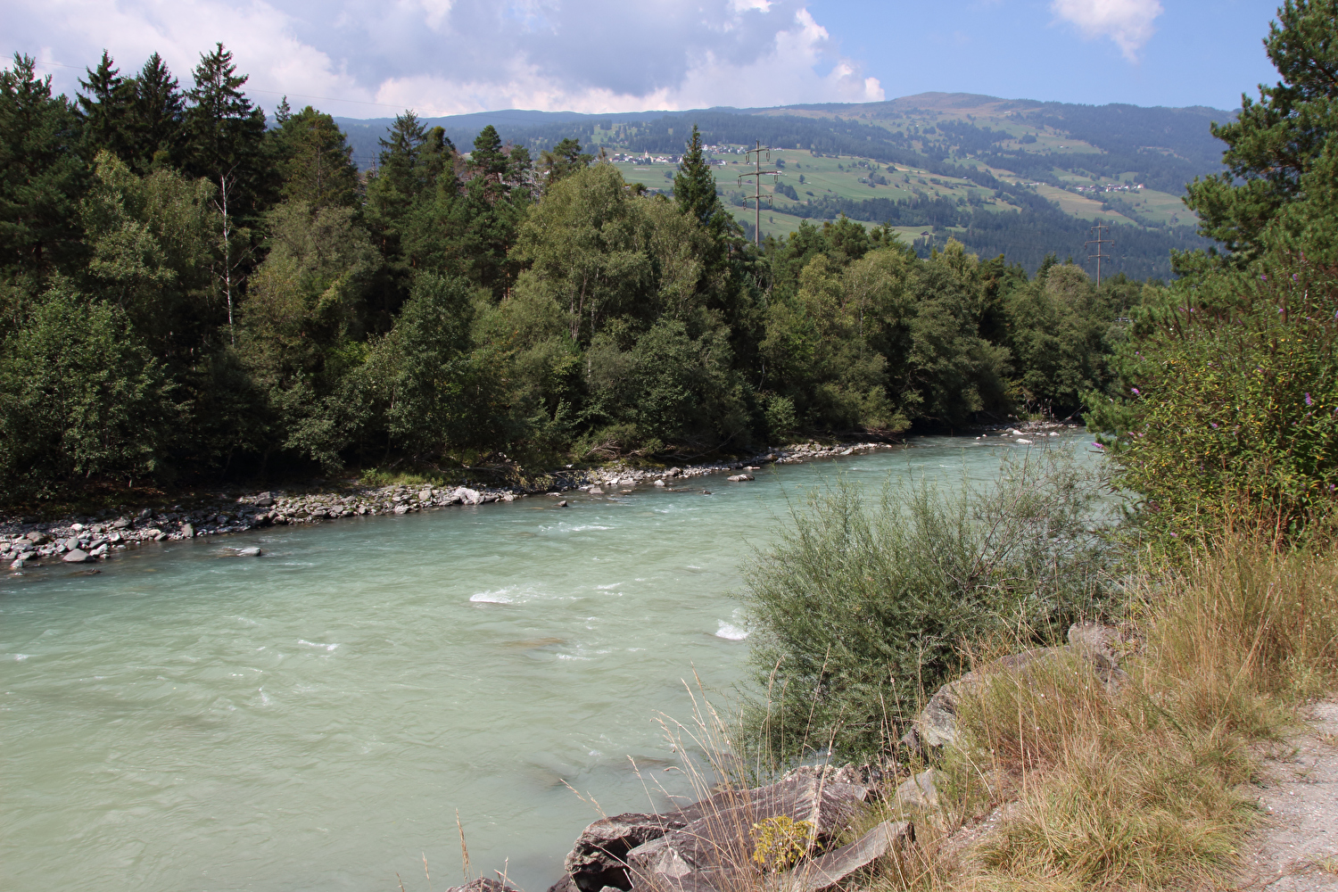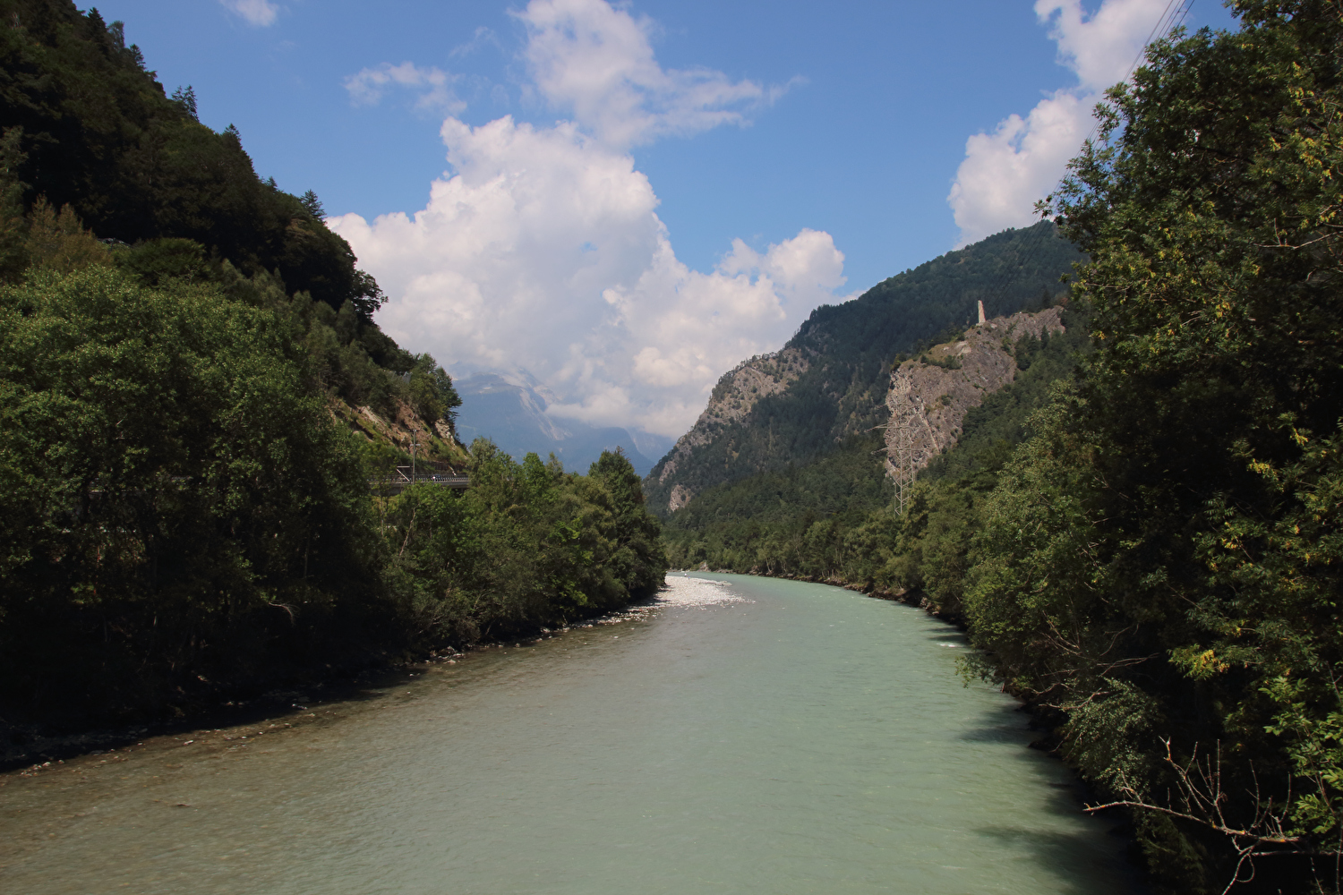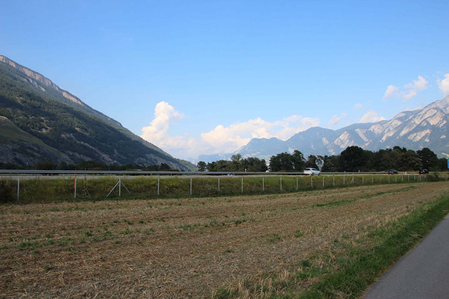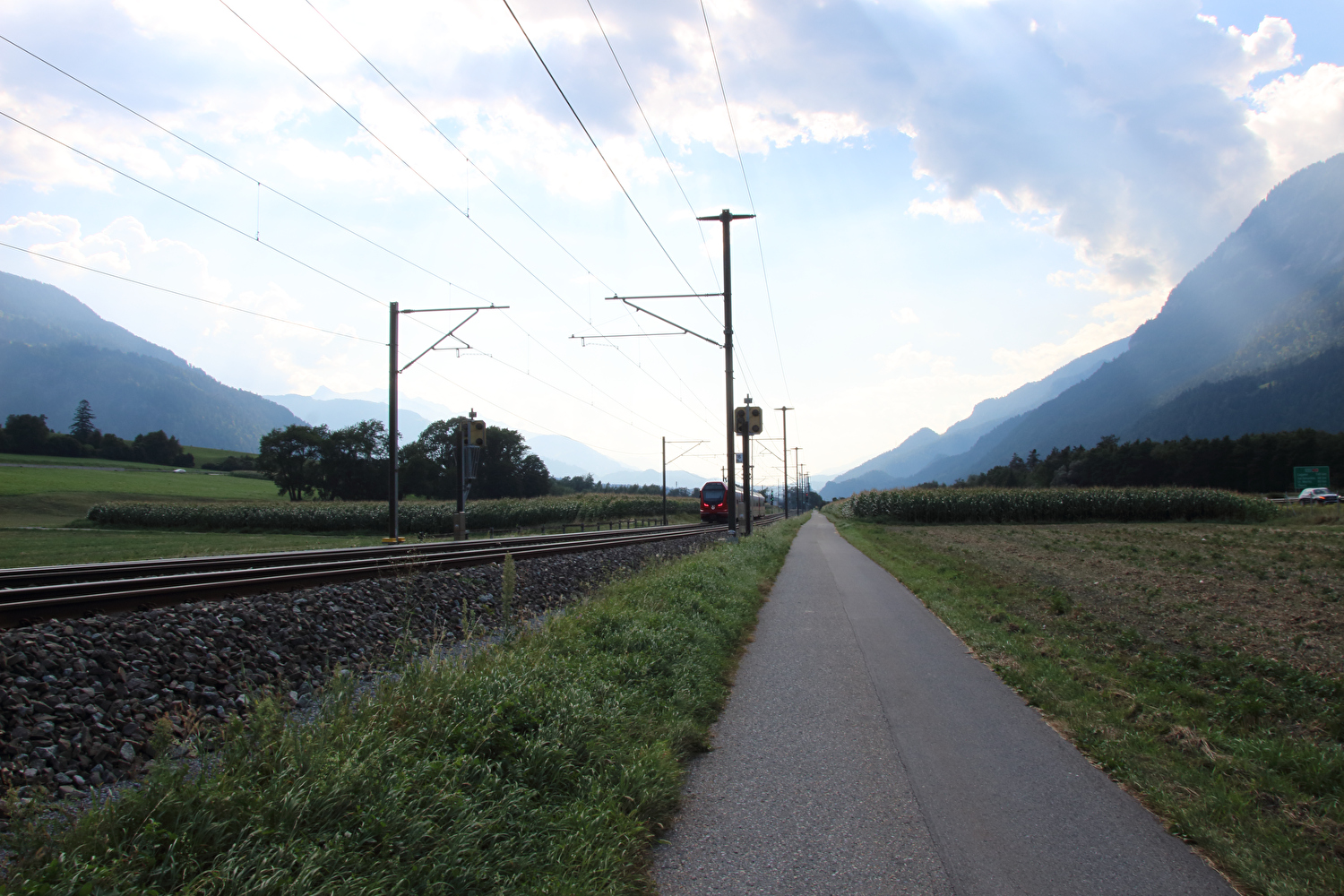 Bei Sils im Domleschg endete die Radwegbeschilderung am Hinterrhein. Die mitgeführte Karte (Landeskarte der Schweiz 1:100000), die im Hochgebirge gut funktioniert, half hier auch nicht weiter, da darin keine Schweizer Velorouten oder sonstige Radwege ausgewiesen sind. Da so weit unten auch kein nennenswerter Fahrradverkehr herrschte, der auf den Verlauf der Veloroute 6 hätte hinweisen können, fiel die Wahl auf einen Weg entlang des Hinterrhein flussabwärts, da diese Fahrtrichtung notwendigerweise ins Alpenrheintal führen würde. Dieser Weg ist größtenteils eine Schotterpiste und führt teilweise hochromantisch zwischen Hinterrhein und Autobahn (in Sicht-, Hör- und Riechweite). Dafür fuhren auf dem Weg keine Kraftfahrzeuge. Der Weg führt teilweise durch Wald, was gerade in der Mittagszeit eine Fahrt in der prallen Sonne ersparte. Außerdem führt der Weg über die unterste Albulabrücke, also die letzte Brücke über die Albula vor deren Mündung in den Hinterrhein, und wenig später auch an die Mündung der Albula in den Hinterrhein. Entlang des Weges fanden sich nur Wander- und Mountainbike-Wegweiser, womit klar wurde, dass auf diesem Weg nicht die Veloroute 6 verlief. Bei Rothenbrunnen standen an der Dorfstrasse-Brücke wieder Fahrradwegweiser und der Hinweis auf eine längerfristige Wegsperrung bei Ravetg, weshalb die Veloroute 6 über die Dorfstrasse-Brücke auf die Westseite des Hinterrhein umgeleitet wird. Da das Thema Mittagessen aber deutlich in der Vordergrund rückte, wurde erst mal auf die Straße nach Rhäzüns aufgefahren, wo ein Restaurant gerade noch vor Küchenschluss um 14:00 Uhr erreicht wurde. Nach dem Mittagessen wurde zunächst auf der Straße bis Bonaduz gefahren. Dort fand sich zwar eine Auffahrt auf die Veloroute 2 „Rhein-Route“, die aber sichtbar durch sehr welliges Gelände führt, während die Straße nach Reichenau deutlich flacher verläuft. Daher wurde zunächst auf der Straße weiter gefahren und erst kurz vor Reichenau auf die asphaltierte Veloroute 2 gewechselt, die dann bis Chur nicht mehr verlassen wurde.