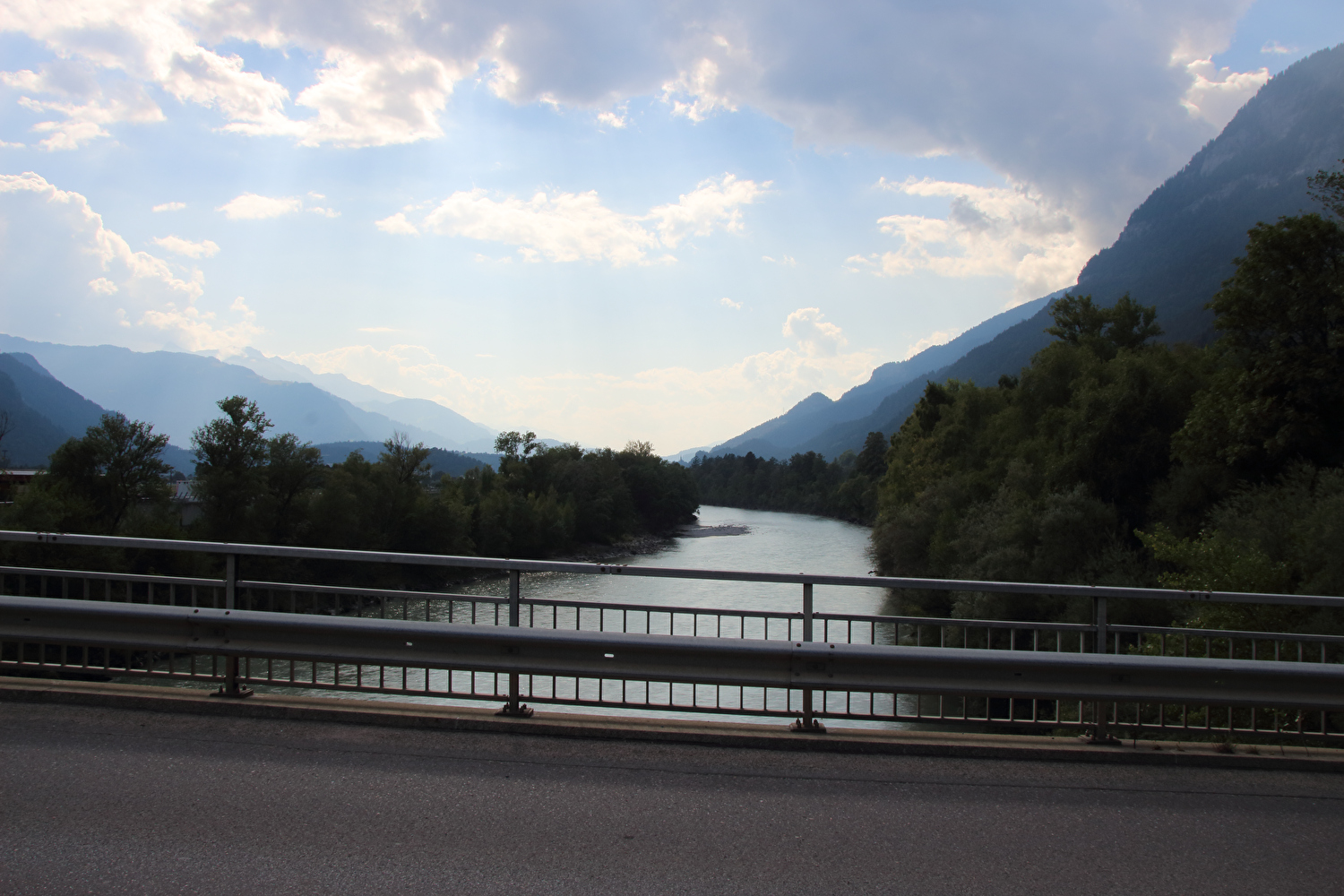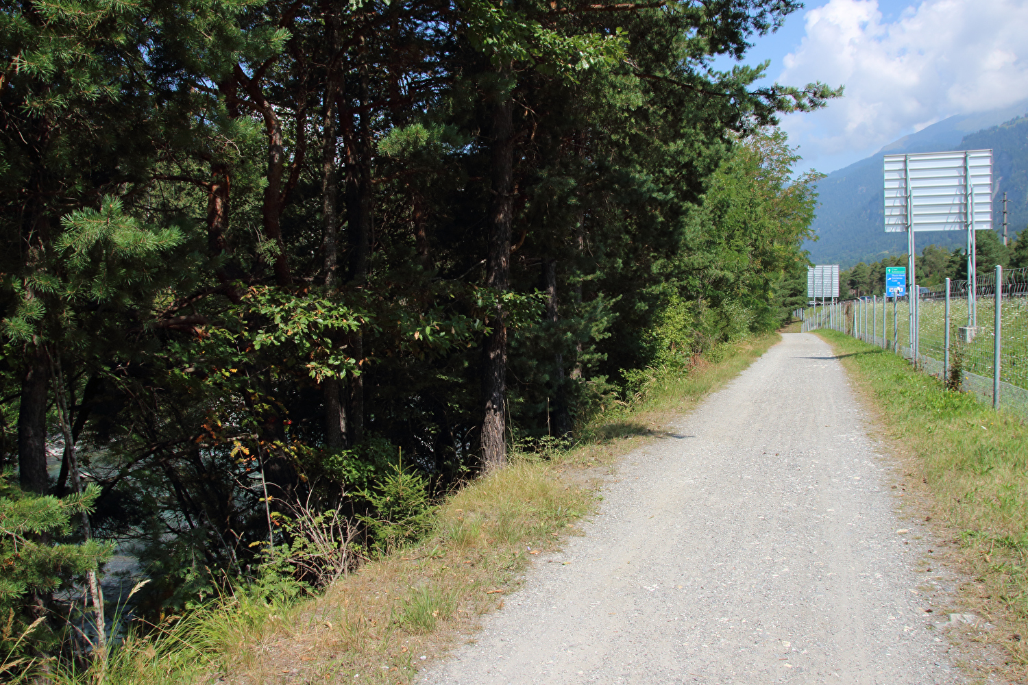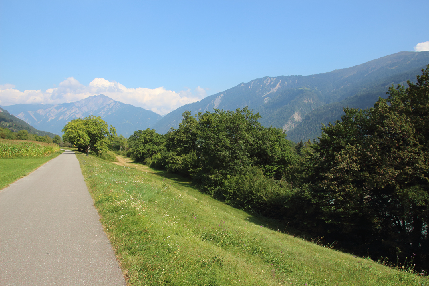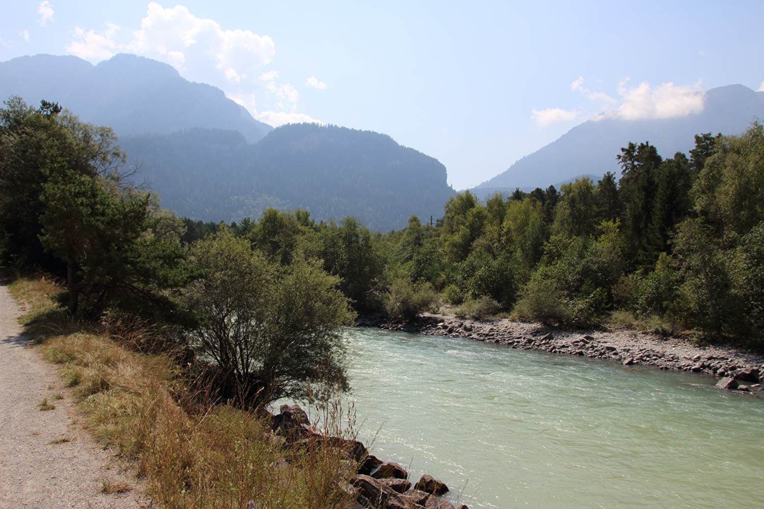 Bei Sils im Domleschg endete die Radwegbeschilderung am Hinterrhein. Die mitgeführte Karte (Landeskarte der Schweiz 1:100000), die im Hochgebirge gut funktioniert, half hier auch nicht weiter, da darin keine Schweizer Velorouten oder sonstige Radwege ausgewiesen sind. Da so weit unten auch kein nennenswerter Fahrradverkehr herrschte, der auf den Verlauf der Veloroute 6 hätte hinweisen können, fiel die Wahl auf einen Weg entlang des Hinterrhein flussabwärts, da diese Fahrtrichtung notwendigerweise ins Alpenrheintal führen würde. Dieser Weg ist größtenteils eine Schotterpiste und führt teilweise hochromantisch zwischen Hinterrhein und Autobahn (in Sicht-, Hör- und Riechweite). Dafür fuhren auf dem Weg keine Kraftfahrzeuge. Der Weg führt teilweise durch Wald, was gerade in der Mittagszeit eine Fahrt in der prallen Sonne ersparte. Außerdem führt der Weg über die unterste Albulabrücke, also die letzte Brücke über die Albula vor deren Mündung in den Hinterrhein, und wenig später auch an die Mündung der Albula in den Hinterrhein. Entlang des Weges fanden sich nur Wander- und Mountainbike-Wegweiser, womit klar wurde, dass auf diesem Weg nicht die Veloroute 6 verlief. Bei Rothenbrunnen standen an der Dorfstrasse-Brücke wieder Fahrradwegweiser und der Hinweis auf eine längerfristige Wegsperrung bei Ravetg, weshalb die Veloroute 6 über die Dorfstrasse-Brücke auf die Westseite des Hinterrhein umgeleitet wird. Da das Thema Mittagessen aber deutlich in der Vordergrund rückte, wurde erst mal auf die Straße nach Rhäzüns aufgefahren, wo ein Restaurant gerade noch vor Küchenschluss um 14:00 Uhr erreicht wurde. Nach dem Mittagessen wurde zunächst auf der Straße bis Bonaduz gefahren. Dort fand sich zwar eine Auffahrt auf die Veloroute 2 „Rhein-Route“, die aber sichtbar durch sehr welliges Gelände führt, während die Straße nach Reichenau deutlich flacher verläuft. Daher wurde zunächst auf der Straße weiter gefahren und erst kurz vor Reichenau auf die asphaltierte Veloroute 2 gewechselt, die dann bis Chur nicht mehr verlassen wurde.