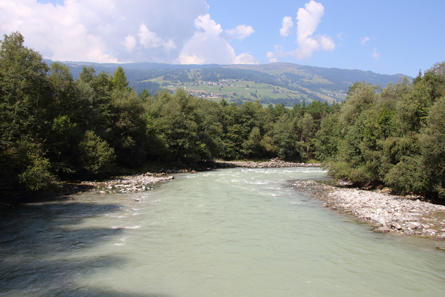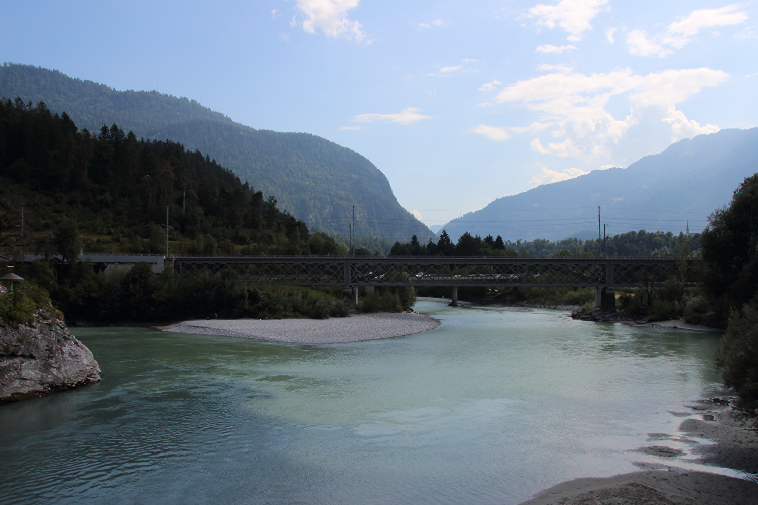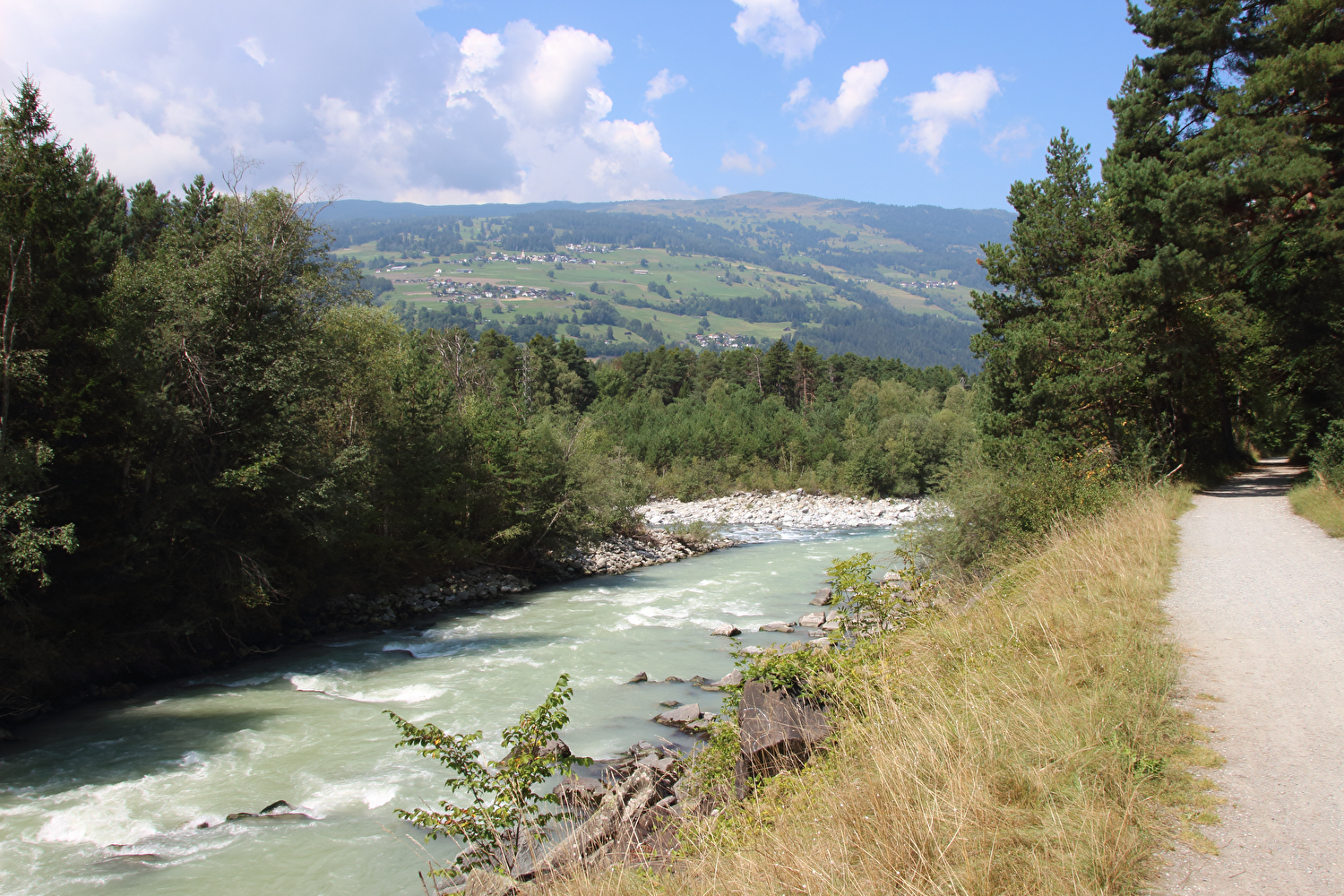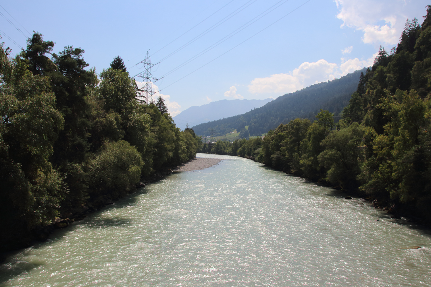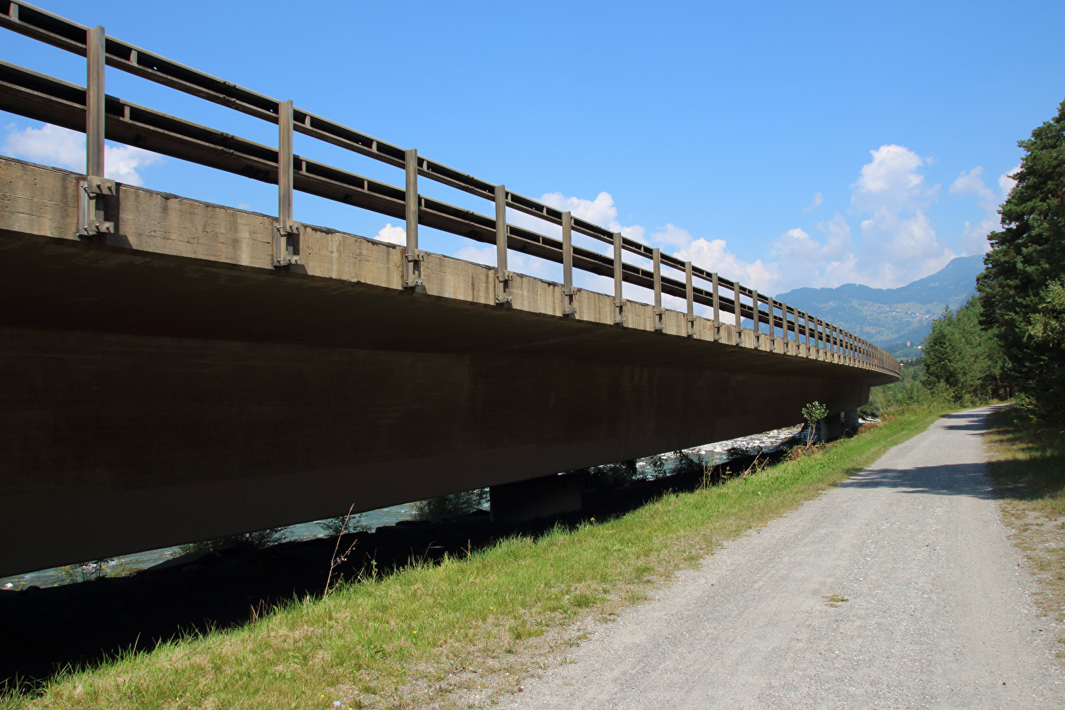 Bei Sils im Domleschg endete die Radwegbeschilderung am Hinterrhein. Die mitgeführte Karte (Landeskarte der Schweiz 1:100000), die im Hochgebirge gut funktioniert, half hier auch nicht weiter, da darin keine Schweizer Velorouten oder sonstige Radwege ausgewiesen sind. Da so weit unten auch kein nennenswerter Fahrradverkehr herrschte, der auf den Verlauf der Veloroute 6 hätte hinweisen können, fiel die Wahl auf einen Weg entlang des Hinterrhein flussabwärts, da diese Fahrtrichtung notwendigerweise ins Alpenrheintal führen würde. Dieser Weg ist größtenteils eine Schotterpiste und führt teilweise hochromantisch zwischen Hinterrhein und Autobahn (in Sicht-, Hör- und Riechweite). Dafür fuhren auf dem Weg keine Kraftfahrzeuge. Der Weg führt teilweise durch Wald, was gerade in der Mittagszeit eine Fahrt in der prallen Sonne ersparte. Außerdem führt der Weg über die unterste Albulabrücke, also die letzte Brücke über die Albula vor deren Mündung in den Hinterrhein, und wenig später auch an die Mündung der Albula in den Hinterrhein. Entlang des Weges fanden sich nur Wander- und Mountainbike-Wegweiser, womit klar wurde, dass auf diesem Weg nicht die Veloroute 6 verlief. Bei Rothenbrunnen standen an der Dorfstrasse-Brücke wieder Fahrradwegweiser und der Hinweis auf eine längerfristige Wegsperrung bei Ravetg, weshalb die Veloroute 6 über die Dorfstrasse-Brücke auf die Westseite des Hinterrhein umgeleitet wird. Da das Thema Mittagessen aber deutlich in der Vordergrund rückte, wurde erst mal auf die Straße nach Rhäzüns aufgefahren, wo ein Restaurant gerade noch vor Küchenschluss um 14:00 Uhr erreicht wurde. Nach dem Mittagessen wurde zunächst auf der Straße bis Bonaduz gefahren. Dort fand sich zwar eine Auffahrt auf die Veloroute 2 „Rhein-Route“, die aber sichtbar durch sehr welliges Gelände führt, während die Straße nach Reichenau deutlich flacher verläuft. Daher wurde zunächst auf der Straße weiter gefahren und erst kurz vor Reichenau auf die asphaltierte Veloroute 2 gewechselt, die dann bis Chur nicht mehr verlassen wurde.