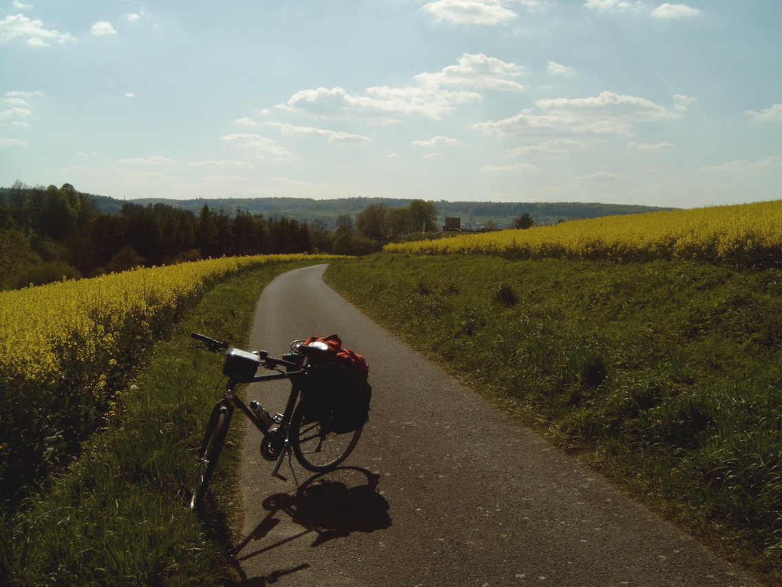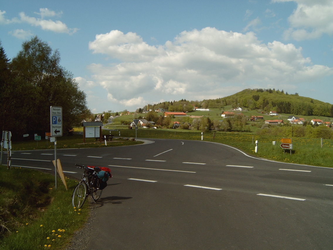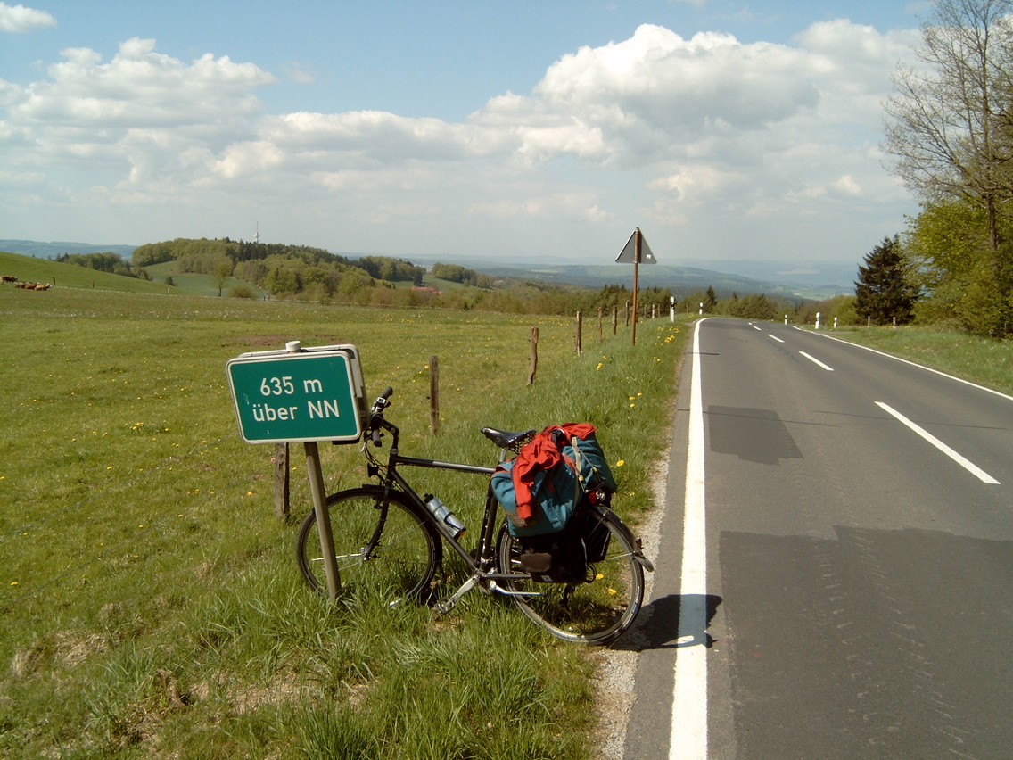 Beschreibung | Diese Etappe verlief quasi in zwei Teilen. Der erste, fahrtechnisch anspruchsvollere, aber landschaftlich interessantere Teil verlief durch die Rhön bis Fulda. Unmittelbar nach dem Dach der Etappe folgte eine extrem steile Abfahrt mit bis zu 17 % Gefälle auf einer schmalen, unübersichtlichen Straße mit teilweise marodem Belag im Wald. Nach einigen weiteren Wellen folgte die Abfahrt nach Fulda. Dort musste nach dem Mittagessen noch eine CF-Karte gekauft werden, da die CF-Karte in der Kamera sich langsam füllte. Das kostete, da ein Fotoladen in der Innenstadt aufgesucht wurde, natürlich Zeit und hätte auch billiger sein können. Dafür konnte die Karte vor dem Bezahlen in der Kamera ausprobiert werden. Nach der Fuldaquerung begann der zweite Teil dieser Etappe, der zwar fahrtechnisch weniger anspruchsvoll war, dafür aber auch durch weniger interessante Landschaften führte. Kurz vor dem Ziel drohte noch eine fiese Umleitung. Ein Einheimischer gab aber einen Tipp, wie man mit dem Fahrrad unter Benutzung eines Feldweges einigermaßen direkt zum Etappenziel gelangen konnte. |