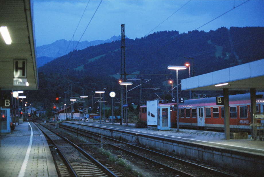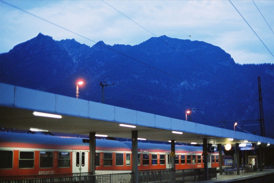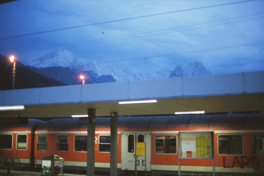Beschreibung | Ankunft gegen 21:00 MESZ nach 11 Stunden Bahn-Odyssee! In Hannover ging es noch halbwegs pünktlich los. Da der direkte Zug ausgebucht war, musste der nächste IC über Heidelberg genommen werden, was die Fahrzeit schon auf etwa 10 Stunden aufblähte. Und das alles nur, weil sich die Bahn nach wie vor weigert, Fahrräder in den ICEs mitzunehmen! In Heidelberg fiel dann der Anschlusszug (IC) nach München aus. Signalstörung! Die ICs fuhren Heidelberg nicht mehr an. Mit einem Bummelzug ging es Richtung Karlsruhe, also in die völlig falsche Richtung. In Bruchsal, einem Kaff mit IC-Halt vor Karlsruhe, gab es dann Anschluss an einen IC nach München-Pasing. Von dort fuhr dann ein Bummelzug mit extrem gammeligem Rollmaterial nach Garmisch-Partenkirchen. Allen bahnbedingten Widrigkeiten zum Trotz war das Auftauchen der Alpensilhouette am Südhorizont sehr beeindruckend. In Garmisch-Partenkirchen fing es während der Anfahrt zum Quartier noch leicht an zu dröppeln. |