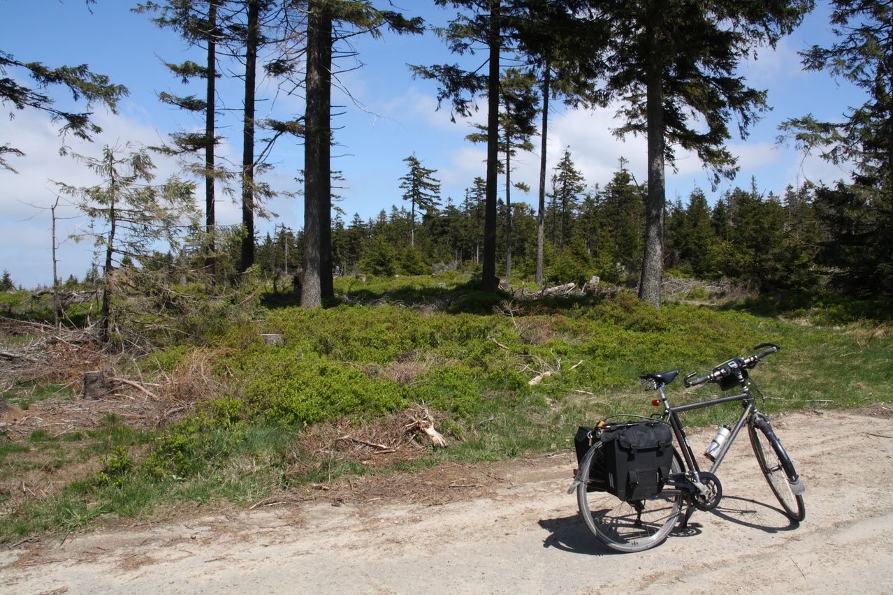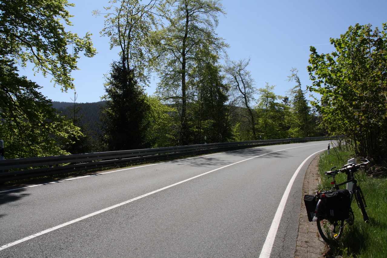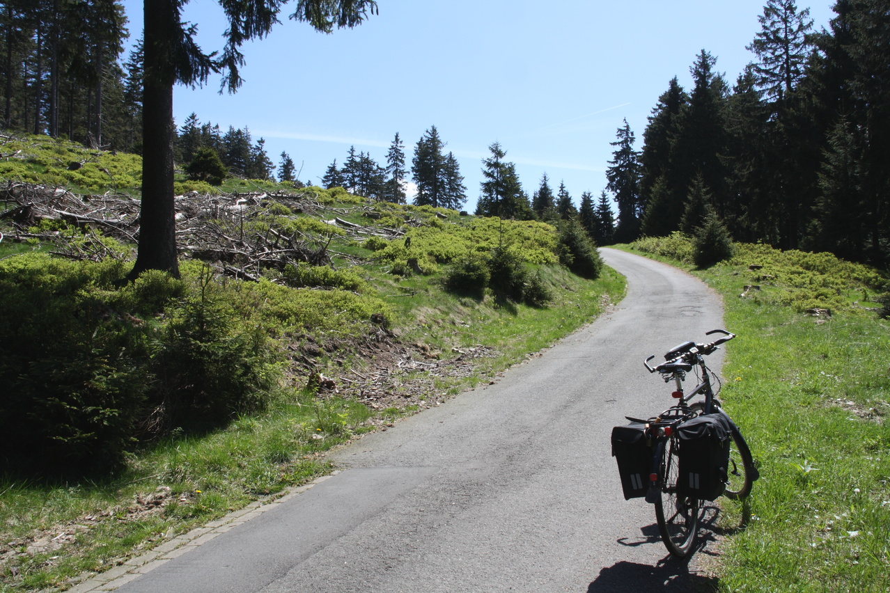 Beschreibung | Mal was Neues! Rauf auf Schalke! Aber nein, nicht zum Fußball in den Ruhrpott ging es, sondern auf den Berg Schalke im Westharz. Die Sonne brannte an diesem Tag recht heftig und ohne "Lichtschutzfaktor 50+" wäre da definitiv alles, was nicht durch Helm oder Klamotten bedeckt war, knallrot geworden. Wie auch am Vortag herrschte reger Zweiradverkehr im Harz. Bullen, Sanitöter und Abschlepper hatten reichlich damit zu tun, die Reste durchgeknallter Moppedfahrer und deren Maschinen von der Straße zu kratzen. Die B241 sollte man mit dem Fahrrad auch nur an Tagen mit LKW-Fahrverbot nutzen, sonst kann es eng werden! Dafür ist der moderate Anstieg ohne Steilstellen von Goslar zum Auerhahn sehr gut zu fahren (und macht auch in umgekehrter Richtung als Abfahrt viel Spaß). Ab Auerhahn ging es dann aber erst mal auf für Stinkeverkehr gesperrten Straßen und Wegen weiter. Der bis zu 12 % steile Anstieg vom Auerhahn zum Schalke ist asphaltiert, wobei der Belag streckenweise in schlechtem Zustand ist. Auf dem Schalke angekommen fiel plötzlich ein hundeartiges Tier auf. Da an der Schutzhütte mehrere Wanderer pausierten, lag die Vermutung nahe, dass da ein Köter ohne Leine rumlief. Bei näherem Hinsehen entpuppte sich das Tier aber als überaus neugieriger Rotfuchs. Da denkt man unweigerlich an Tollwut. Aber der Fuchs sah gesund aus, verhielt sich bis auf seine Neugier nicht auffällig und wahrte einen gewissen "Sicherheitsabstand". Die Beobachtung dieses Fuchses und die anschließende Besteigung des stählernen "Schalker Aussichtsturmes" (Baujahr 1892, Höhe 10,5 m) zogen den Aufenthalt "auf Schalke" etwas in die Länge. Wegen des starken Verkehrs wurde die B241 für die Abfahrt gemieden, der Schotterweg nach Hahnenklee ließ sich aber gut fahren. Ein brauchbares Foto von der Stabkirche in Hahnenklee zu bekommen gestaltete sich wegen der vielen Menschen in deren unmittelbarer Nähe und einer Veranstaltung neben der Kirche sehr schwierig. Im weiteren Verlauf der Abfahrt wurde es etwas frisch, aber Wetterphänomene wie am Vortag blieben aus. In Langelsheim am nördlichen Harzrand war es auffallend wärmer als im Harz selbst. Gegen eine Verlängerung der Tour außerhalb des Harzes sprach vor allem die mitgeführte Karte, die nicht mehr viel vom nördlichen Harzvorland zeigt. |