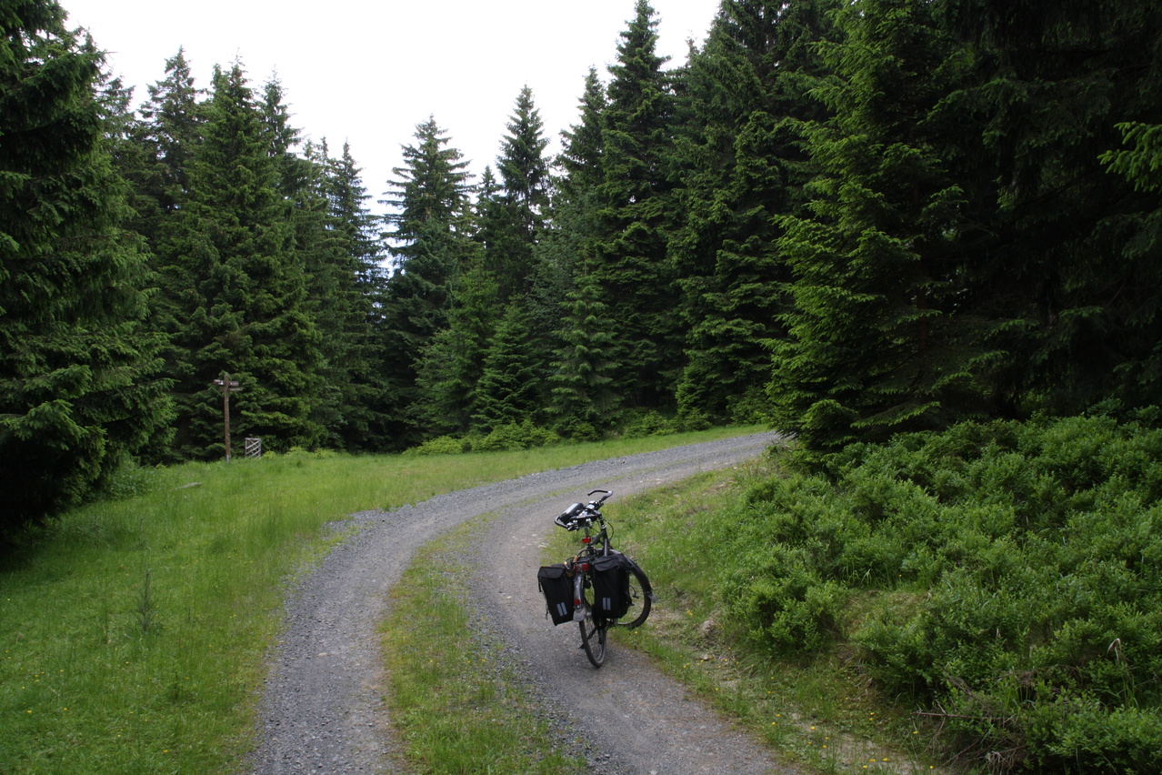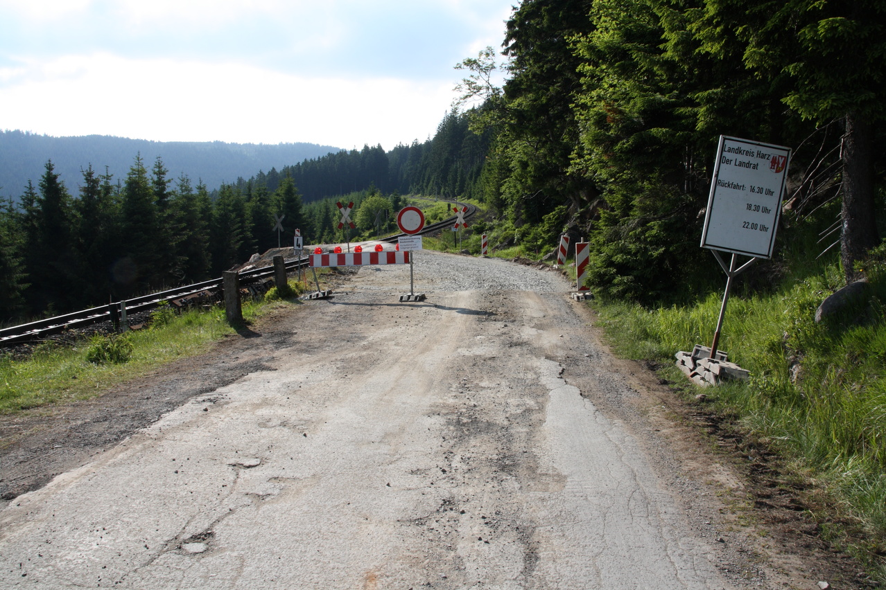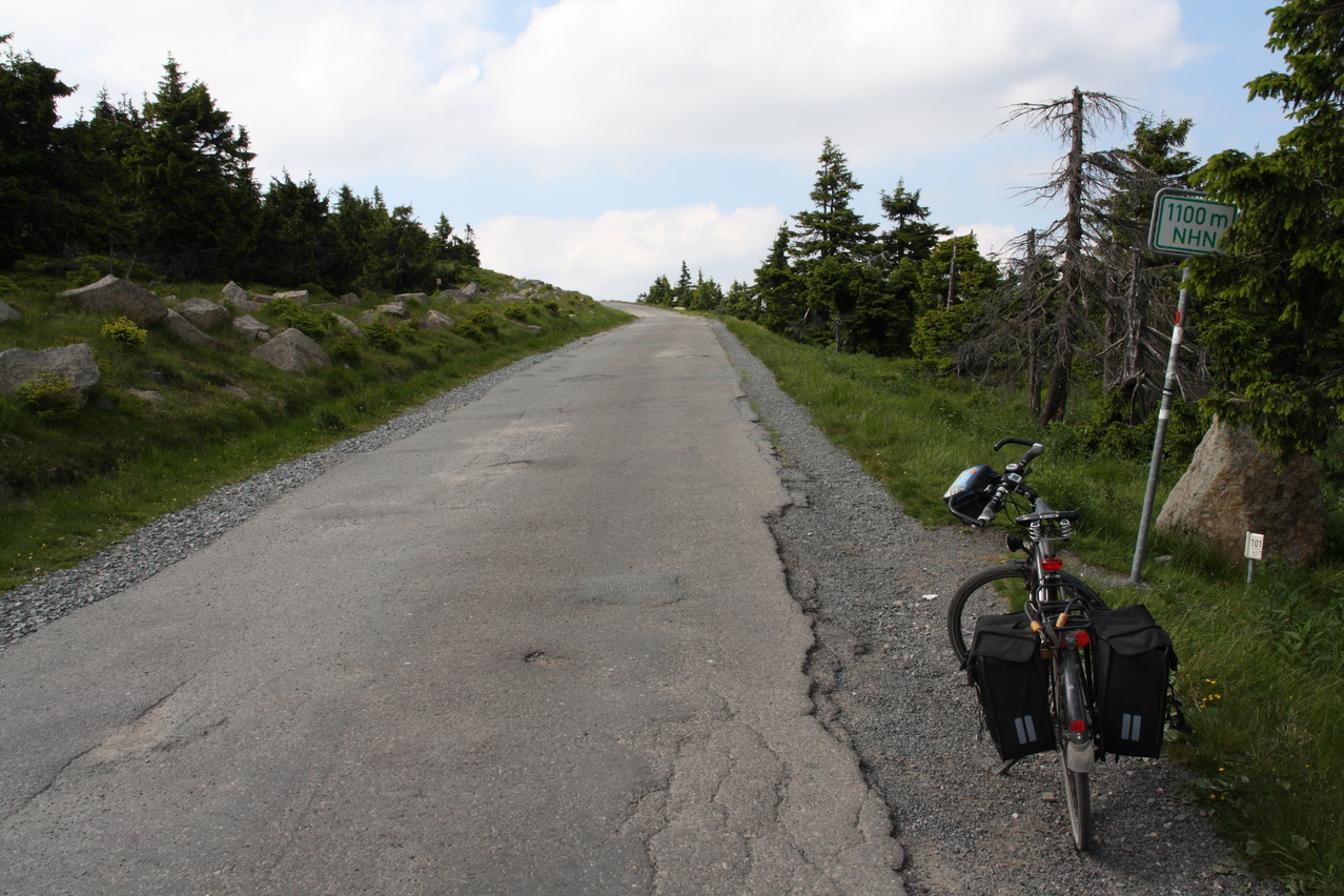 Beschreibung | "Doch erstens kommt es anders und zweitens als man denkt." An diesem schönen und nicht zu warmen Tag sollte eigentlich eine Tour von Oker nach Torfhaus und zurück über Waldwege nach Bad Harzburg gefahren werden. Nach einem längeren Blick auf der Karte während der Anreise setzte sich jedoch die Erkenntnis durch, dass die vielen unbefestigten Wege zwischen Bad Harzburg und Torfhaus mit dem Trekkingrad besser bergauf als bergab zu fahren wären, was einer Umkehr der ursprünglich geplanten Fahrtrichtung entsprach. Also startete die Tour in Bad Harzburg. Da die Kernstadt und der Kopfbahnhof von Bad Harzburg bereits am Hang liegen, ging es ohne Umschweife gleich zur Sache. Auf asphaltierter Straße begleitet zunächst Laubwald den Weg Richtung Molkenhaus. Kurz vor dem Molkenhaus wechselt der Belag auf Schotter und der Laubwald geht allmählich in Fichtenwald über. Oberhalb des Molkenhauses folgt die erste steile Rampe. Nach dem ersten Blick auf den Brocken endet der Schotterweg im Wald als Sackgasse. Ab hier wird es eklig. Mountainbiker nennen sowas "Singletrail", es ist aber nichts anderes als ein Trampelpfad mit quer liegenden Baumwurzeln, der sich mit dem Trekkingrad nur im Kriechgang befahren lässt. Nach 1,6 km endet dieser Alptraum und weiter geht es auf Schotterpisten. Noch war Torfhaus das Ziel, obwohl gelegentliche Abzweige zum Brocken schon mal zumindest theoretische Gedanken aufkommen ließen. Diese Abzweige sind aber entweder mit dem Trekkingrad unpassierbar oder führen erst mal bergab. Damit kamen die alle nicht in Frage, da Bergauffahrt angesagt war. Auf gut 800 m ü.NHN stieß der gerade befahrene Weg auf den Goetheweg. Rechts und leicht bergab ging es nach "Torfhaus 2,2 km", links bergauf zum "Brocken 6,9 km". Nach einem Blick auf die Uhr und die Füllstände der "Tanks" fiel die Entscheidung: Kurswechsel Richtung Brocken! Nun lagen also noch über 300 Höhenmeter im Weg und es ging bis auf ein kurzes Stück auf dem Quitschenberg nur noch bergauf. Die Steigungen sind aber bis kurz hinter der Zonengrenze moderat. Dort liegen dann diese wunderbaren Betonwabenplatten auf der Erde. Auf diesem Zeug ist das Fahren schon in der Ebene nervtötend, hier kommt noch eine Steigung mit durchgängig über 10 % und bis zu 20 % ins Spiel. Dafür geht es nach den Betonwabenplatten längs der Bahnlinie moderat bergauf, bis die Brockenstraße erreicht wird. Bis zum Gipfel ist dort noch mal Arbeit angesagt. Auf der Brockenstraße und auch schon zuvor auf dem Goetheweg kamen immer wieder Wellen von Fußgängern entgegen. Beim Blick auf das Schuhwerk zeigte sich, dass die wenigsten davon Wanderer waren. Die meisten von denen ließen sich offenbar von der Brockenbahn hochkutschieren, was auch mit den Zeitverzügen zwischen den Fußgängerwellen und bergab fahrenden Bahnen gut übereinstimmte. Turnschuhe für diesen Zweck mögen ja noch gehen, aber bei Sandalen oder Flipflops an den Füßen wird es schon komisch. Gegen 17:15 MESZ wurde der Gipfel erreicht, oben war kein allzu großer Andrang mehr. Die Abfahrt nach Wernigerode verlief problemlos, auch die Baustelle auf der Brockenstraße, die gerade saniert wird und deshalb offiziell "aus Verkehrssicherheitsgründen" gesperrt ist, konnte mit angepasster Geschwindigkeit gefahrlos passiert werden. Unter der Woche sollte das wegen der laufenden Bauarbeiten aber nicht versucht werden. |