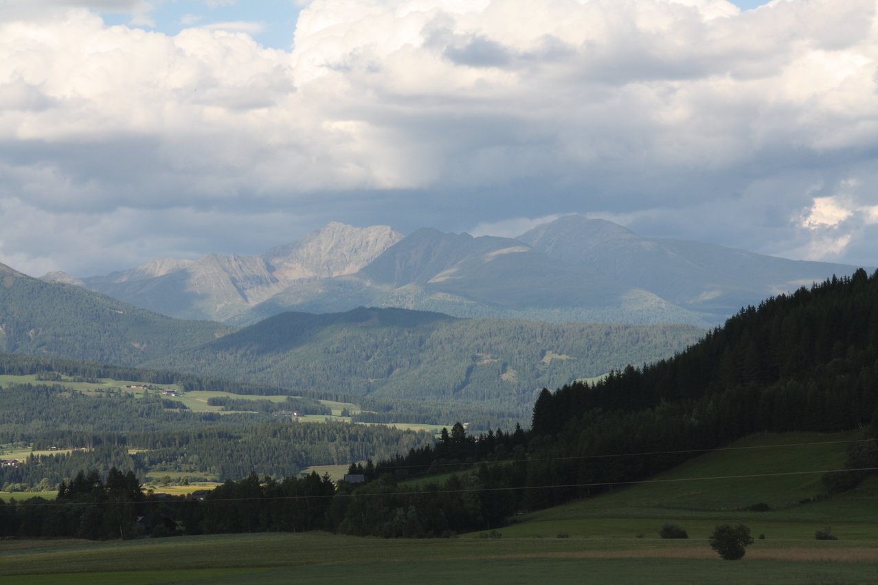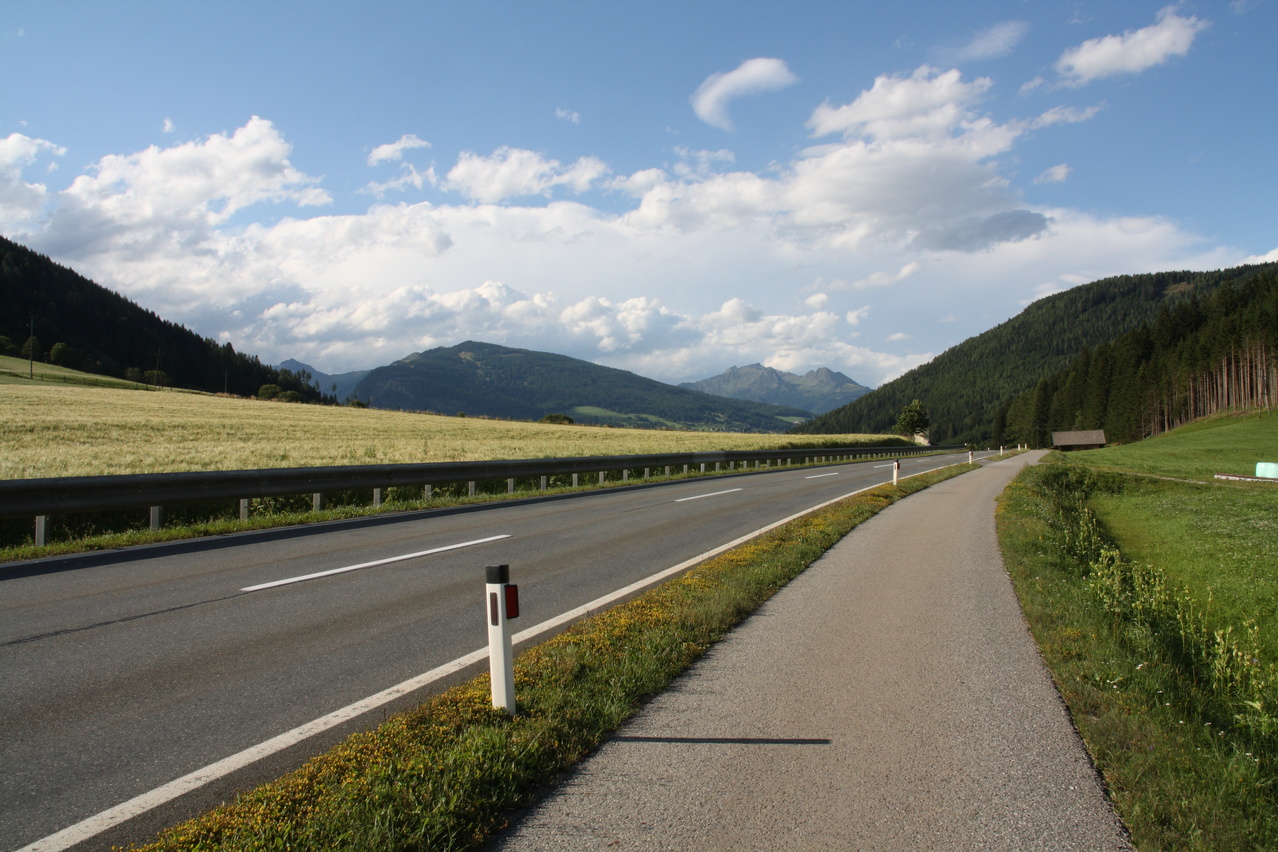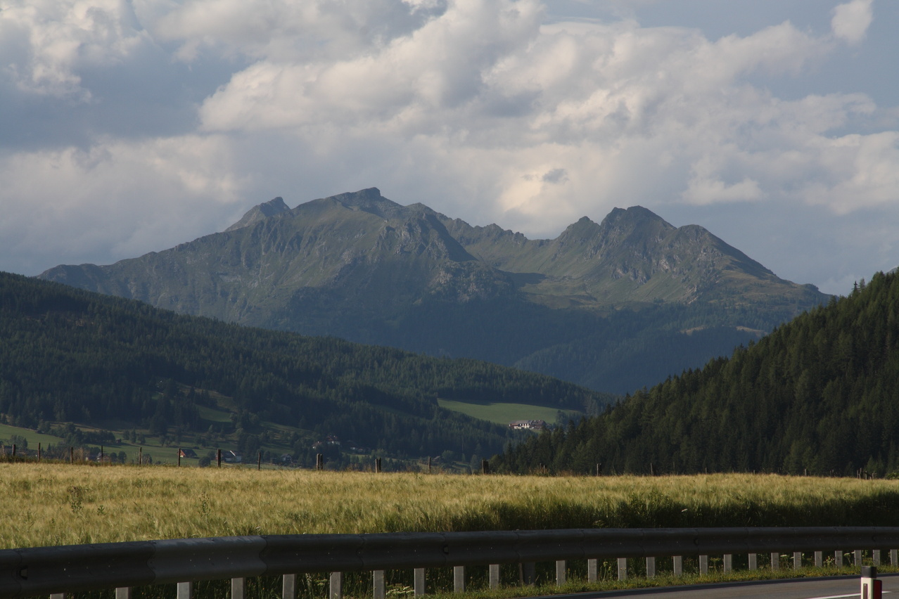 Beschreibung | Dieser Tag begann gleich richtig mies und das lag nicht am sonnigen Wetter. Das im Quartier servierte Frühstück war eine Frechheit bestehend aus steinharten Brötchen und nicht minder hartem Brot ohne irgendwelche Alternativen wie Müsli oder Toast. Da wurde nur das Nötigste runtergewürgt, um losfahren zu können ☹ Unterwegs wurde der erste Lebensmittelladen am Streckenrand angefahren, um dort erst mal richtig zu frühstücken. Unter anderem für solche Fälle war ein Teelöffel greifbar im Gepäck. Bis Mühlbach lässt sich die Katschbergstraße, die Landesstraße B99, gut fahren, auch wenn die Steigung einige Male etwas anzieht. Ab Rennweg am Katschberg beginnt die Südrampe der Katschberghöhe und ab Mühlbach wird es eklig. Die Katschbergstraße wird immer steiler und die letzten 3,0 km bis zur Passhöhe weisen eine mittlere Steigung von 11,9 % bei einer maximalen Steigung von 15 % auf. Mit dem voll beladenen Fahrrad und sieben Etappen, davon fünf Bergetappen, in den Beinen wechselte die Fortbewegung auf den letzten 3 km bis zur Passhöhe zwischen Fahren im kleinsten Gang (22:34 Zähne) und Schieben, um in einer halbwegs vernünftigen Zeit mit Muskelkraft nach oben zu kommen. Die Sonne, die genau auf der Straße stand, machte die Sache nicht angenehmer, zumal es an dem Tag mit über +25 °C auch in den höheren Lagen knuffig warm wurde. Die Landschaft im Bereich der Südrampe verleitet auch nicht gerade zum Griff zur Kamera, obwohl genug Pausen dafür Gelegenheit geboten hätten. Auf der Passhöhe liegt ein Skiort, links und rechts zwei ziemlich kahle Skiberge, alles in allem kein optischer Leckerbissen. Kurz vor der Nordrampe fallen noch zwei Grenzsteine und ein Myriameterstein, die dicht beieinander stehen, auf. 1 Myriameter = 10 km, das Myriameter ist eine veraltete Einheit für Entfernungsangaben. Rauf auf den Pass ging ja noch irgendwie, aber die Abfahrt wurde extrem ätzend. Die Nordrampe fällt über 4,9 km mit einem mittleren Gefälle von 12,3 % und einem maximalen Gefälle von 15 % ab. Zu allem Überfluss war es auch noch warm, fast windstill und die Sonne brannte auf den Asphalt. Bei dem Gefälle wurden die Felgen nach hundert Metern heiß und sie wurden die Wärme auch kaum wieder los. Wohin sollte die Wärme bei heißem Asphalt, direkter Sonneneinstrahlung, warmer Luft und Windstille auch abgeführt werden? Um nicht ewig auf das Abkühlen der Felgen warten zu müssen, wurden bergab(!) Schiebestrecken eingelegt. Erst im unteren Bereich der Nordrampe war ein etwas zügigeres Vorwärtskommen möglich, da dann endlich Teile der Straße im Schatten lagen. Alles in allem ist die Katschberghöhe nichts für voll beladene Trekkingräder. Die Landschaft ist für alpine Verhältnisse sehr uninteressant und wird im unteren Bereich der Südrampe bis Rennweg am Katschberg durch die Tauernautobahn verschandelt. Die Bergauffahrt könnte ja noch als sportliche Herausforderung betrachtet werden, aber die Bergabfahrt ist einfach nur nervtötend und in der anderen Richtung dürfte das nicht anders sein. Außerdem fällt bei hohem Sonnenstand kaum Schatten auf beide Rampen. Nach der Katschberghöhe folgte der nächste, diesmal landschaftliche Schock. Das Murtal wirkt wie eine Mittelgebirgsregion. Das liegt an den umliegenden Nockbergen mit ihren rundlichen, bis oben hin bewaldeten Gipfeln. Dass die Talsohle hier auf über 1000 Metern Höhe liegt, fällt praktisch nicht auf. Erst der Kurswechsel Richtung Etappenziel brachte wieder alpine Ausblicke. Im Westen war deutlich eine Schlechtwettergrenze über den Bergen zu sehen, die sich aber am Abend kaum zu bewegen schien. |