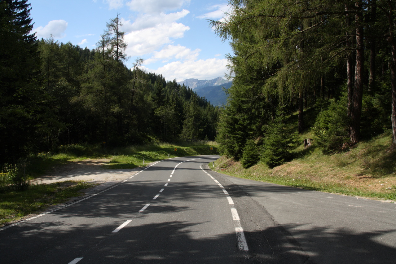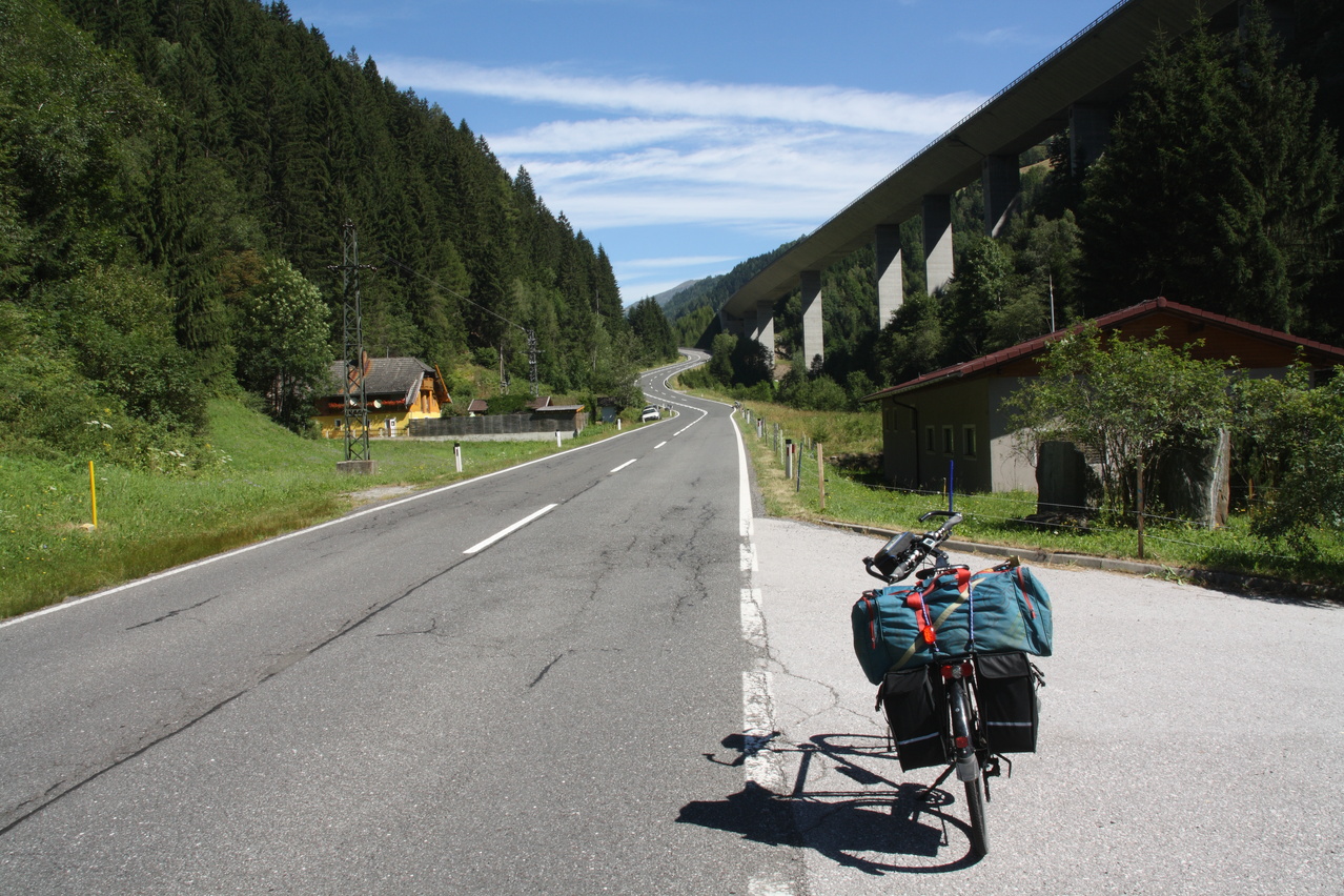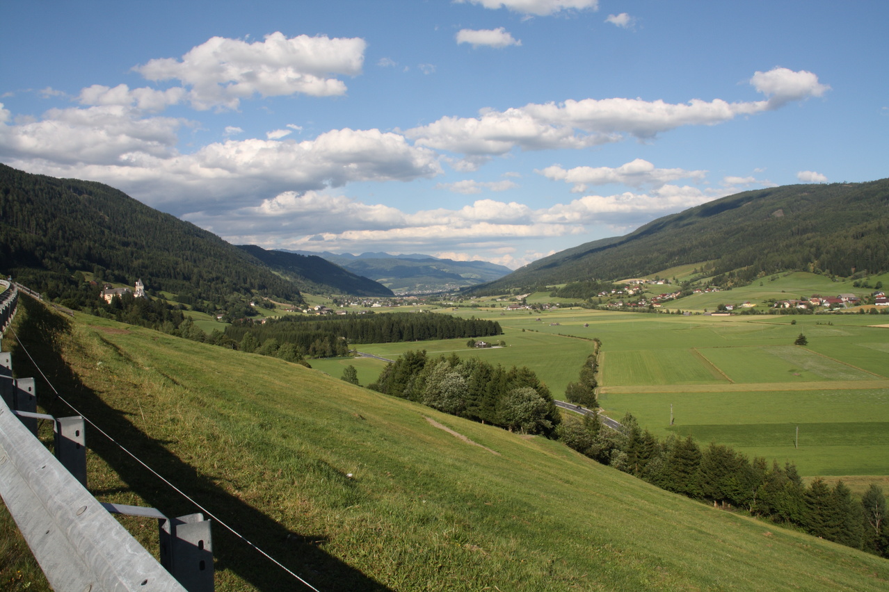 Beschreibung | Dieser Tag begann gleich richtig mies und das lag nicht am sonnigen Wetter. Das im Quartier servierte Frühstück war eine Frechheit bestehend aus steinharten Brötchen und nicht minder hartem Brot ohne irgendwelche Alternativen wie Müsli oder Toast. Da wurde nur das Nötigste runtergewürgt, um losfahren zu können ☹ Unterwegs wurde der erste Lebensmittelladen am Streckenrand angefahren, um dort erst mal richtig zu frühstücken. Unter anderem für solche Fälle war ein Teelöffel greifbar im Gepäck. Bis Mühlbach lässt sich die Katschbergstraße, die Landesstraße B99, gut fahren, auch wenn die Steigung einige Male etwas anzieht. Ab Rennweg am Katschberg beginnt die Südrampe der Katschberghöhe und ab Mühlbach wird es eklig. Die Katschbergstraße wird immer steiler und die letzten 3,0 km bis zur Passhöhe weisen eine mittlere Steigung von 11,9 % bei einer maximalen Steigung von 15 % auf. Mit dem voll beladenen Fahrrad und sieben Etappen, davon fünf Bergetappen, in den Beinen wechselte die Fortbewegung auf den letzten 3 km bis zur Passhöhe zwischen Fahren im kleinsten Gang (22:34 Zähne) und Schieben, um in einer halbwegs vernünftigen Zeit mit Muskelkraft nach oben zu kommen. Die Sonne, die genau auf der Straße stand, machte die Sache nicht angenehmer, zumal es an dem Tag mit über +25 °C auch in den höheren Lagen knuffig warm wurde. Die Landschaft im Bereich der Südrampe verleitet auch nicht gerade zum Griff zur Kamera, obwohl genug Pausen dafür Gelegenheit geboten hätten. Auf der Passhöhe liegt ein Skiort, links und rechts zwei ziemlich kahle Skiberge, alles in allem kein optischer Leckerbissen. Kurz vor der Nordrampe fallen noch zwei Grenzsteine und ein Myriameterstein, die dicht beieinander stehen, auf. 1 Myriameter = 10 km, das Myriameter ist eine veraltete Einheit für Entfernungsangaben. Rauf auf den Pass ging ja noch irgendwie, aber die Abfahrt wurde extrem ätzend. Die Nordrampe fällt über 4,9 km mit einem mittleren Gefälle von 12,3 % und einem maximalen Gefälle von 15 % ab. Zu allem Überfluss war es auch noch warm, fast windstill und die Sonne brannte auf den Asphalt. Bei dem Gefälle wurden die Felgen nach hundert Metern heiß und sie wurden die Wärme auch kaum wieder los. Wohin sollte die Wärme bei heißem Asphalt, direkter Sonneneinstrahlung, warmer Luft und Windstille auch abgeführt werden? Um nicht ewig auf das Abkühlen der Felgen warten zu müssen, wurden bergab(!) Schiebestrecken eingelegt. Erst im unteren Bereich der Nordrampe war ein etwas zügigeres Vorwärtskommen möglich, da dann endlich Teile der Straße im Schatten lagen. Alles in allem ist die Katschberghöhe nichts für voll beladene Trekkingräder. Die Landschaft ist für alpine Verhältnisse sehr uninteressant und wird im unteren Bereich der Südrampe bis Rennweg am Katschberg durch die Tauernautobahn verschandelt. Die Bergauffahrt könnte ja noch als sportliche Herausforderung betrachtet werden, aber die Bergabfahrt ist einfach nur nervtötend und in der anderen Richtung dürfte das nicht anders sein. Außerdem fällt bei hohem Sonnenstand kaum Schatten auf beide Rampen. Nach der Katschberghöhe folgte der nächste, diesmal landschaftliche Schock. Das Murtal wirkt wie eine Mittelgebirgsregion. Das liegt an den umliegenden Nockbergen mit ihren rundlichen, bis oben hin bewaldeten Gipfeln. Dass die Talsohle hier auf über 1000 Metern Höhe liegt, fällt praktisch nicht auf. Erst der Kurswechsel Richtung Etappenziel brachte wieder alpine Ausblicke. Im Westen war deutlich eine Schlechtwettergrenze über den Bergen zu sehen, die sich aber am Abend kaum zu bewegen schien. |