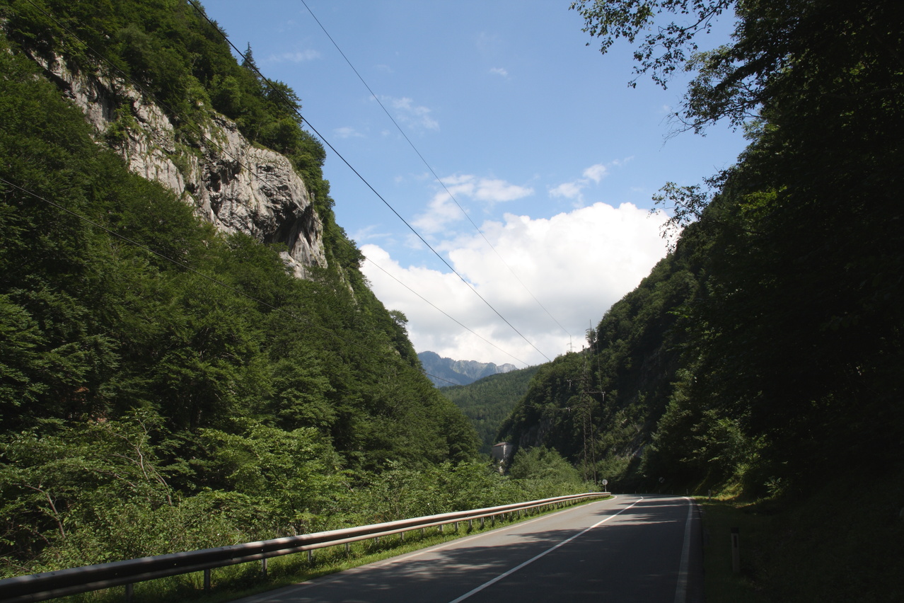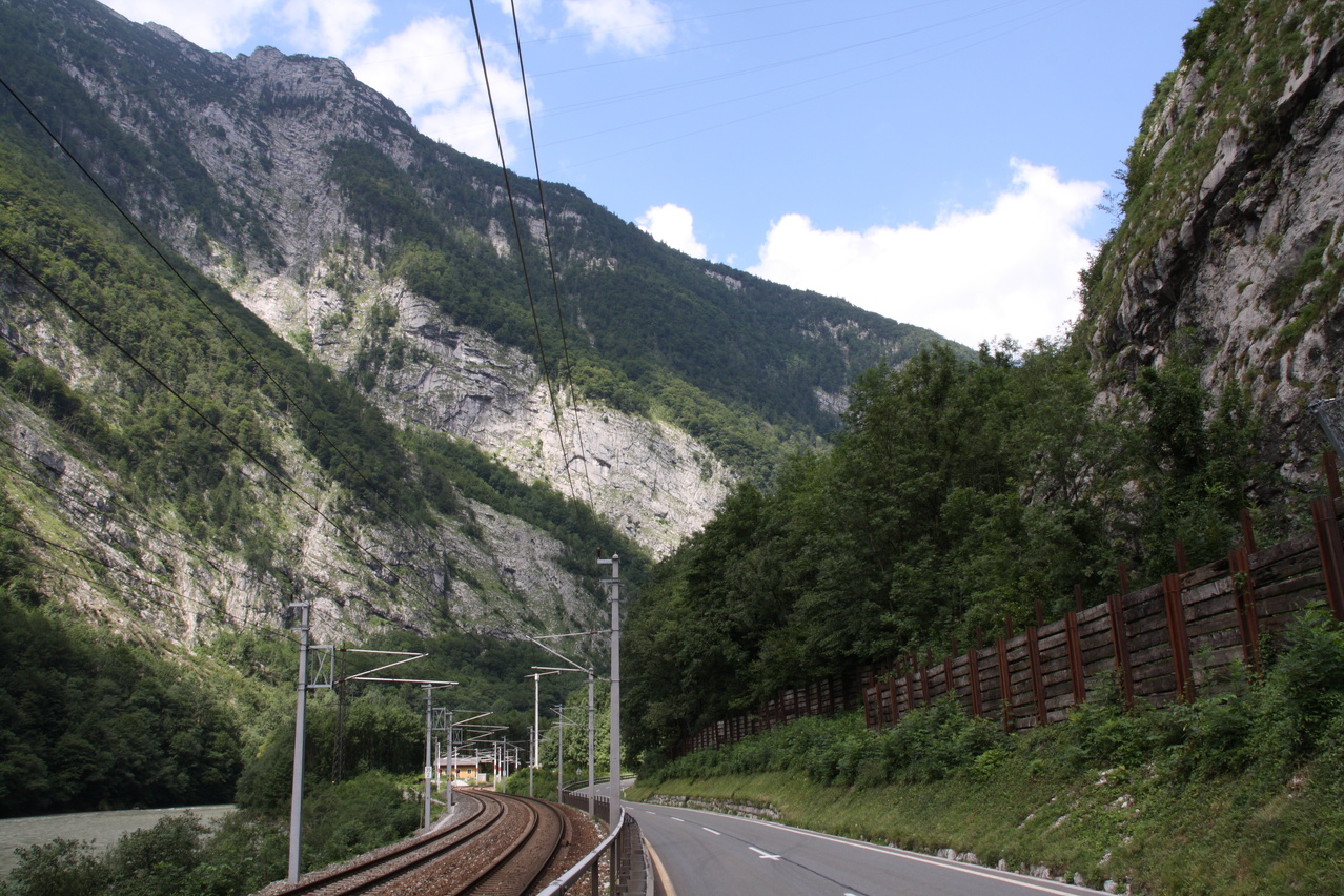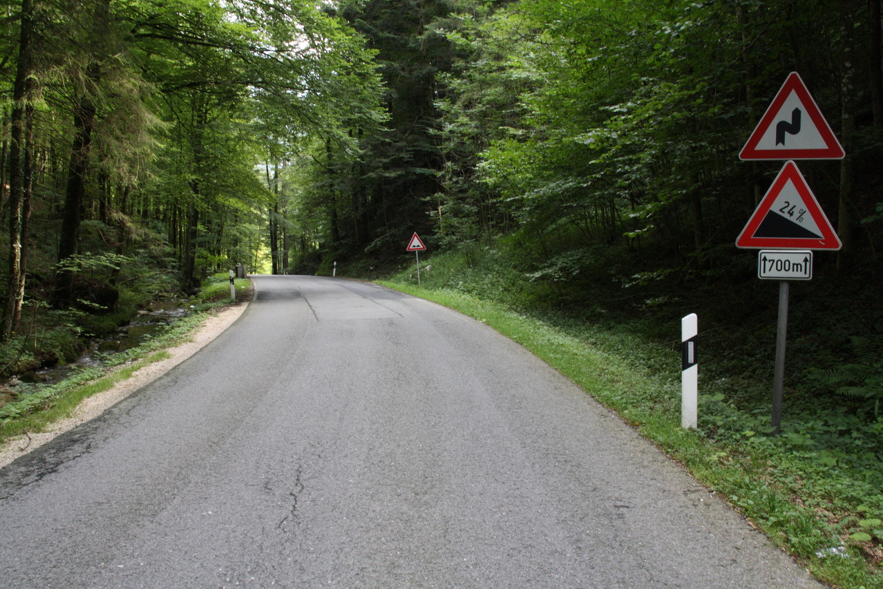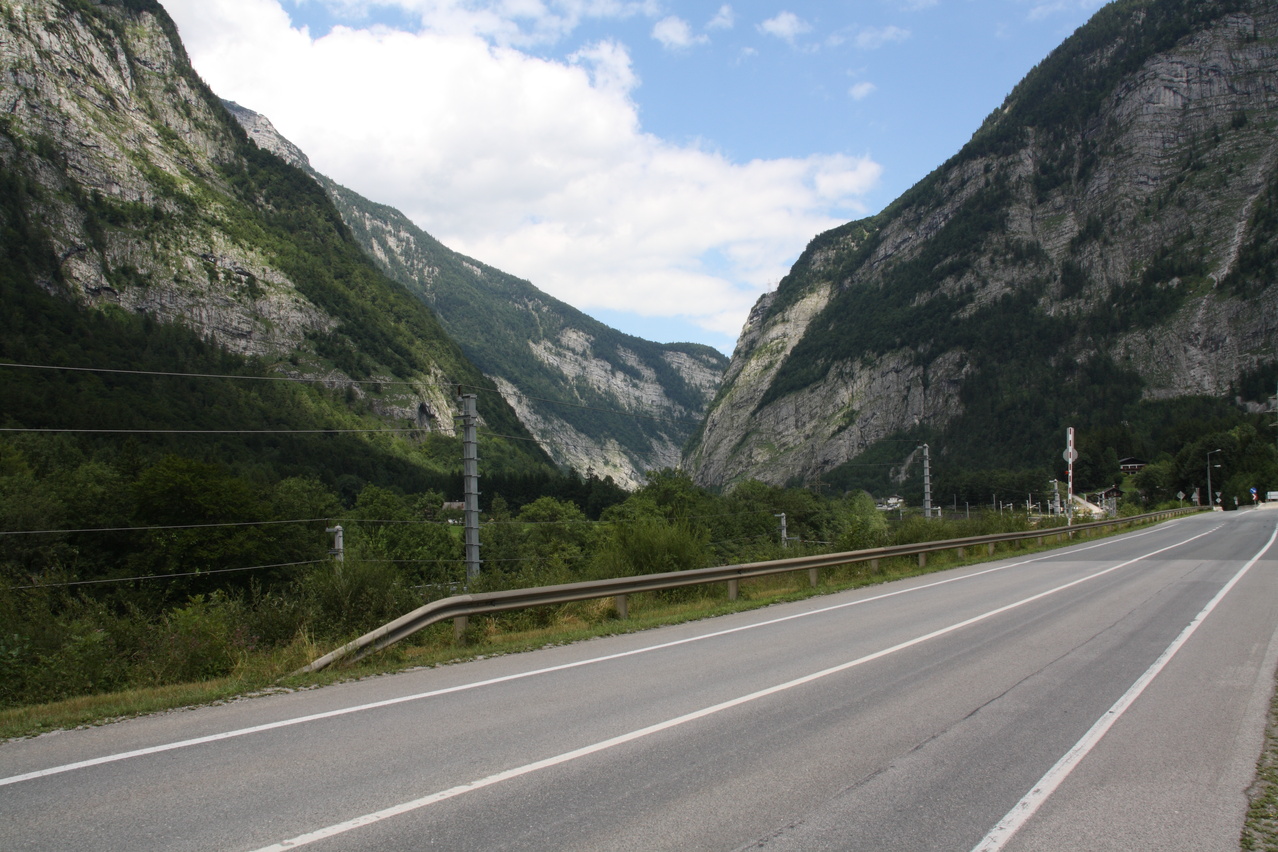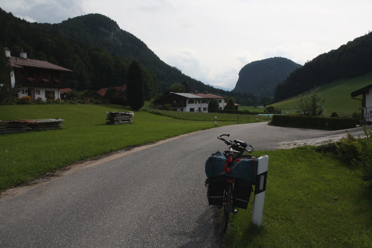 Beschreibung | Das Regengebiet vom Vortag war nun endlich nach Osten abgezogen. Auf dessen Rückseite folgte zunächst schönes Wetter und erst zum Ende der Etappe trübte es von Westen her wieder etwas ein. Genau wie bei der Alpentour 2009 war auch in diesem Jahr das Tennengebirge in Wolken gehüllt. Als letzte Etappe war diese Etappe ohne längere Steigungen geplant. Bis zu den Salzachöfen, wo die Salzach zwischen Hagengebirge und Tennengebirge durchbricht, ist die Landschaft alpin geprägt. Die Salzachöfen selbst sind für eine Klamm recht breit und daher nicht so spektakulär wie etwa die Taurachklamm es bei schönem Wetter sein muss. Nördlich der Salzachöfen geht es mal kurz bergauf zum Pass Lueg, einem Talpass. Direkt nach dessen "Passhöhe" folgt ein Tunnel. Nördlich davon beginnt das optische Grauen. Während im Westen noch höhere Berge zu sehen sind, wirkt die Landschaft im Osten wie ein Mittelgebirge und voraus im Norden liegt das Salzburger Becken, also plattes Land. Schon fast aus den Alpen raus wurde in Hallein Richtung Berchtesgaden abgebogen. Diese Straße führte wieder in bergiges Gelände und die Nebenstraße nach Berchtesgaden stand mit ihrer Steigung bis zu 20 % wie eine Wand im Weg. Hier wurde in die Rampe reingefahren, aber nach der ersten Zwangspause (Puls am Anschlag!) der Rest, wenige hundert Meter, geschoben. Dann folgte der etwas seltsame Grenzübertritt nach Deutschland. Aber wo genau ist da nun die Grenze? Das deutsche und das österreichische Grenzschild stehen einige hundert Meter voneinander entfernt und dazwischen liegt der kleine Ort Zill. In der Bergabfahrt von Rothenlehen nach Berchtesgaden gab es noch ein Szenario ähnlich wie an der Katschberghöhe: bergab schieben! Hier war es aber nur ein kurzes Stück, dafür mit bis zu 24 % Gefälle. Unabhängig von heißgebremsten Felgen erschien das mit dem voll beladenen Fahrrad zum Fahren zu gefährlich. Und dann folgten die letzten flachen Kilometer bis zum letzten Etappenziel. Passend zu der nun aufkommenden trüben Abschiedstimmung trübte auch der Himmel zunehmend ein. Am späteren Abend setzte auch noch Regen ein, aber da liefen schon im Quartier die ersten Vorbereitungen für den Abreisetag. |