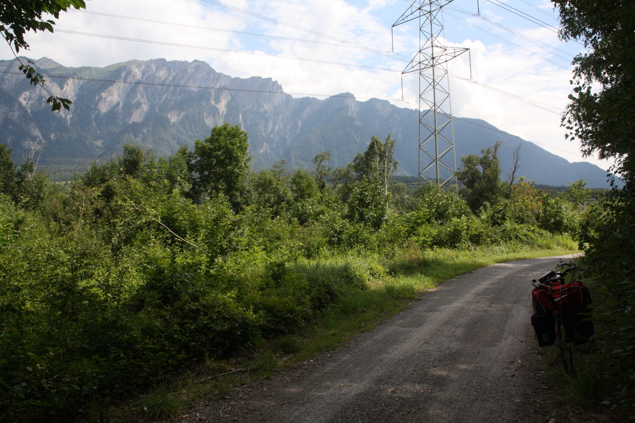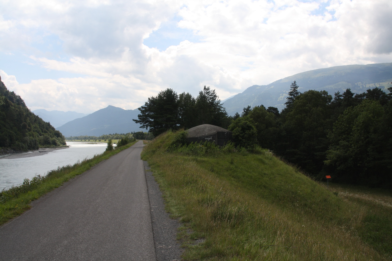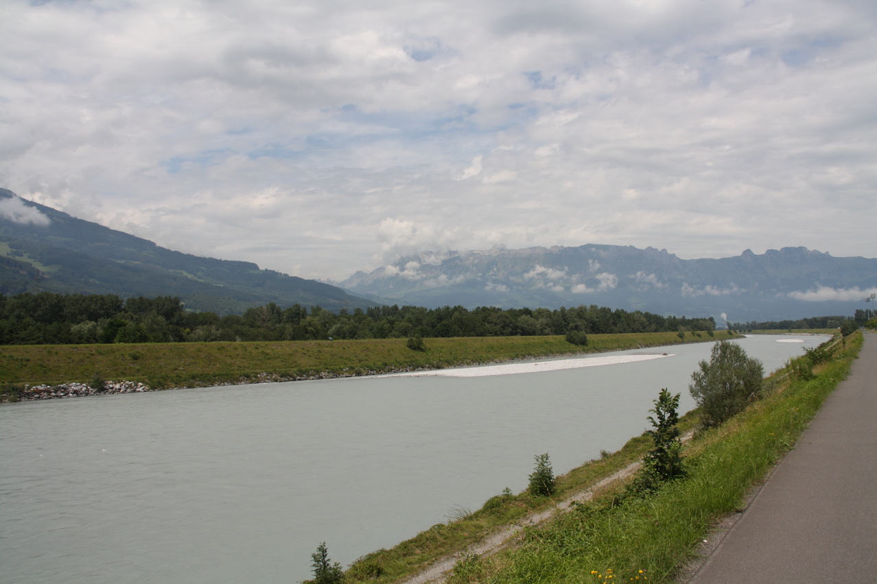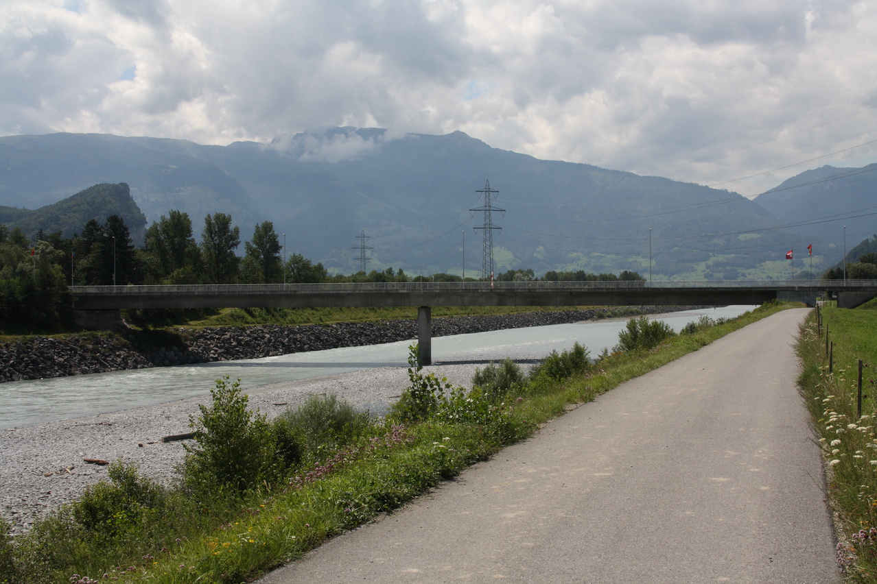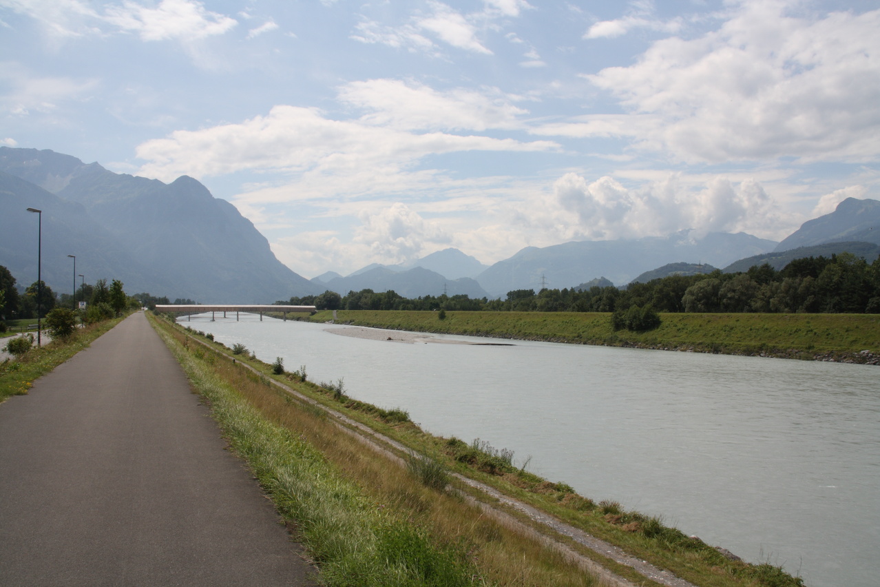 Radweg auf dem Rheindamm auf Liechtensteiner Seite, Blick nach Süden auf die "Alte Rheinbrücke" ![]() 300 dpi JPEG |