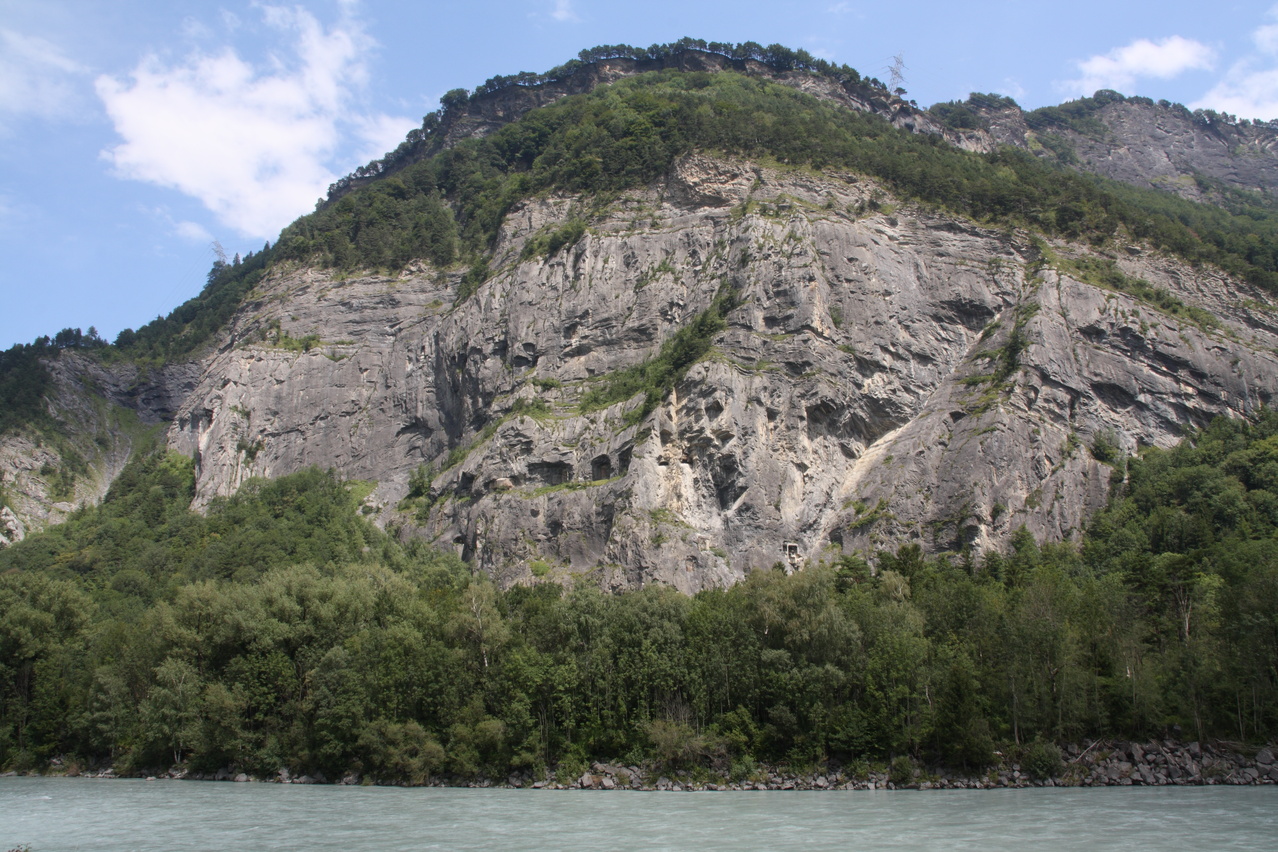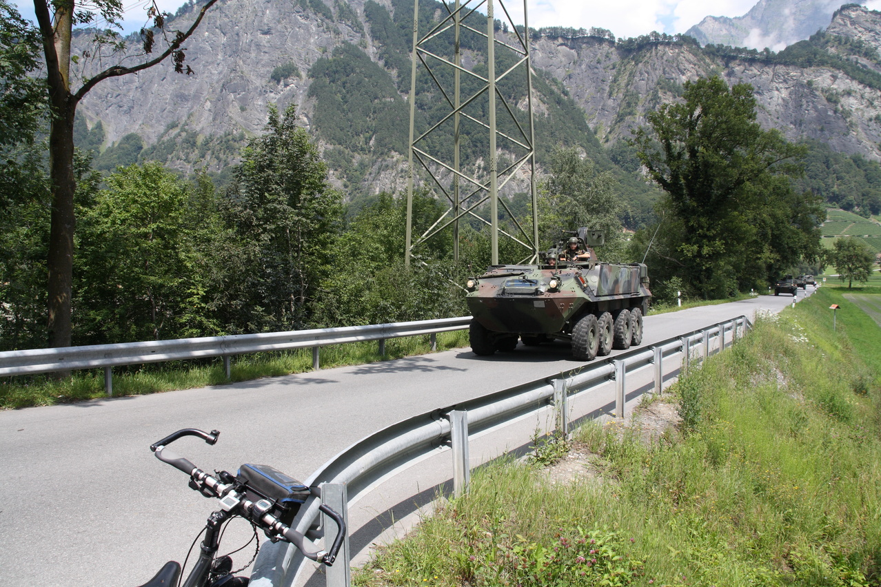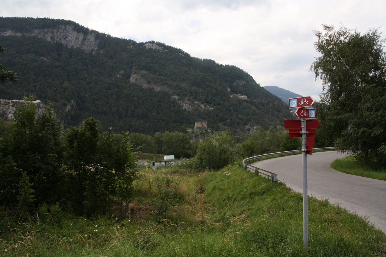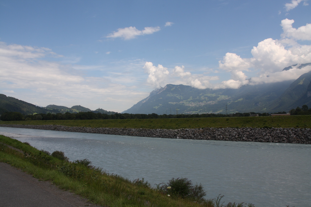 Beschreibung | Nachdem im Verlauf der beiden ersten Etappen über 1950 Höhenmeter bergauf überwunden worden waren, stand nun eine Flachetappe im Alpenrheintal an. Der Rhein zwischen dem Zusammenfluss von Vorder- und Hinterrhein in Reichenau und dem Bodensee wird auch Alpenrhein genannt, er ist nicht mit dem Hochrhein zwischen Bodensee und Basel oder gar dem Oberrhein zwischen Basel und Bingen zu verwechseln. Der Generalkurs Süd dieser Etappe führte endlich auch vom nördlichen Alpenrand weg. An der Grenze zwischen der Republik Österreich und dem Fürstentum Liechtenstein befindet sich die Zollabfertigung zwischen Europäischer Union einerseits sowie Liechtenstein und Schweiz andererseits, die eine Zollunion bilden. Dafür ist die Grenze zwischen Liechtenstein und der Schweiz ähnlich unauffällig wie die zwischen Deutschland und Österreich. Auf — oder besser in — der " Alten Rheinbrücke" zwischen Vaduz und Sevelen, wo die Grenze in der Flussmitte verläuft, kann die Grenze leicht übersehen werden. Mit dem Grenzübertritt in die Schweiz wurde aus der Fahrradtour eine Velotour, da das in Deutschland und Österreich als "Fahrrad" (kurz: "Rad") oder (in Bayern) "Radl" bekannte Verkehrsmittel in der Schweiz "Velo" heißt. Für Wortzusammensetzungen gilt Entsprechendes. Hier wird aber weiterhin der Begriff Fahrrad oder in Wortzusammensetzungen auch dessen Kurzform Rad verwendet. Südlich von Liechtenstein finden sich am Fluss und im Fels oberhalb des Ostufers Reste des "Schweizer Reduit". Diese Befestigungsanlagen wurden von der Schweiz vor und während des 2. Weltkrieges errichtet, um im Falle eines Angriffes durch Nazideutschland ein Kernland im hochalpinen Raum zu verteidigen und somit ein eigenes Staatsgebiet zu behalten. Befestigungsanlagen entlang des Rheins wurden schon zu wesentlich früheren Zeiten gebaut, wovon diverse Burgen und Burgruinen zeugen. Die Etappe selbst verlief zunächst auf der Straße am Ostufer, bei Vaduz wurde die Flussseite gewechselt und die Etappe auf asphaltierten Radwegen in der Schweiz fortgesetzt. Kurz vor Chur, dem Hauptort des Kantons Graubünden, lag dann doch noch ein kurzes Stück Schotterpiste im Weg. Die blieb aber die einzige nicht asphaltierte Passage dieser Tour. Hinweis zu Ortsbezeichungen in mehreren Sprachen: Im schweizer Kanton Graubünden sind Deutsch, Rätoromanisch und Italienisch die drei Amtssprachen. Im schweizer Kanton Tessin ist Italienisch die Amtssprache. In den schweizer Kantonen Wallis und Bern sind Deutsch und Französisch die beiden Amtssprachen. Auf diesen Seiten werden die deutschsprachigen Bezeichnungen für geografische Objekte, also Ortschaften, Berge und Gebirgszüge, Täler, Gewässer, Verkehrswege und besondere Bauwerke wie etwa Burgen, in den Kantonen Graubünden, Wallis und Bern verwendet, sofern solche verfügbar sind. Für geografische Objekte im Kanton Tessin werden die italienischsprachigen Bezeichnungen verwendet, sofern solche verfügbar sind. Unter den Bildern befindet sich jeweils eine Tabelle, die für die zuvor erwähnten geografischen Objekte die Namen in allen Amtssprachen enthält. Inoffizielle Bezeichnungen sind grau und kursiv gesetzt. |