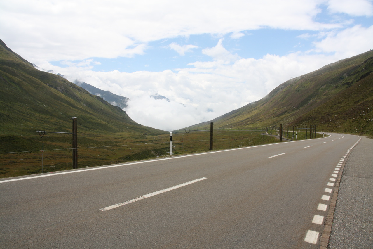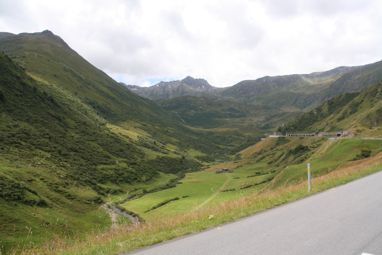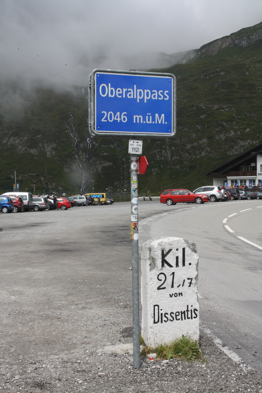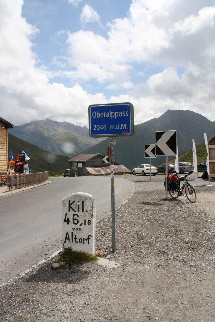 Beschreibung | An diesem Tag stand mit dem Oberalppass der erste über 2000 Meter hoch liegende Bergpass an. Zunächst steigt die Ostrampe gemächlich an, zieht dann aber immer weiter an und erreicht schließlich eine kurze Rampe mit knapp über 10 % Steigung, danach geht es bis oben hin in Serpentinen mit recht gleichmäßiger Steigung, wobei wie bei ordentlich ausgeführten Serpentinen üblich jeweils in den Kehren kaum Steigung vorhanden ist. Auf dem Weg zur Passhöhe wird der Vorderrhein immer schmaler und im Quellgebiet ist er nur noch ein besserer Bach. Auch wurden Wald- und Baumgrenze auf dieser Etappe erstmalig im Rahmen dieser Tour deutlich überschritten. Kurz vor der Passhöhe liegen dann wieder die Bahngleise der "Matterhorn Gotthard Bahn" neben der Passstraße. Die Schweizer haben diese Bahn tatsächlich fast über die Passhöhe gebaut, es gibt lediglich einen kurzen Scheiteltunnel und knapp unterhalb der Passhöhe einen Bahnhof. Die Bahn wäre freilich keine Alternative gewesen, denn die Überquerung des Oberalppasses macht auf dem Fahrrad in dieser Jahreszeit viel mehr Spaß, solange es nicht aus Eimern schüttet. Auf der Passhöhe kam kurz vor der Abfahrt doch noch eine Wolke nieder, aber bergab war das fast egal, zumal der Regen auf den Bereich der Passhöhe begrenzt blieb. Die Westrampe fällt recht gleichmäßig bis nach Andermatt ab. Das Gefälle und die zahlreichen Serpentinen erlaubten jedoch zu keiner Zeit, das Fahrrad mal "laufen zu lassen". So hatten die Bremsen reichlich kinetische in thermische Energie umzuwandeln. In Andermatt kippte unmittelbar nach der Ankunft im Quartier das Wetter, Regen setzte ein. |