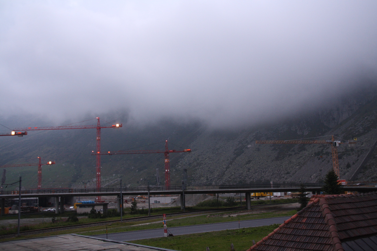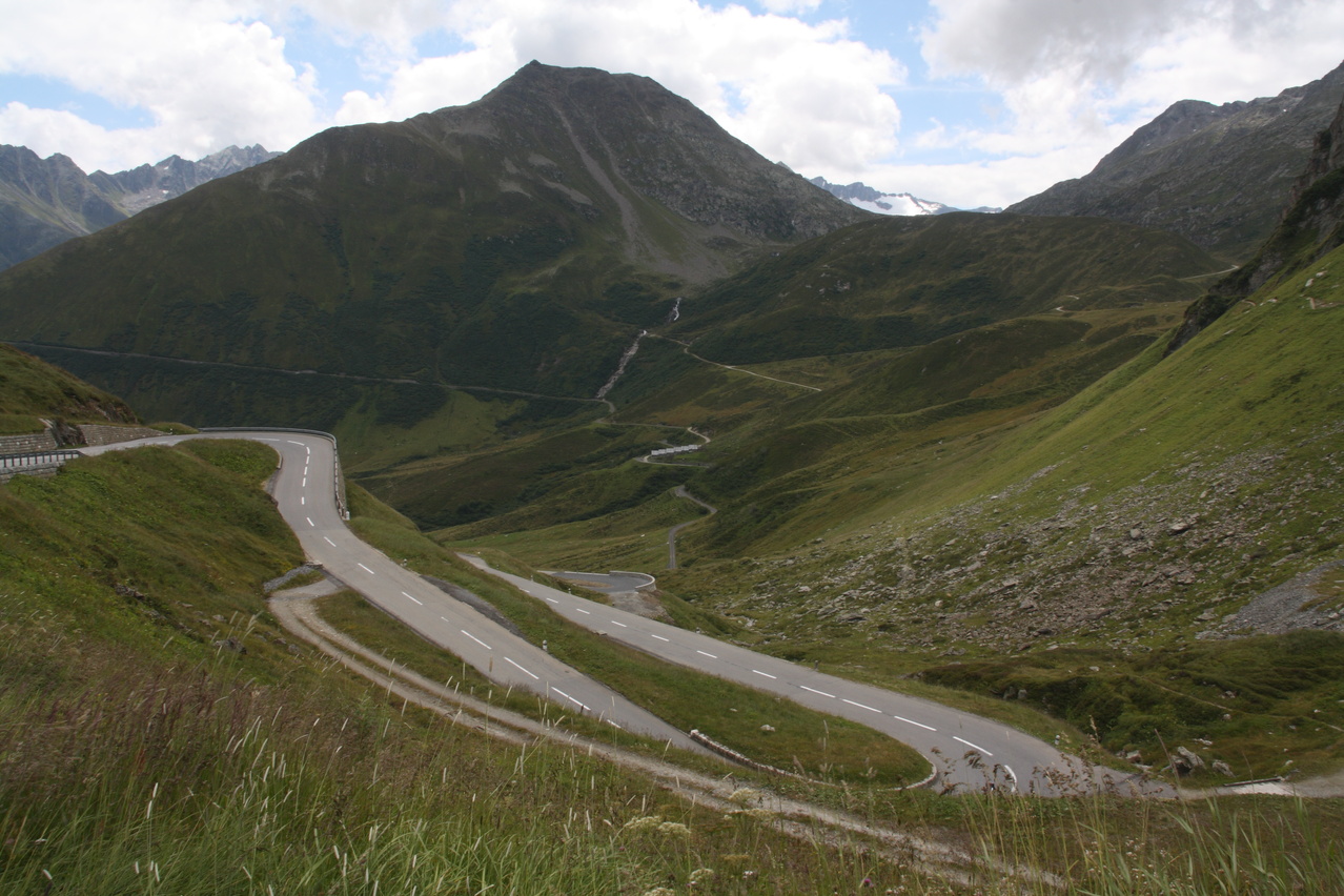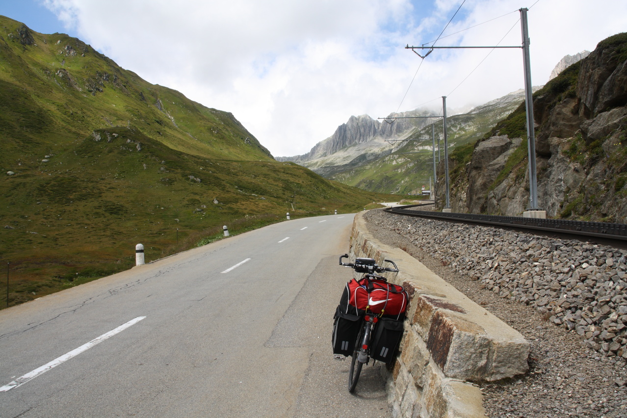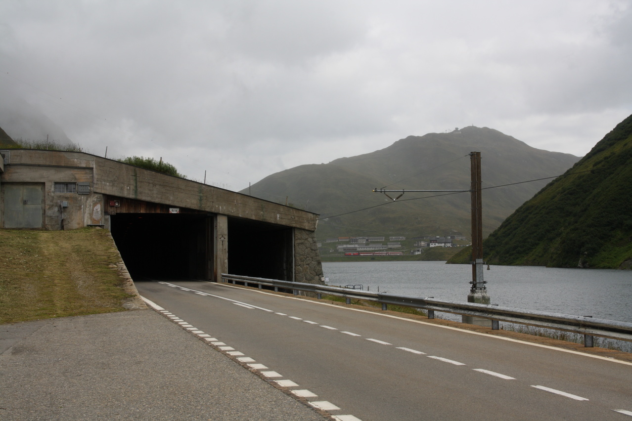 Beschreibung | An diesem Tag stand mit dem Oberalppass der erste über 2000 Meter hoch liegende Bergpass an. Zunächst steigt die Ostrampe gemächlich an, zieht dann aber immer weiter an und erreicht schließlich eine kurze Rampe mit knapp über 10 % Steigung, danach geht es bis oben hin in Serpentinen mit recht gleichmäßiger Steigung, wobei wie bei ordentlich ausgeführten Serpentinen üblich jeweils in den Kehren kaum Steigung vorhanden ist. Auf dem Weg zur Passhöhe wird der Vorderrhein immer schmaler und im Quellgebiet ist er nur noch ein besserer Bach. Auch wurden Wald- und Baumgrenze auf dieser Etappe erstmalig im Rahmen dieser Tour deutlich überschritten. Kurz vor der Passhöhe liegen dann wieder die Bahngleise der "Matterhorn Gotthard Bahn" neben der Passstraße. Die Schweizer haben diese Bahn tatsächlich fast über die Passhöhe gebaut, es gibt lediglich einen kurzen Scheiteltunnel und knapp unterhalb der Passhöhe einen Bahnhof. Die Bahn wäre freilich keine Alternative gewesen, denn die Überquerung des Oberalppasses macht auf dem Fahrrad in dieser Jahreszeit viel mehr Spaß, solange es nicht aus Eimern schüttet. Auf der Passhöhe kam kurz vor der Abfahrt doch noch eine Wolke nieder, aber bergab war das fast egal, zumal der Regen auf den Bereich der Passhöhe begrenzt blieb. Die Westrampe fällt recht gleichmäßig bis nach Andermatt ab. Das Gefälle und die zahlreichen Serpentinen erlaubten jedoch zu keiner Zeit, das Fahrrad mal "laufen zu lassen". So hatten die Bremsen reichlich kinetische in thermische Energie umzuwandeln. In Andermatt kippte unmittelbar nach der Ankunft im Quartier das Wetter, Regen setzte ein. |