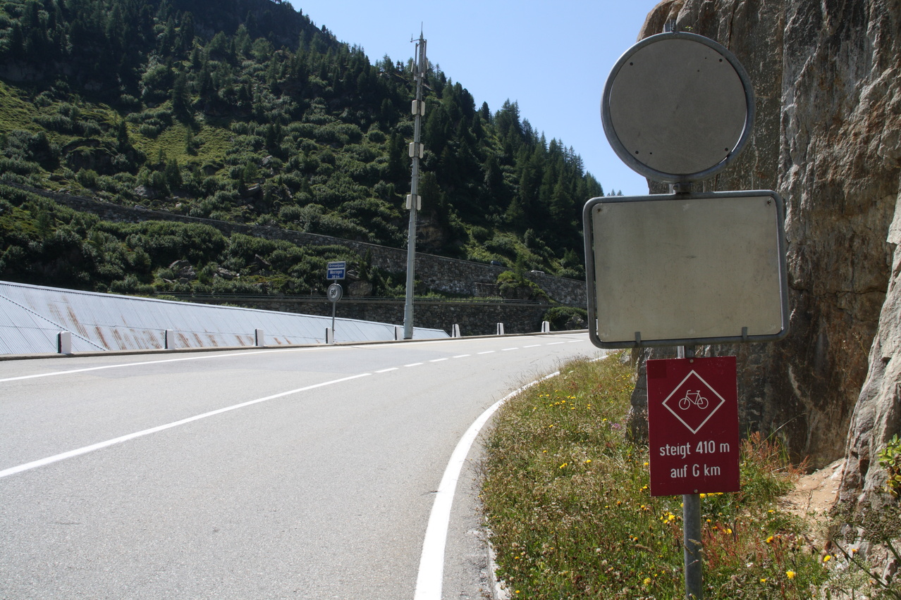 Grimselpass, Südrampe bei Gletsch: So sieht eine vernünftige Beschilderung für Fahrradfahrer aus! Dem Fahrspaß steht zumindest vom Streckenprofil her nichts mehr entgegen. ☺ ![]() 300 dpi JPEG |