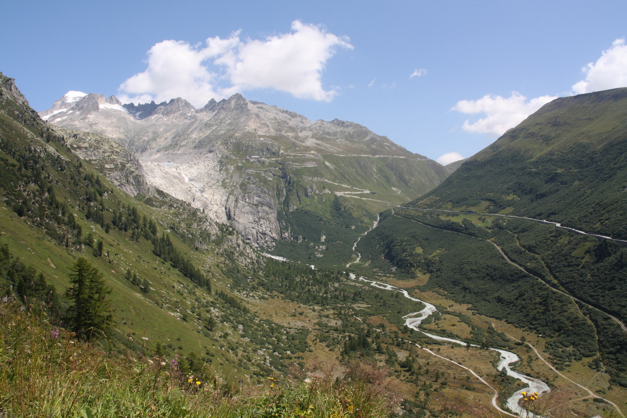 die Rhone und Gletsch, dahinter die "Rhonequelle", darüber v. l. n. r. etwas versteckt der Galenstock, das Sidelenhorn sowie Groß Furkahorn und Klein Furkahorn mit der Südwestrampe zum Furkapass ![]() 300 dpi JPEG |