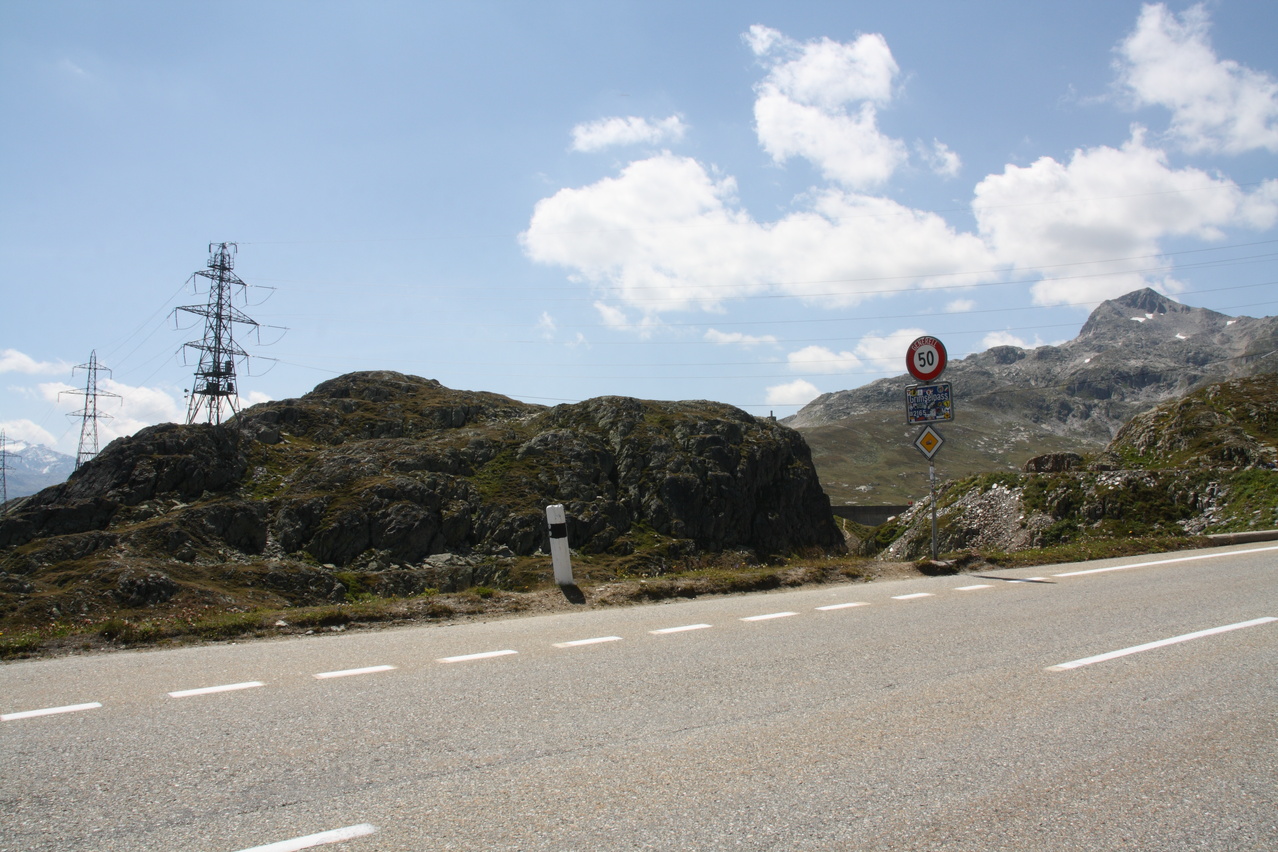 Grimselpass, Südrampe, Schild knapp unterhalb der Passhöhe, rechts dahinter das Sidelhorn — und natürlich wieder diese "wunderschönen" Freileitungsmasten ![]() 300 dpi JPEG |