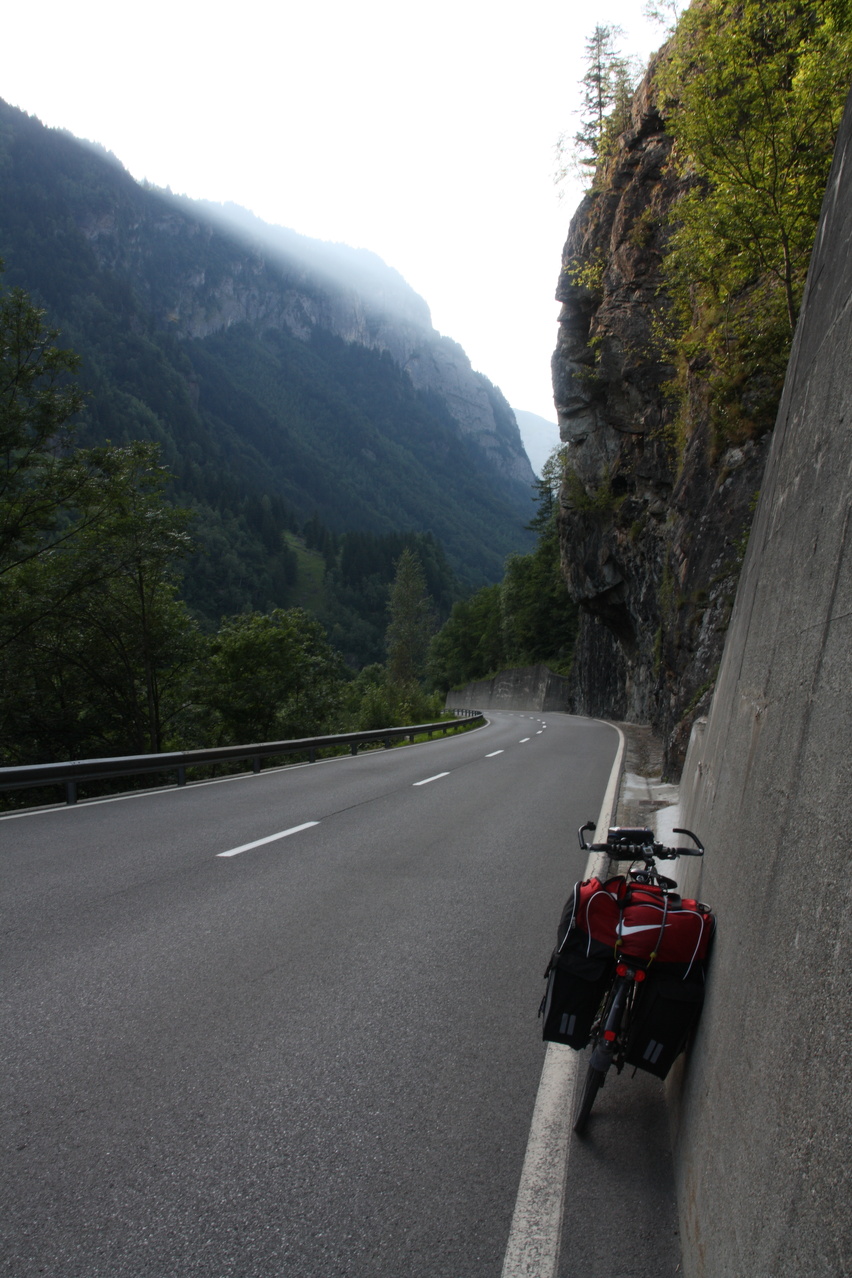 Beschreibung | Mit dem Grimselpass stand der letzte hochalpine Bergpass dieser Tour auf dem Plan. In Ulrichen bot sich bei klarem Wetter und guter Fernsicht ein weiter Blick flussabwärts ins Rhonetal mit den Walliser Alpen im Hintergrund. Bis Oberwald war Einrollen angesagt. Dort beginnt dann die Südrampe zum Grimselpass. Da diese Straße bis Gletsch auch zum Furkapass führt, rollt dort leider sehr viel Stinkeverkehr. Dafür steigt die Straße recht gleichmäßig ohne Steilstellen an. Kurz vor Gletsch tun sich neben der Straße tiefere Abgründe zur Rhone hin auf gefolgt von einer etwas luftigen Brücke über die Rhone. In Gletsch hat man dann die Wahl zwischen Grimselpass und Furkapass. Der Blick auf die Serpentinen zum Grimselpass sieht bedrohlicher aus als das Ganze ist. Diese Serpentinenstraße lässt kaum Wünsche offen. Die Südrampe steigt ab Gletsch sehr gleichmäßig an abgesehen natürlich von den fast steigungsfreien Kehren. Die Straße ist ausreichend breit und talseits einigermaßen, meist ausreichend, abgesichert. Auch bergseits ist zwischen Straße und Felswand meist noch ein wenig Platz. Lediglich der Stinkeverkehr könnte gerne weniger sein. Sowohl an der Südrampe als auch an der Nordrampe stehen die Passhöhenschilder jedoch deutlich unterhalb der eigentlichen Passhöhe, die sich irgendwo im Bereich der Straße um den Totesee befindet und nicht markiert ist. Von der Passhöhe aus war der Gipfel des Lauteraarhorns, eines Viertausenders in den Berner Alpen, an diesem Tag ohne Wolken zu sehen. Im oberen Bereich der Nordrampe fällt der Grimselsee mit seiner schwer zu beschreibenden Wasserfarbe (graugrün?) auf, die von den Partikeln herrührt, die von der aus dem Unteraargletscher entspringenden Aare eingetragen werden. Die Aare ist der längste komplett innerhalb der Schweiz verlaufende Fluss und der größte Zufluss des Rheins. Mit der Abfahrt vom Grimselpass, die auch wieder stark gebremst verlief, wurde der hochalpine Teil dieser Tour beendet. Die Drei- und Viertausender verschwanden aus dem Blickfeld und mit der Annäherung an Innertkirchen wurde die Landschaft insgesamt wieder grüner. Mit dem letztmaligen Unterschreiten von Baum- und Waldgrenze stellte sich schon Abschiedsstimmung ein. Dazu passend deutete sich am Abend ein Wetterwechsel für den kommenden Tag an und das Hotel war auch nicht gerade heimelig. Ein brüllheißes Mikrozimmer mit nicht einmal 6 m² Grundfläche und Dachschräge in Verbindung mit Etagendusche und Etagenklo zeigten noch einmal deutlich, dass in den Schweizer Alpen im Sommer keine vernünftigen Hotelzimmer unter 70,- SFr zu bekommen sind. |
