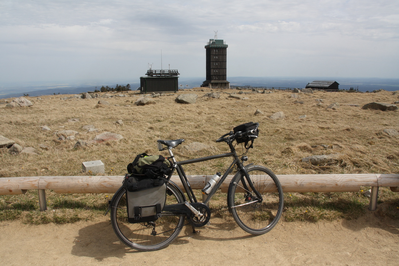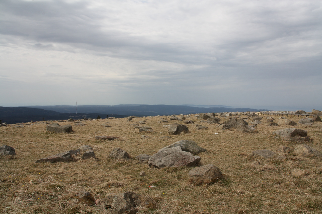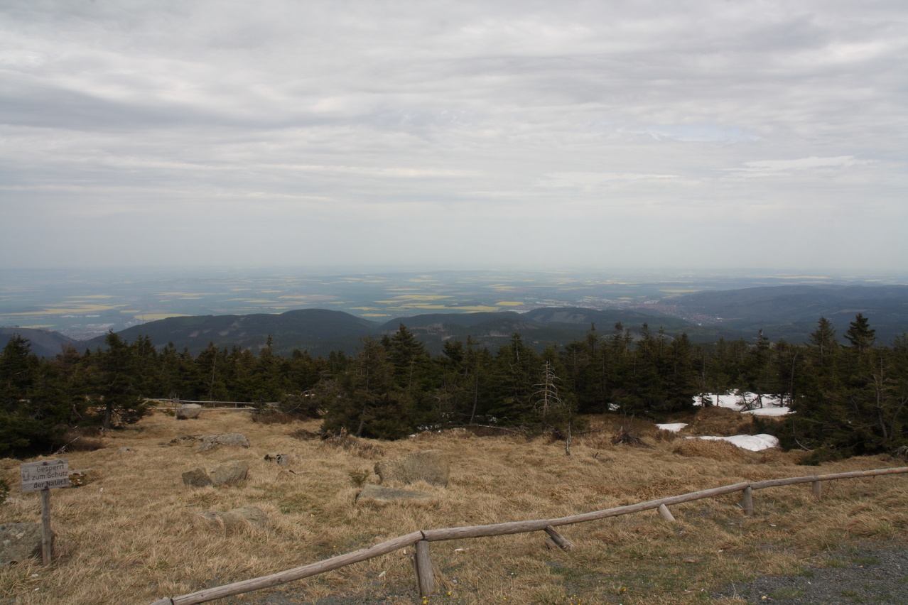 Beschreibung | Über Nacht hatte sich die Wolkengrenze, die am Vortag weit im Westen lag, nach Osten verlagert. Das war nach der Fahrt in praller Sonne am Vortag aber ganz angenehm, zumal es für eine Bergetappe ausreichend warm war. Die Sonne drang nur gelegentlich durch die Wolken, wodurch die Fotos etwas kontrastärmer ausfielen. Die Fahrt auf den Brocken gestaltete sich nach der Übernachtung in Wernigerode deutlich entspannter als bei einer Tagestour, bei der vor dem Tourstart 1 h 45 Bahnfahrt zuzüglich entsprechendem zeitlichen Vorlauf in Hannover liegen. Während die Anfahrt wegen des im Vergleich zur Tagestour früheren Starts recht verkehrsarm ausfiel, war auf der Brockenstraße ab Einmündung Goetheweg und auf dem Gipfel undank der Brockenbahn wieder der übliche Rummel. Wegen der Sanierung der Brockenstraße fehlte das Schild "1000 m ü.NHN" samt Stange, und auch das Schild "1100 m ü.NHN" konnte zwischenzeitlich wohl jemand gebrauchen, aber das war seit geraumer Zeit eh verschmiert. Im Gipfelbereich hielten sich auf der Ostseite in schattigen Lagen immer noch Schneereste. Im Laufe des Tages hatte die Wolkenschicht wenigstens Strukturen bekommen, so dass von oben wieder kontrastreichere Fotos geschossen werden konnten. Durch den früheren Start wurde auch ein Zug nach Hannover zwei Stunden früher als bei einer Tagestour erreicht. |