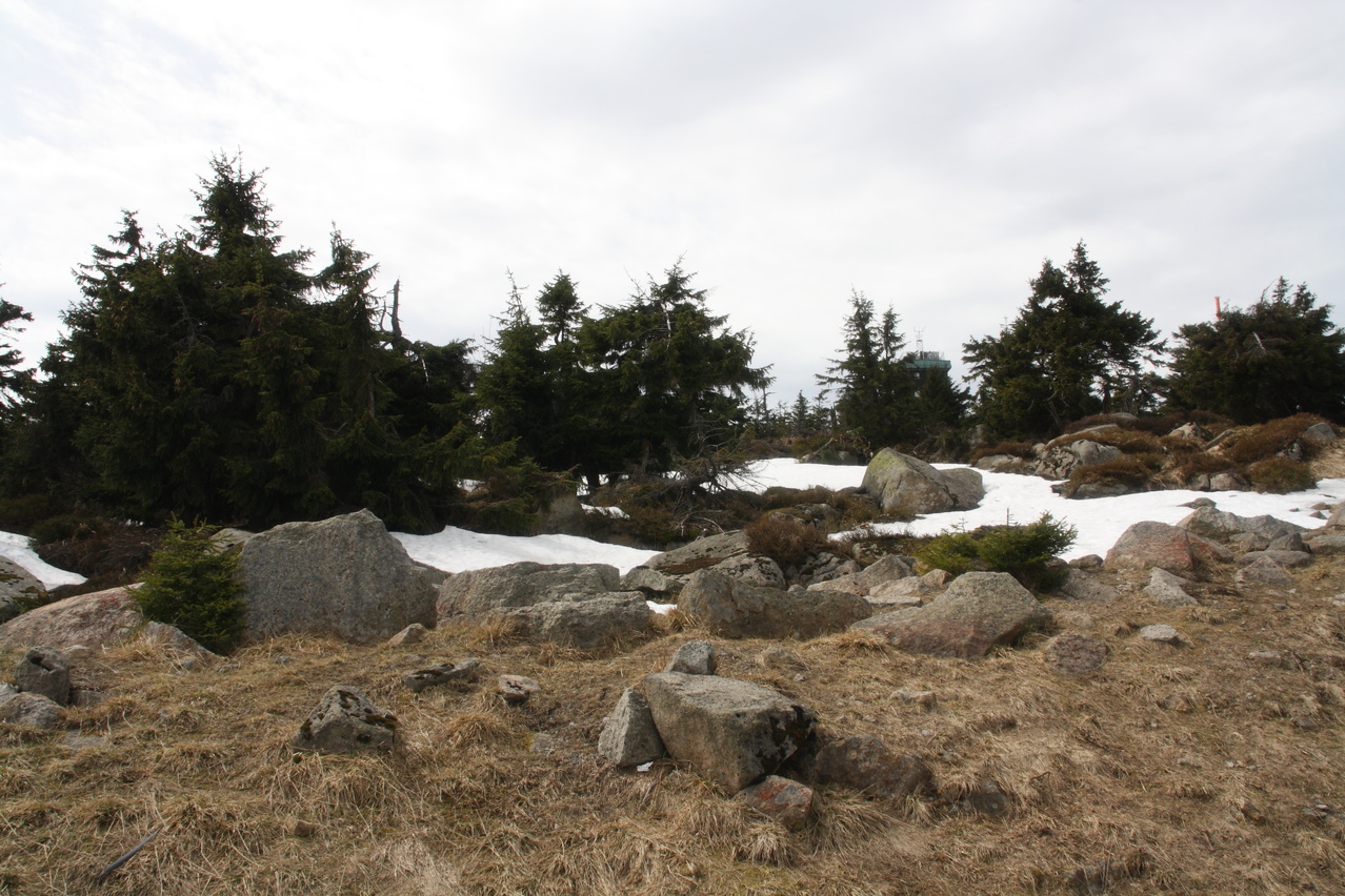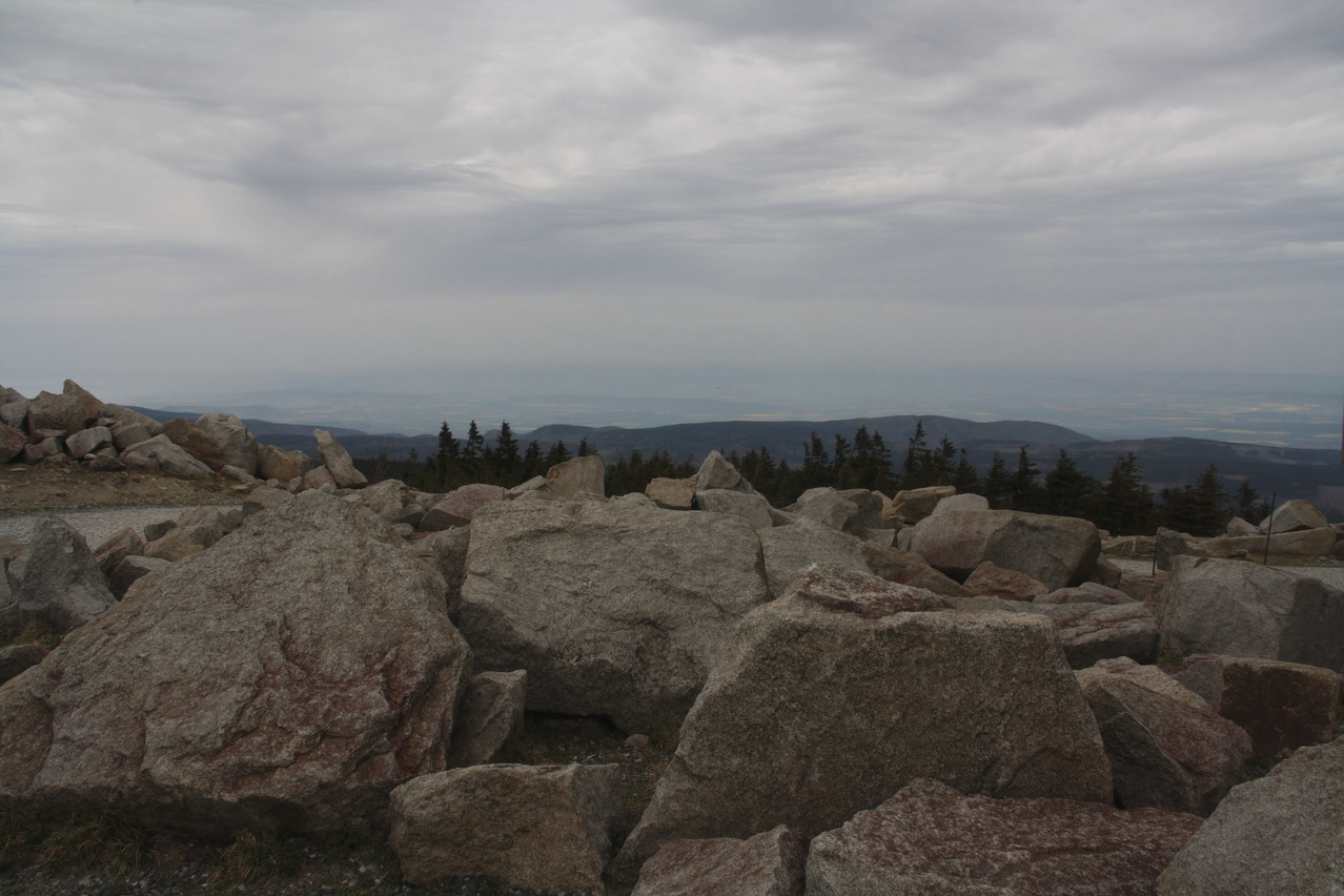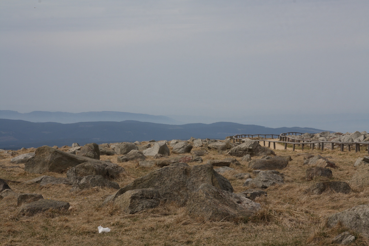 Beschreibung | Über Nacht hatte sich die Wolkengrenze, die am Vortag weit im Westen lag, nach Osten verlagert. Das war nach der Fahrt in praller Sonne am Vortag aber ganz angenehm, zumal es für eine Bergetappe ausreichend warm war. Die Sonne drang nur gelegentlich durch die Wolken, wodurch die Fotos etwas kontrastärmer ausfielen. Die Fahrt auf den Brocken gestaltete sich nach der Übernachtung in Wernigerode deutlich entspannter als bei einer Tagestour, bei der vor dem Tourstart 1 h 45 Bahnfahrt zuzüglich entsprechendem zeitlichen Vorlauf in Hannover liegen. Während die Anfahrt wegen des im Vergleich zur Tagestour früheren Starts recht verkehrsarm ausfiel, war auf der Brockenstraße ab Einmündung Goetheweg und auf dem Gipfel undank der Brockenbahn wieder der übliche Rummel. Wegen der Sanierung der Brockenstraße fehlte das Schild "1000 m ü.NHN" samt Stange, und auch das Schild "1100 m ü.NHN" konnte zwischenzeitlich wohl jemand gebrauchen, aber das war seit geraumer Zeit eh verschmiert. Im Gipfelbereich hielten sich auf der Ostseite in schattigen Lagen immer noch Schneereste. Im Laufe des Tages hatte die Wolkenschicht wenigstens Strukturen bekommen, so dass von oben wieder kontrastreichere Fotos geschossen werden konnten. Durch den früheren Start wurde auch ein Zug nach Hannover zwei Stunden früher als bei einer Tagestour erreicht. |