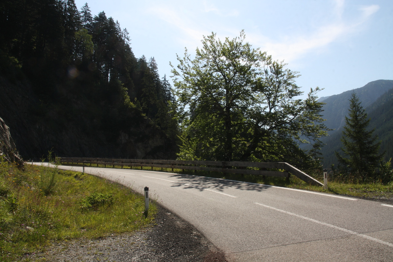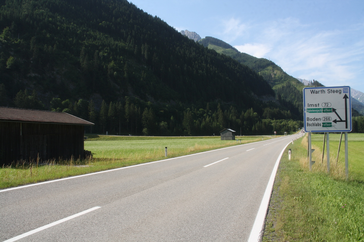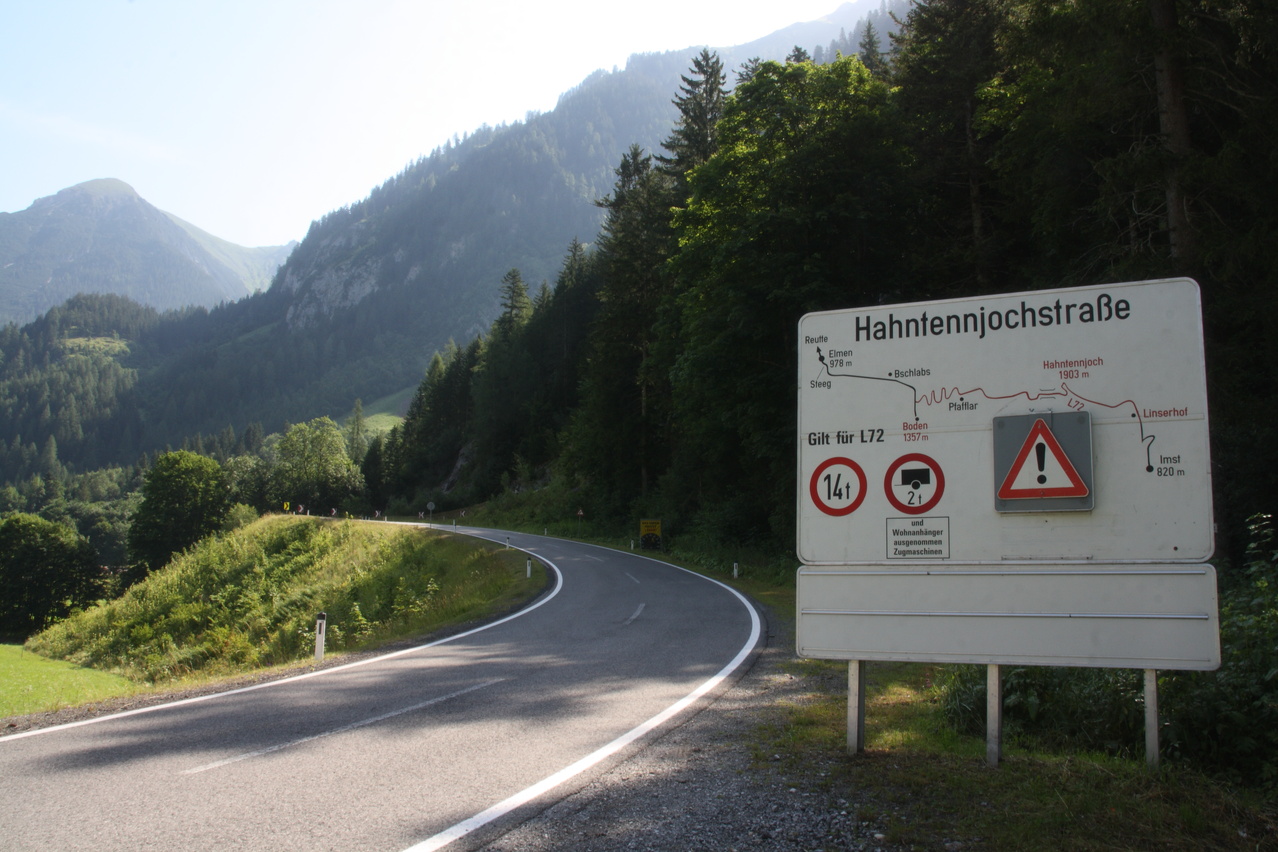 Beschreibung | An diesem Tag stand mit dem Hahntennjoch der erste schwere Pass auf dem Programm. Die Steigung der Passstraße zieht gleich ab dem Talgrund kräftig an und danach war auch wieder das gewöhnungsbedürftige Fahren am Abgrund angesagt. Da verlagert sich die Fahrlinie automatisch zur Mitte des Fahrstreifens hin, aber anders als in Deutschland akzeptieren die allermeisten Auto- und Motorradfahrer diese Fahrweise. Auf der anderen Seite macht man sobalt wie möglich Platz, wenn von hinten Brummis, Busse oder Trecker heran dröhnen. in Österreich, zumindest im Hochgebirge, läuft der Verkehr insgesamt deutlich entspannter als in Deutschland. Nach den ersten steilen Kilomern gibt es etwas Erholung für die Beine, was natürlich nicht bedeutet, dass die Straße nicht weiter steigt. Wirklich ätzend sind nur die verlorenen Höhenmeter oberhalb von Bschlabs. Nach zehn Kilometern ab Elmen ist dann allerdings Schluss mit lustig. Von den letzten fünf Kilometern bis zur Passhöhe steigen drei Kilometer mit durchschnittlich 10,9 % und die beiden übrigen sind auch nicht viel besser. Das saugt dann die letzte Energie aus den Beinen. Dafür gab es oben das erste richtige Alpenpanorama bei dieser Tour. Die Abfahrt ist dann eine Herausforderung für die Bremsen. Bis Imst sind kaum flachere Passagen vorhanden und am Ortseingang von Imst ist die Abfahrt noch lange nicht vorbei. Das steilste Stück mit Gefälle im durchweg zweistelligen Bereich bis zu 18,9 % zieht sich bis zum Ortskern. Imst ist nahezu komplett in den Hang gebaut. Daher sind dort alle Straßen steil, solange sie nicht parallel zum Hang verlaufen. Insgesamt ist das Hahntennjoch für voll beladene Trekkingräder nur sehr bedingt zu empfehlen, da es zu viele längere Steilstücke enthält. Von Elmen aus kommt man zwar noch leidlich rauf, aber dafür geht die Abfahrt auf's Material. Von Imst aus könnten gleich in Imst Probleme auftreten. Zudem wird das Hahntennjoch bei schlechtem Wetter wegen der großen Gefahr von Muren automatisch für den Verkehr gesperrt. Das ist zwar sicherer, kann aber eine ganze Tour durcheinander bringen. An diesem Tag wäre "Bremsenjoch" der treffendere Name für das Hahntennjoch gewesen, zum einen wegen der hohen Belastung der Fahrradbremsen in der Abfahrt und zum anderen wegen der ständigen Attacken von blutdurstigen Bremsen, die sich nur durch regelmäßige Insektenschutzmittel-Duschen einigermaßen auf Distanz halten ließen. |