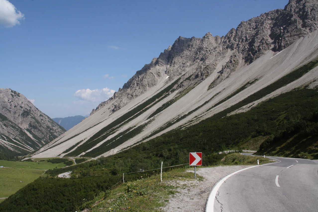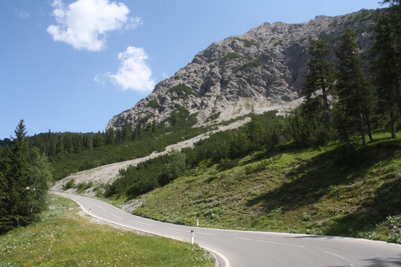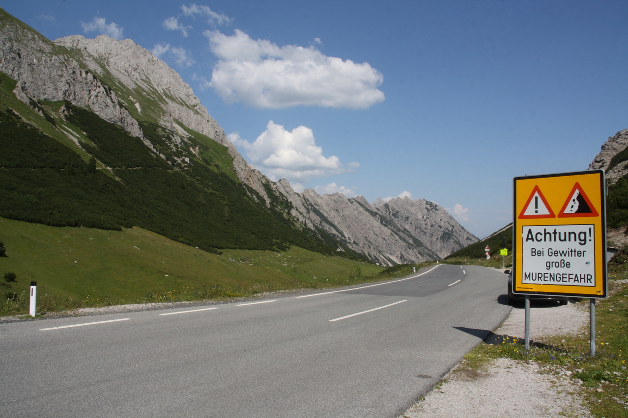 Beschreibung | An diesem Tag stand mit dem Hahntennjoch der erste schwere Pass auf dem Programm. Die Steigung der Passstraße zieht gleich ab dem Talgrund kräftig an und danach war auch wieder das gewöhnungsbedürftige Fahren am Abgrund angesagt. Da verlagert sich die Fahrlinie automatisch zur Mitte des Fahrstreifens hin, aber anders als in Deutschland akzeptieren die allermeisten Auto- und Motorradfahrer diese Fahrweise. Auf der anderen Seite macht man sobalt wie möglich Platz, wenn von hinten Brummis, Busse oder Trecker heran dröhnen. in Österreich, zumindest im Hochgebirge, läuft der Verkehr insgesamt deutlich entspannter als in Deutschland. Nach den ersten steilen Kilomern gibt es etwas Erholung für die Beine, was natürlich nicht bedeutet, dass die Straße nicht weiter steigt. Wirklich ätzend sind nur die verlorenen Höhenmeter oberhalb von Bschlabs. Nach zehn Kilometern ab Elmen ist dann allerdings Schluss mit lustig. Von den letzten fünf Kilometern bis zur Passhöhe steigen drei Kilometer mit durchschnittlich 10,9 % und die beiden übrigen sind auch nicht viel besser. Das saugt dann die letzte Energie aus den Beinen. Dafür gab es oben das erste richtige Alpenpanorama bei dieser Tour. Die Abfahrt ist dann eine Herausforderung für die Bremsen. Bis Imst sind kaum flachere Passagen vorhanden und am Ortseingang von Imst ist die Abfahrt noch lange nicht vorbei. Das steilste Stück mit Gefälle im durchweg zweistelligen Bereich bis zu 18,9 % zieht sich bis zum Ortskern. Imst ist nahezu komplett in den Hang gebaut. Daher sind dort alle Straßen steil, solange sie nicht parallel zum Hang verlaufen. Insgesamt ist das Hahntennjoch für voll beladene Trekkingräder nur sehr bedingt zu empfehlen, da es zu viele längere Steilstücke enthält. Von Elmen aus kommt man zwar noch leidlich rauf, aber dafür geht die Abfahrt auf's Material. Von Imst aus könnten gleich in Imst Probleme auftreten. Zudem wird das Hahntennjoch bei schlechtem Wetter wegen der großen Gefahr von Muren automatisch für den Verkehr gesperrt. Das ist zwar sicherer, kann aber eine ganze Tour durcheinander bringen. An diesem Tag wäre "Bremsenjoch" der treffendere Name für das Hahntennjoch gewesen, zum einen wegen der hohen Belastung der Fahrradbremsen in der Abfahrt und zum anderen wegen der ständigen Attacken von blutdurstigen Bremsen, die sich nur durch regelmäßige Insektenschutzmittel-Duschen einigermaßen auf Distanz halten ließen. |