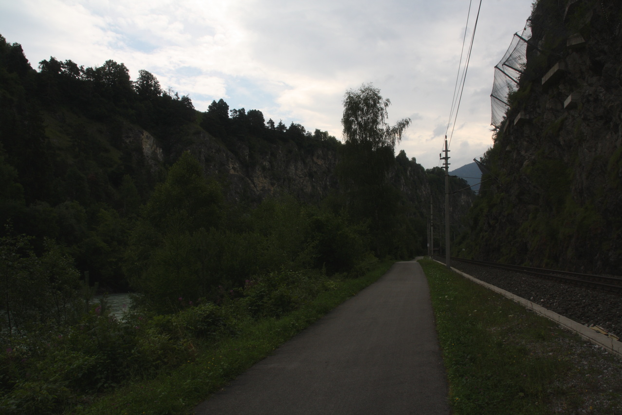 Beschreibung | Nach dem Hahntennjoch am Vortag stand eine trotz Bergankunft etwas leichtere Etappe auf dem Programm. Höhenmeter bot diese zwar auch reichlich, aber die verteilen sich auf eine längere Distanz vom Inn bis nach Zwieselstein. Erst von Sölden nach Zwieselstein liegt eine stärkere Steigung im Weg. Zunächst ging es noch gebremst ins Inntal, wo wegen des starken Verkehrs auf der in Frage kommenden Straße statt derer der Inntalradweg gewählt wurde, was allerdings einige zusätzliche Höhenmeter mit kurzen, aber steilen Rampen mit sich brachte. Etwas schwierig gestaltet sich auch der Wechsel vom Inntal ins Ötztal auf den dort schlecht bis gar nicht ausgeschilderten Radwegen. Nahe der Einmündung der Ötztaler Ache in den Inn durchquert der Radweg einen üblen Touristenrumsbums mit Musikberieselung von den Laternenmasten aus. Das braucht doch nun wirklich niemand! Zu allem Überfluss setzte nun auch noch Regen ein, dem bald ein heftiges Gewitter folgte, dessen Durchzug beim Mittagessen in Ötztalbahnhof abgewartet wurde. Nach einer Stunde war die Gewetterzelle zwar durchgezogen, aber der Regen blieb, und so wurde unter der Regenjacke weiter gefahren. Eine Schönwettergarantie für die Alpentouren ist nach wie vor nicht buchbar. Da es warm genug war, konnte unten herum "nass", also ohne Regenschutz, gefahren werden. Vollschutz wäre auch sehr unangenehm gewesen, da es nun bis ins Ziel mehr oder weniger bergauf ging. Bis Oetz folgte nun die erste Streckenwiederholung, dieses Teilstück wurde bereits bei der Alpentour 2009 gefahren, damals allerdings bei schönem Wetter. Da der Radweg mit Schotterbelag schlecht zu befahren war, wurde in Oetz wieder auf die Straße gewechselt, wobei die Route direkt am 2009 genutzten Quartier vorbei führte. Nachfolgend wurde der Radweg nur genutzt, wenn dieser asphaltiert war und parallel zur Straße verlief. Wenigstens hörte nach gut drei Stunden der Regen auf. Bis Sölden steigt die Straße nur leicht an, gewinnt aber wegen der Länge trotzdem beachtlich an Höhe. Sölden selbst, dass für seinen winterlichen Skirumsbums (Einkehrschwung, Apres Ski, …) weithin bekannt ist, machte an dem Tag einen eher verschlafenen Eindruck. Nach dem Anstieg ab Sölden fing es kurz vor Zwieselstein wieder an zu regnen, weshalb es vom Zielort und Dach der Etappe Zwieselstein auch kein Bild gibt. |