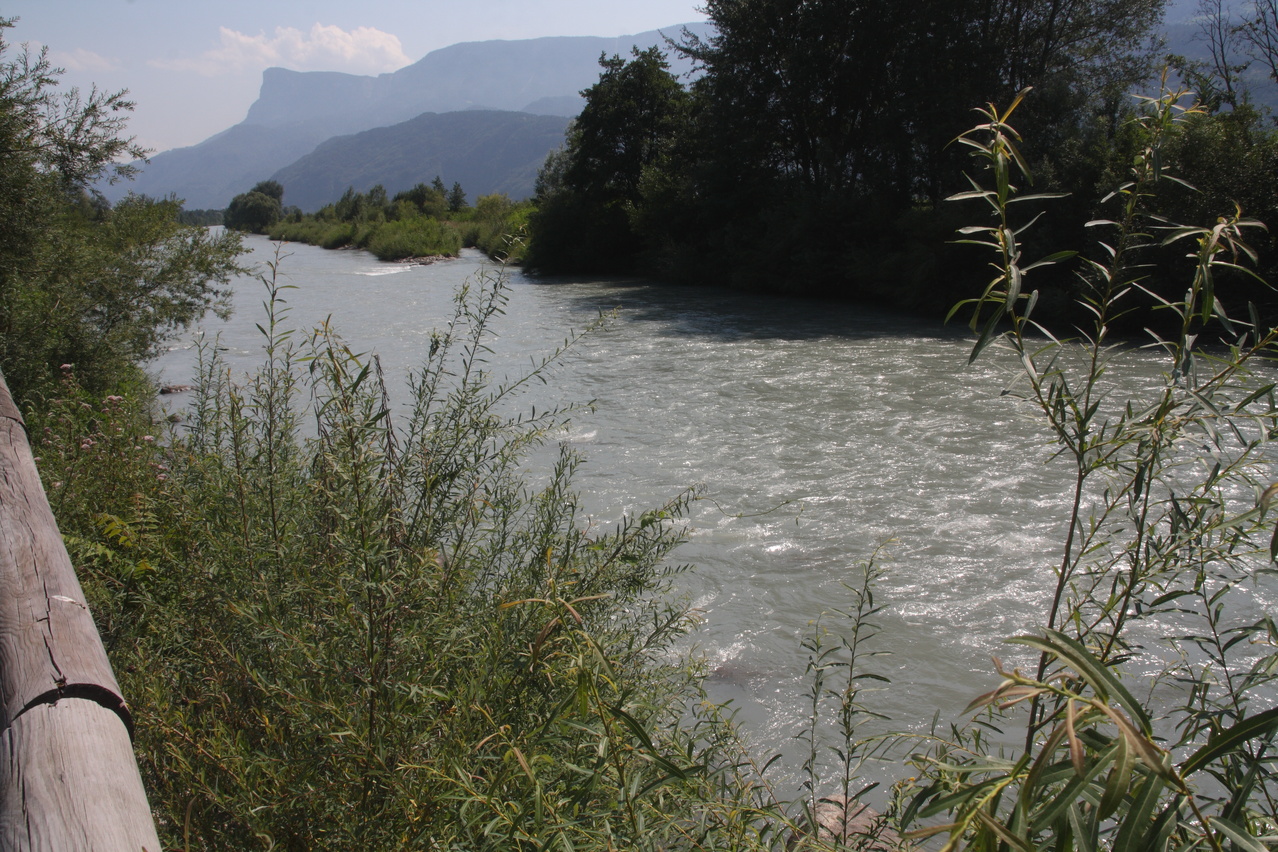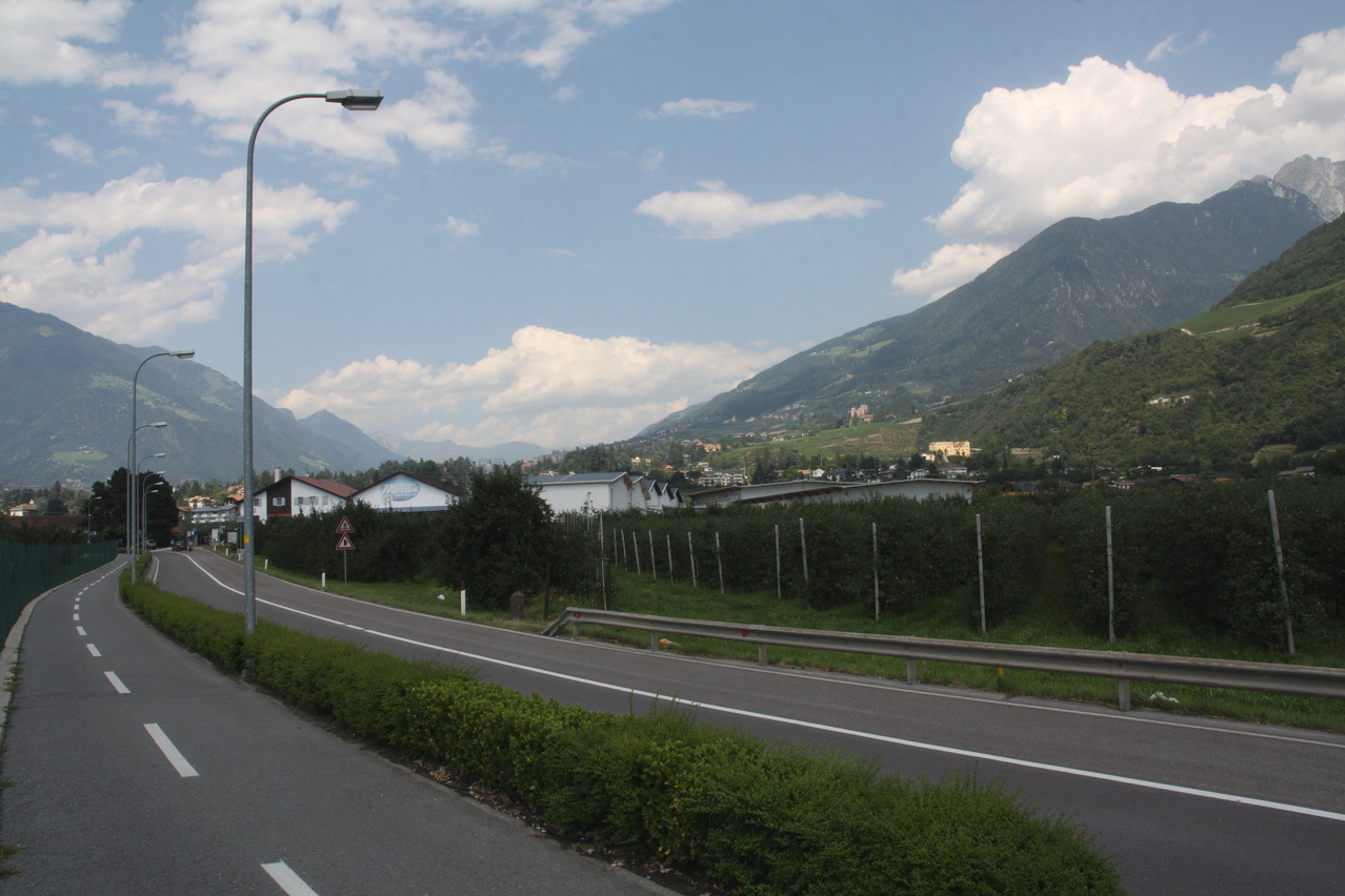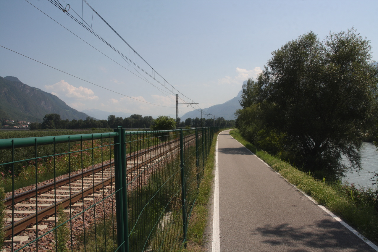 der Etschtalradweg, über längere Strecken eingezwängt zwischen Etsch und Bahntrasse ![]() 300 dpi JPEG |