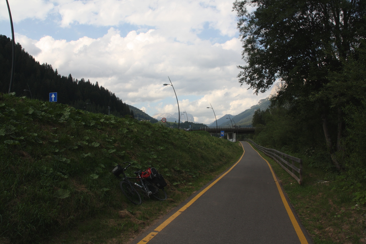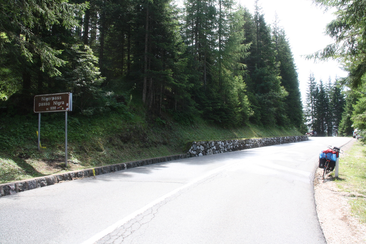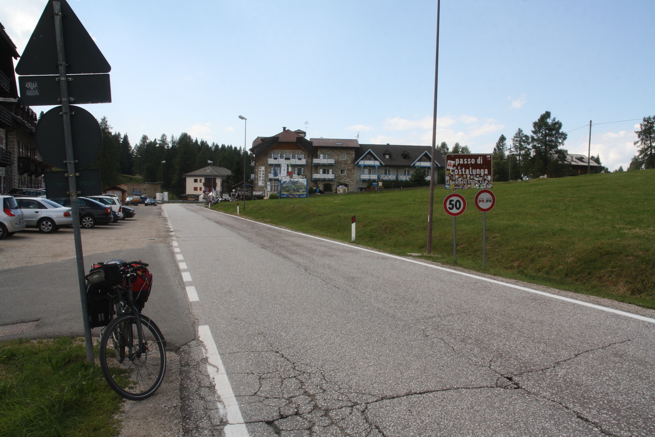 Beschreibung | Da weit und breit keine Werkstatt in der Nähe war, musste das Risiko eines Ausfalls des Freilaufs und damit das Ende der Weiterfahrt in Kauf genommen werden. In diesem Fall wären die Alternativen eine Busfahrt, sofern der Bus Fahrräder mitgenommen hätte, oder das Hinunterrollen zurück nach Bozen gewesen. Vor diesem Hintergrund wurde auch auf den Versuch verzichtet, mit dem beladenen Fahrrad die bis zu 20 % steile Rampe in St. Cyprian komplett hochzudrücken. Das Hochschieben nach dem ersten Anhalten in der Rampe aus der Fahrt heraus war allerdings nicht weniger anstrengend, dafür aber demotivierend. Im weiteren Verlauf Richtung Nigerpass wurde auch noch eine bis zu 14 % steile Rampe teilweise schiebend überwunden. Dafür blieb es an dem Tag bei drei behebbaren Aussetzern des Freilaufs, und die Tour konnte wie geplant fortgesetzt werden. Der Nigerpass ist etwas seltsam, denn das Schild an der Straße steht nicht auf einer Passhöhe. Die Straße steigt Richtung Karerpass wenn auch nur leicht noch um weitere 84 Höhenmeter an. Kurz vor dem Karerpass fällt die Straße in eine Senke ab, wo sie dann in die Straße zum Karerpass einmündet. Diese Straße steigt dann recht stramm zum Karerpass an, dafür sind es wenigstens nicht mehr so viele Höhenmeter bis zur Passhöhe. Mit der Überquerung des Karerpasses von West nach Ost erfolgte auch der Wechsel von der Provinz Südtirol in die Provinz Trentino. Ab jetzt drohte also wieder die Sprachbarriere zu einem Problem zu werden. Von der Ostrampe des Karerpasses fiel der Blick auf Berge, die bei der Alpentour 2010 schon aus anderen Perspektiven zu sehen gewesen waren, so die Marmolada, den höchsten Berg der Dolomiten, und die Gruppo del Sella, die am 28.07.2010 auf der Westseite halb umrundet worden war. Im Val di Fassa wurde die extrem stark befahrene Straße bei erstbester Gelegenheit verlassen und auf den asphaltierten Radweg, die "Pista ciclabile Dolomiti di Fiemme e Fassa" gewechselt, der bis Ziano di Fiemme nicht mehr verlassen wurde. |