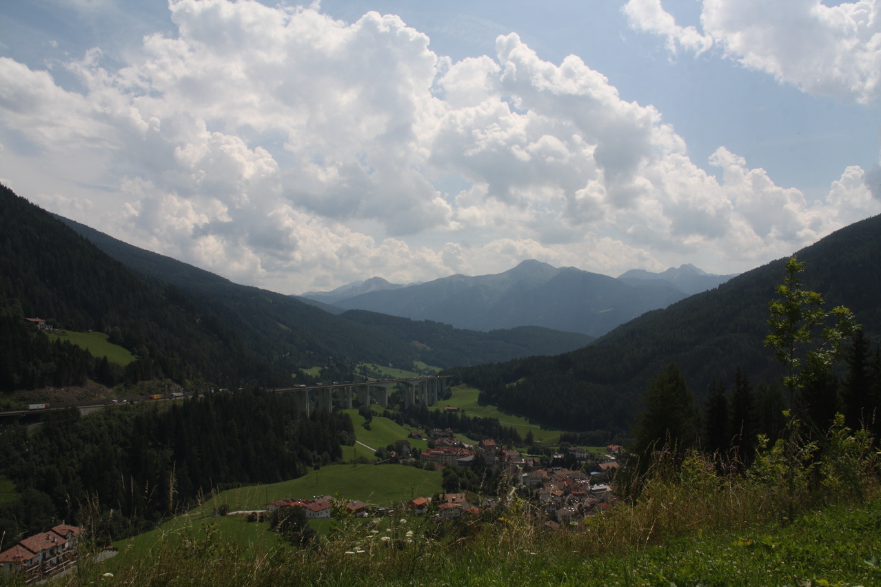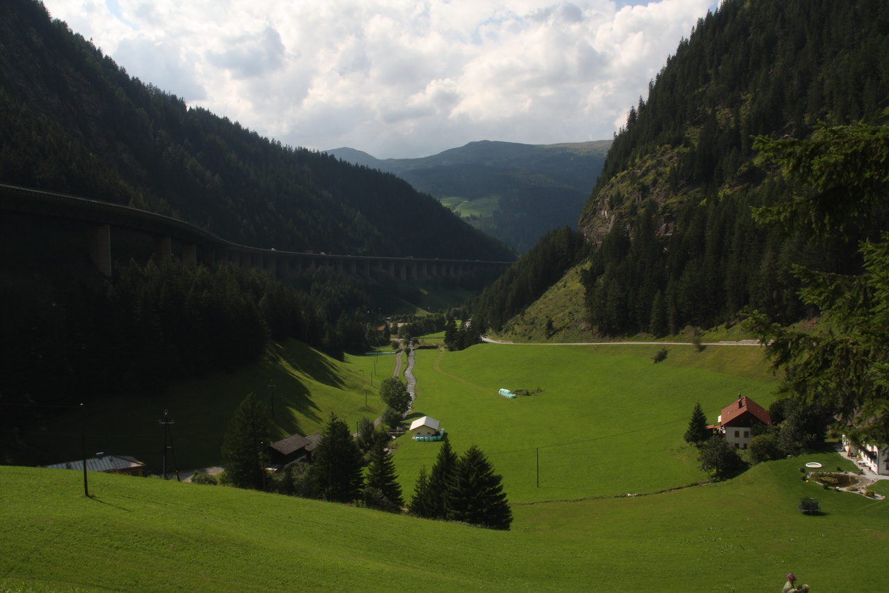Verkehrswege im Oberen Wipptal, v. l. n. r.: Brennerautobahn A22, Staatsstraße 12 (Brennerstraße), Brennerbahn, Brennerradweg ![]() 300 dpi JPEG |