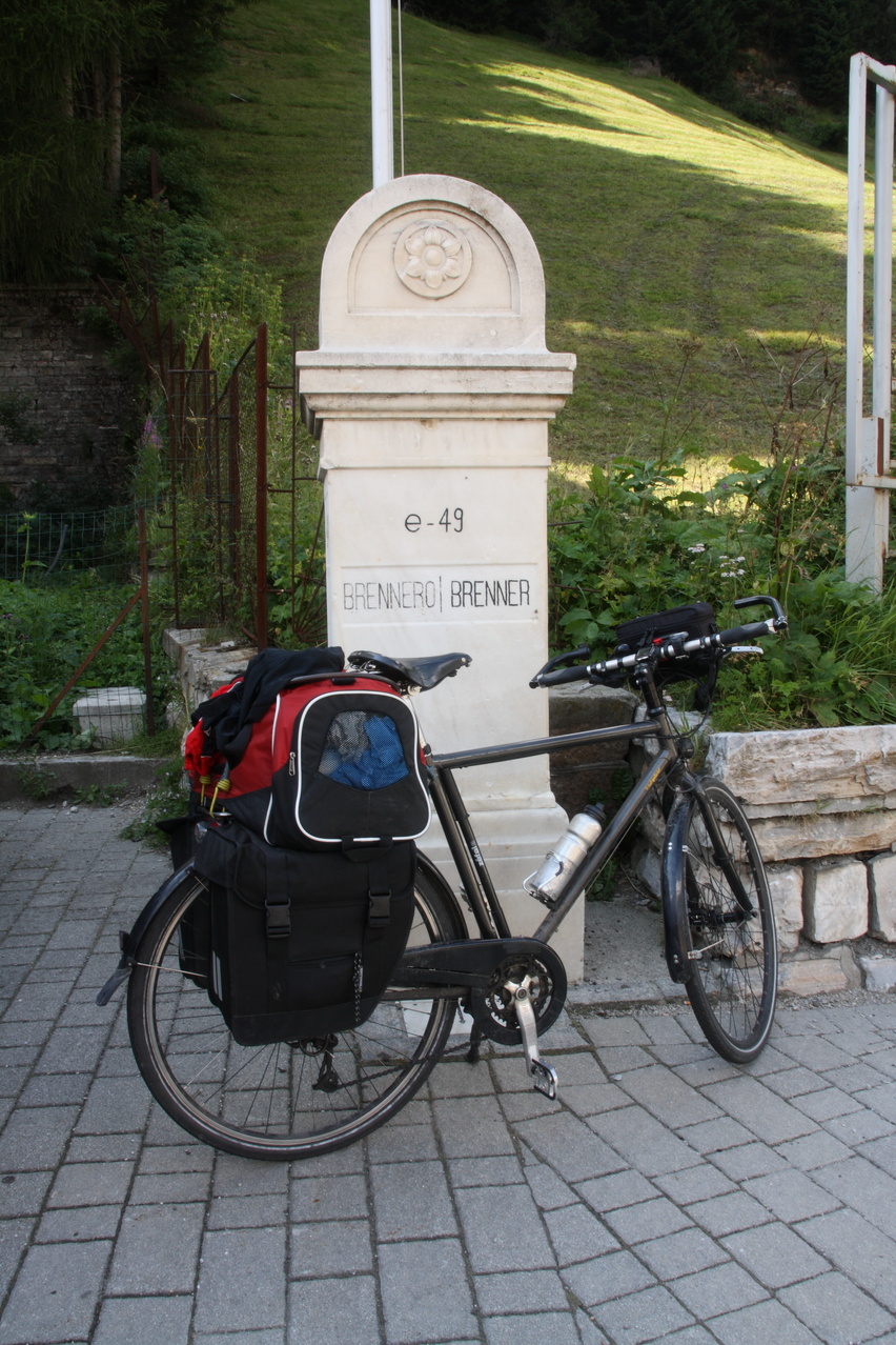 Beschreibung | Vor der Weiterfahrt wurde noch mal kurz die Werkstatt angefahren, wo am Tag zuvor der Ersatzbremssattel beschafft worden war, um dessen Einstellung zu überprüfen. Mit dieser Etappe folgte eine inverse Streckenwiederholung. Der Abschnitt Sterzing – Innsbruck wurde in umgekehrter Richtung am 26.07.2010 gefahren. Nach der schlecht ausgeschilderten Ausfahrt aus Sterzing Richtung Brennerpass wurde von der Straße auf den Radweg gewechselt, der im Gegensatz zum Jahr 2010 bis auf wenige Meter Feldweg mit sehr schlechtem Belag mittlerweile komplett asphaltiert ausgebaut ist. Dieser Wechsel stellte sich als Fehler heraus, denn dieser Radweg bringt mehrere steile Rampen bergauf und bergab mit sich, die die Straße weg lässt. Bei Ried lauern Steigungen und Gefälle mit bis zu 17 %. Mit dem beladenen Trekkingrad sollte daher, wenn der Verkehr es zulässt, zwischen Sterzing, Gossensaß und Vallming die Straße benutzt werden, bevor dort auf den Radweg gewechselt wird. Auch dort geht es in mehreren Serpentinen mit bis zu 13 % Steigung rauf zur alten Brennerbahntrasse. Ab dort lässt sich der Radweg aber sehr entspannt fahren, da die Steigung bis zur Passhöhe bahntypisch sehr moderat ausfällt. Die Abfahrt nach Innsbruck ist dafür weniger angenehm. Steile Passagen, die die Bremsen fordern, wechseln mit fast flachen Passagen, in denen kein Rollen mehr möglich ist, und zu allem Überfluss liegt in Steinach am Brenner auch noch eine leichte Gegensteigung. Bei der Einfahrt nach Innsbruck zog ein heftiges Gewitter auf, dass abgewartet wurde. Bei nachlassendem Regen musste dann erst mal die Auffahrt auf den Inntalradweg gefunden werden. Dort konnte dann dank des flachen Profils und des wohl auch wetterbedingt geringen Verkehrs Tempo gebolzt werden. Vor Unterperfuss war die Bahnunterführung abgesoffen, aber Alternativen gab es keine. Da der Weg durch das Wasser, dass an der tiefsten Stelle ca. 30 cm hoch stand, noch zu erkennen war, wurde zurück gesetzt, angetreten und durch gerollt. Im Quartier mussten die Packtaschen dann erst mal komplett geleert und zum Trocknen aufgestellt werden. Hier bewährte sich, in den Packtaschen nur Dinge zu verstauen, die entweder nass werden dürfen oder durch Plastiktüten vor Nässe geschützt sind. |