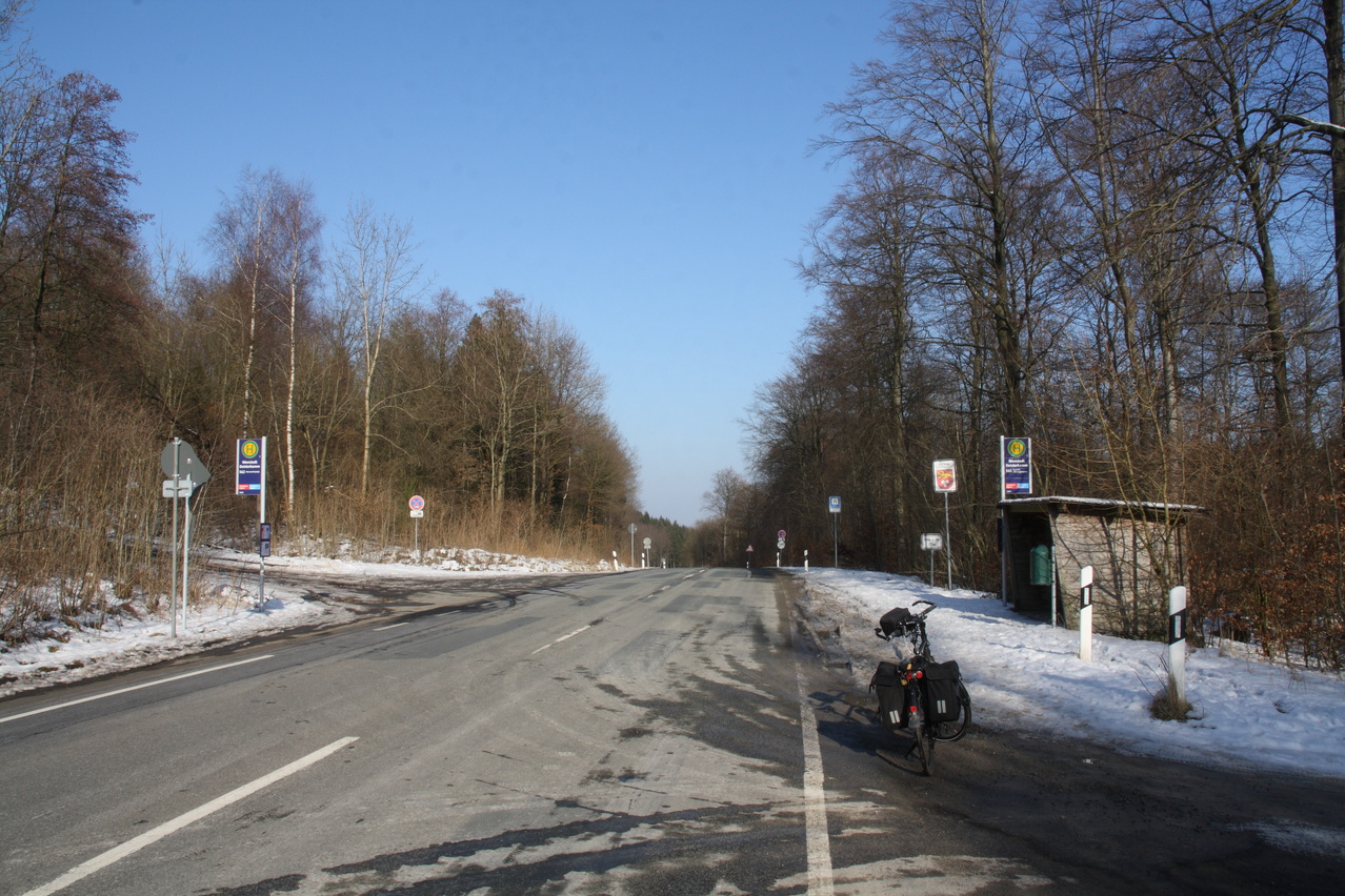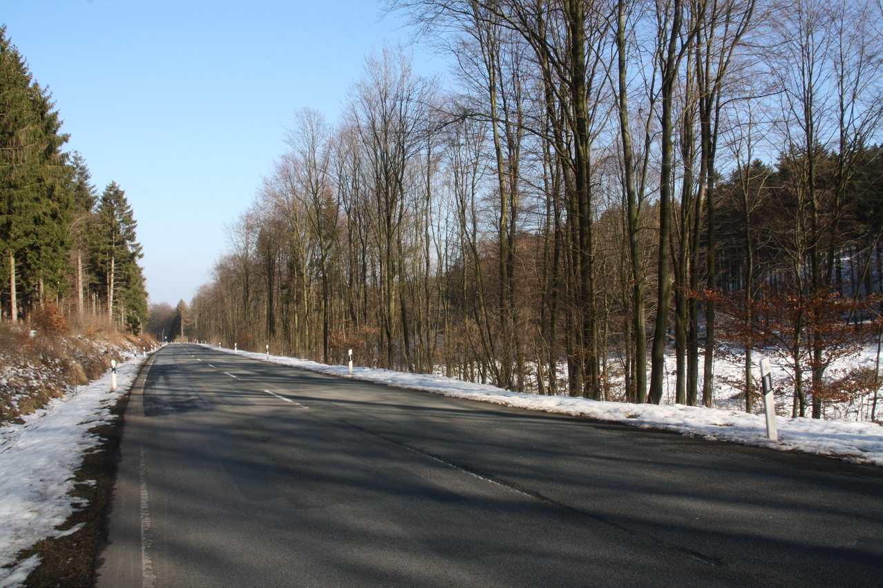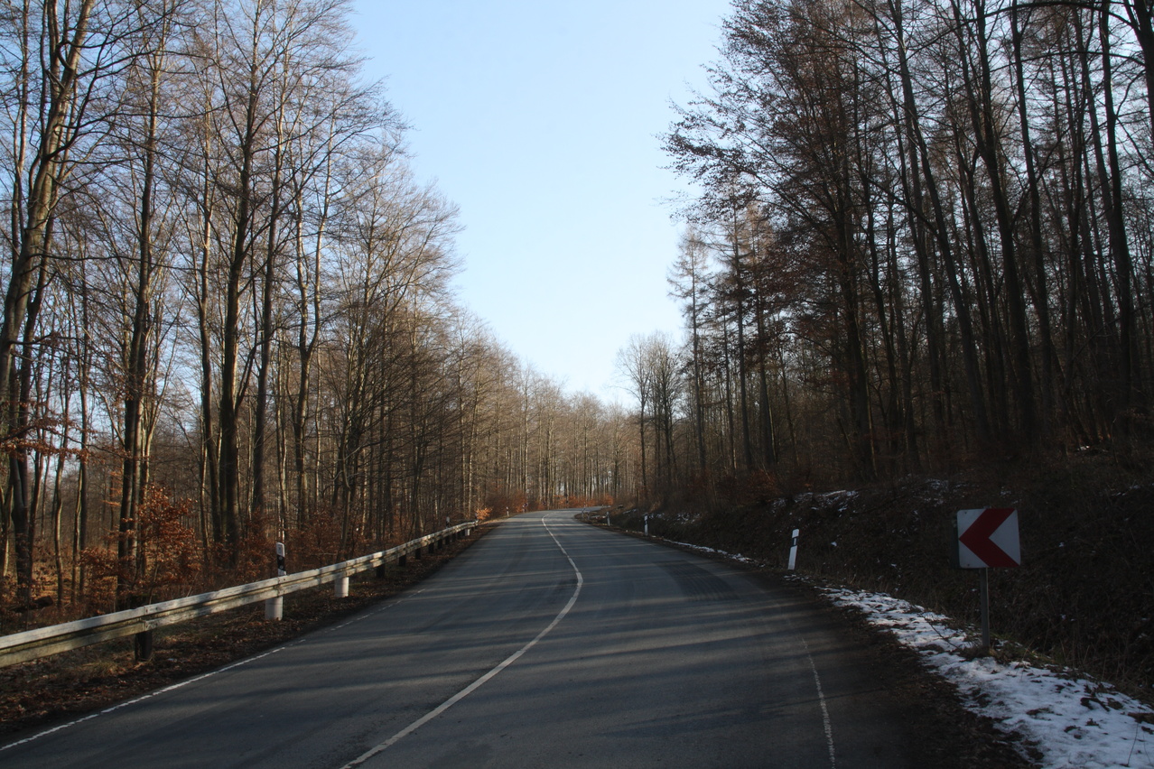 Beschreibung | Dies war der erste Tag, der vom Wetter her eine längere Tour erlaubte. Im Verlauf der Fahrt zum Nienstedter Pass gewann jedoch zunehmend die Farbe Weiß in der Landschaft Oberhand. Der Winter hielt sich extrem hartnäckig. Auf der Passhöhe herrschte noch Winter. Da der Parkplatz zwischen Passhöhe und Kammweg mit einer ekligen, mehrere Zentimeter dicken Schicht aus Eis, Schnee und Schneematsch bedeckt war, war an eine Weiterfahrt auf dem Kammweg Richtung Annaturm nicht zu denken. Daher blieb nur der Rückweg. Unten lag zwar kein Schnee mehr, dafür war die Landschaft aber für Anfang März extrem kahl und braun. Vom Grün des Frühlings fehlte jede Spur. |