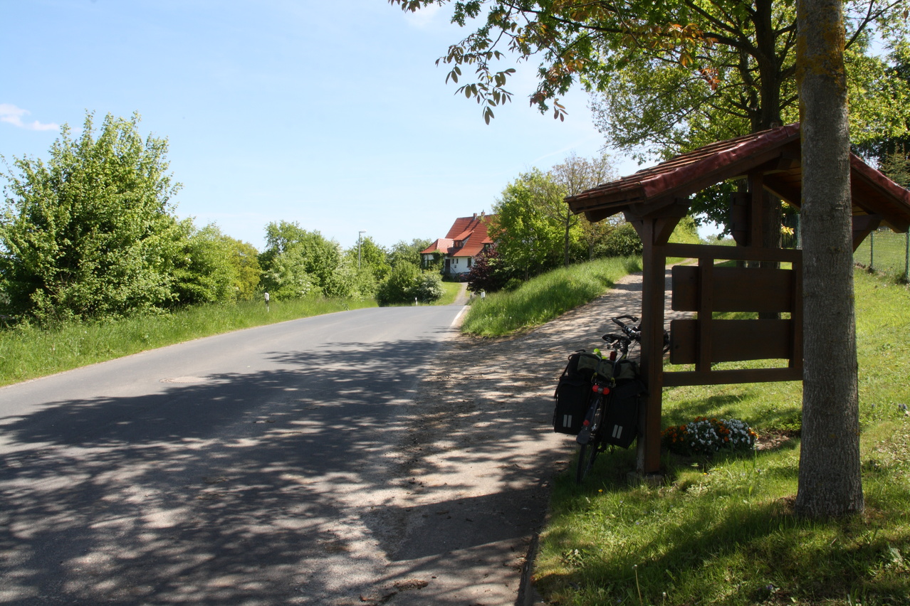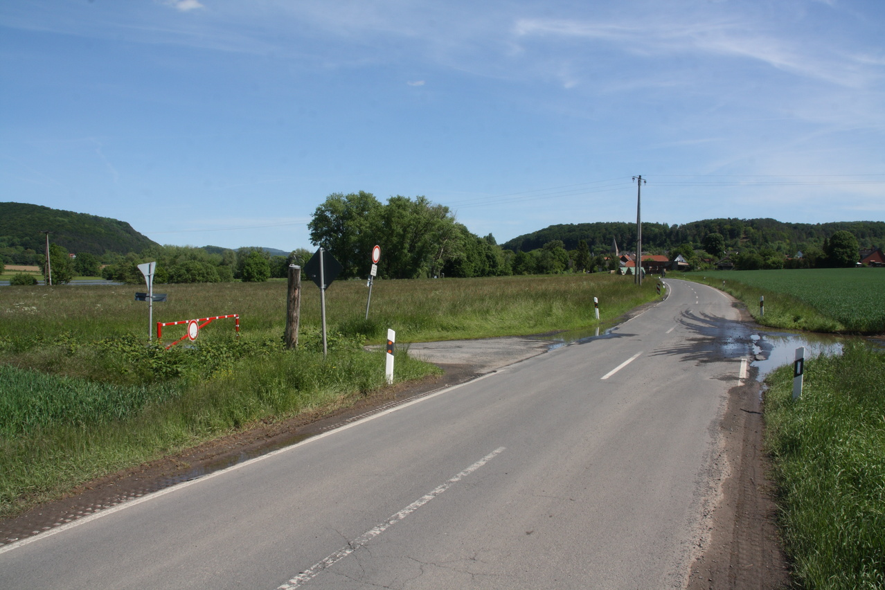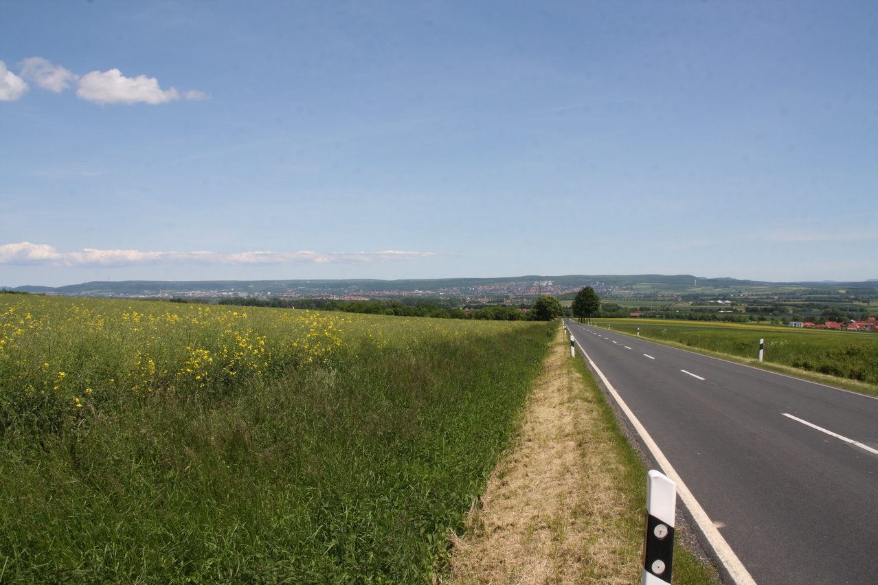 Beschreibung | Bei hochsommerlichen Temperaturen und fast wolkenlosem Himmel führte die erste Etappe dieser dreitägigen Tour vom südlichen Niedersachsen bis ins Nordhessische Bergland. Die Fahrt aus Göttingen heraus gestaltet sich schwierig, da die niedersächsischen Radverkehrsplaner anscheinend eine Abscheu gegenüber jeglichen Anstiegen haben und den Fahrradverkehr in Göttingen und umzu daher schon fast mit Gewalt im Leinetal halten wollen. Ist der Anstieg nach Jühnde aber erst mal gefunden, liegt der städtische Verdichtungsraum um Göttingen im Nacken. An dem Tag herrschte extrem gute Fernsicht. Sowohl der Brocken im Harz als auch der Hohe Meißner waren zu sehen. Nach dem ersten Anstieg folgte von Meensen die Abfahrt ins Werratal. Dort führte die Werra immer noch reichlich Wasser vom letzten Hochwasser. Der Werraradweg führte daher auch streckenweise direkt am Wasser entlang. In Blickershausen wurde auf die Straße nach Ermschwerd gewechselt, die gerade vom Hochwasser freigegeben worden war. Den Werraradweg hätte man dort nur mit einem Boot befahren können. In Ermschwerd begann der zweite Anstieg der Etappe zum Umschwang, einem Bergpass — na ja, "Bergpass" ist natürlich relativ zum Rest der Umgebung zu betrachten —, dessen Passhöhe fast den südlichsten Punkt Niedersachsens markiert, dessen beide Rampen aber nahezu vollständig auf hessischem Gebiet verlaufen. Auf dem Weg von Oberkaufungen nach Helsa ertönte aus dem Wald gelegentlich ein ratterndes Geräusch, das von der Überlandstraßenbahn zwischen Kassel und Helsa herrührte. Für ein Foto davon hätte aber wegen der durch dichten Wald verlaufenden Bahnstrecke gezielt auf einen Straßenbahnzug gewartet werden müssen, was dann doch etwas zu lange gedauert hätte. |