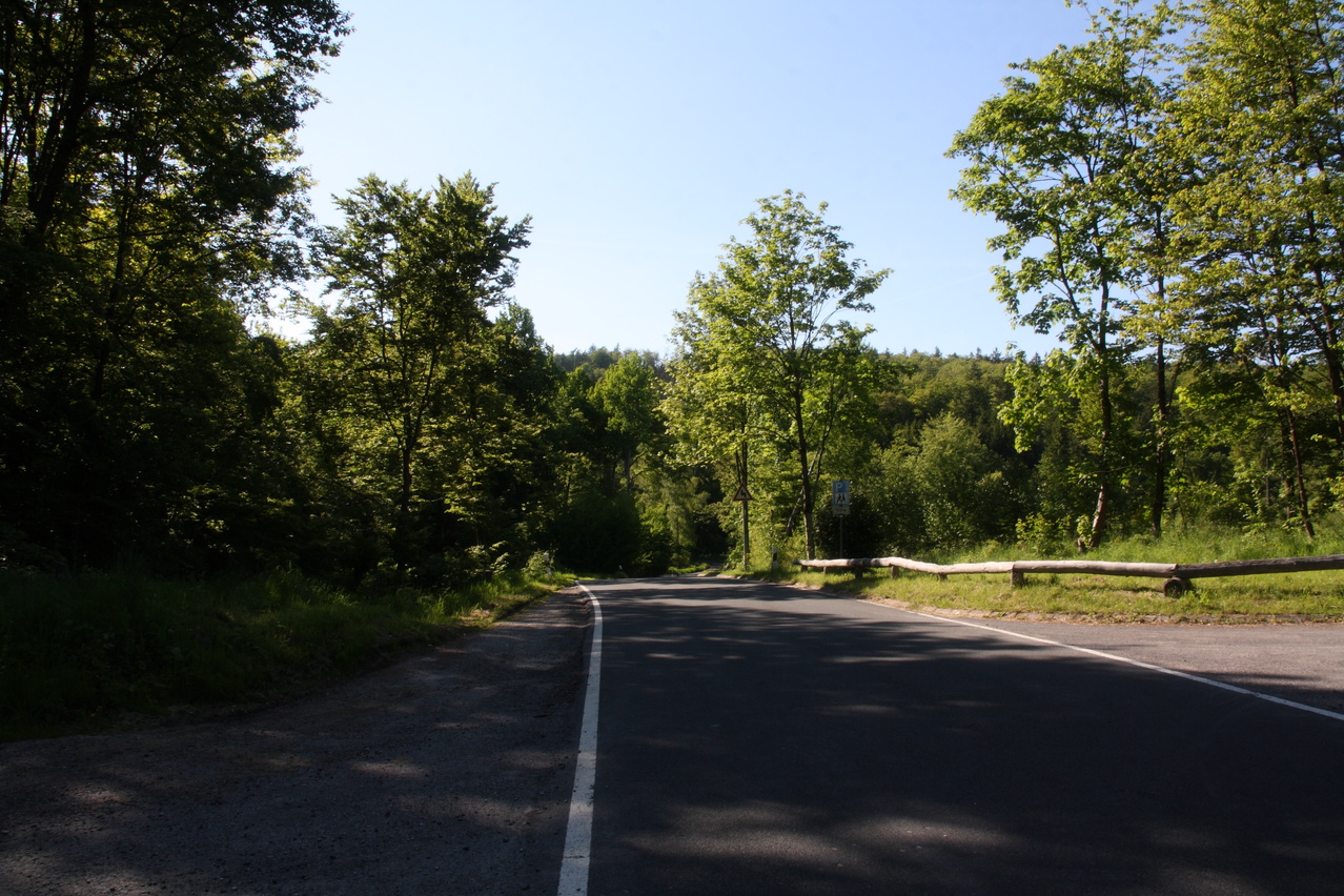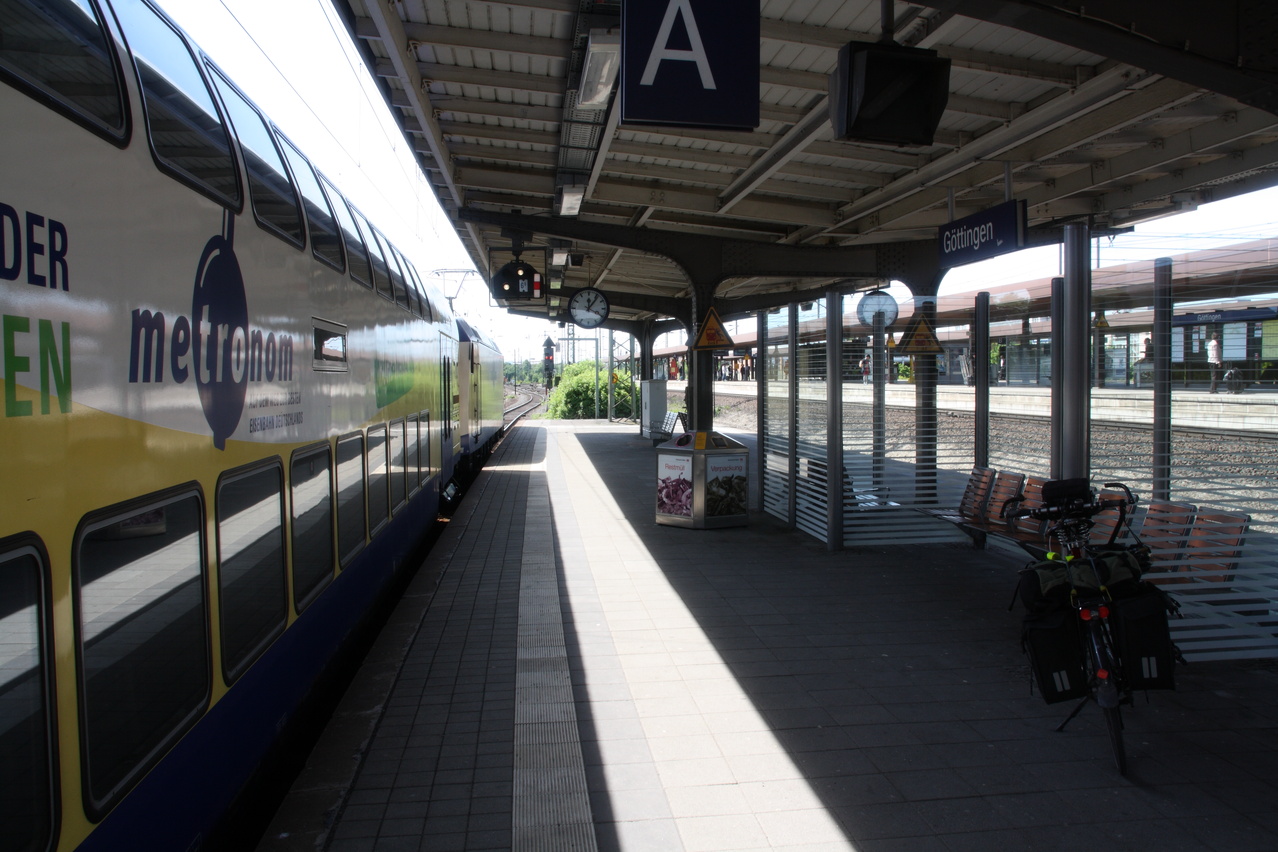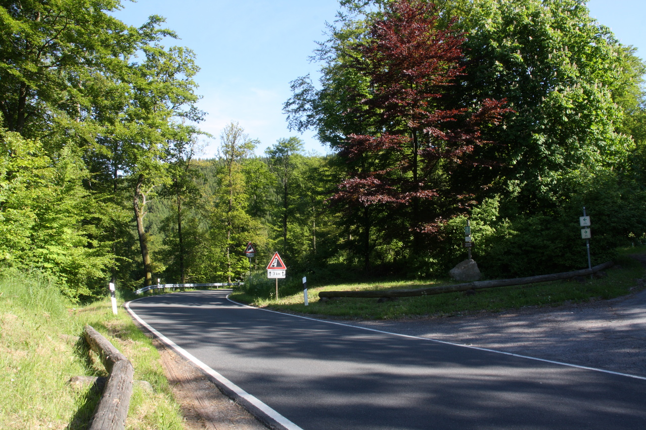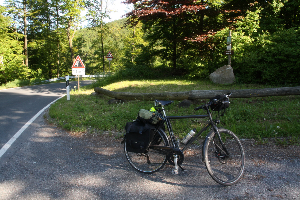 Beschreibung | Bei hochsommerlichen Temperaturen und fast wolkenlosem Himmel führte die erste Etappe dieser dreitägigen Tour vom südlichen Niedersachsen bis ins Nordhessische Bergland. Die Fahrt aus Göttingen heraus gestaltet sich schwierig, da die niedersächsischen Radverkehrsplaner anscheinend eine Abscheu gegenüber jeglichen Anstiegen haben und den Fahrradverkehr in Göttingen und umzu daher schon fast mit Gewalt im Leinetal halten wollen. Ist der Anstieg nach Jühnde aber erst mal gefunden, liegt der städtische Verdichtungsraum um Göttingen im Nacken. An dem Tag herrschte extrem gute Fernsicht. Sowohl der Brocken im Harz als auch der Hohe Meißner waren zu sehen. Nach dem ersten Anstieg folgte von Meensen die Abfahrt ins Werratal. Dort führte die Werra immer noch reichlich Wasser vom letzten Hochwasser. Der Werraradweg führte daher auch streckenweise direkt am Wasser entlang. In Blickershausen wurde auf die Straße nach Ermschwerd gewechselt, die gerade vom Hochwasser freigegeben worden war. Den Werraradweg hätte man dort nur mit einem Boot befahren können. In Ermschwerd begann der zweite Anstieg der Etappe zum Umschwang, einem Bergpass — na ja, "Bergpass" ist natürlich relativ zum Rest der Umgebung zu betrachten —, dessen Passhöhe fast den südlichsten Punkt Niedersachsens markiert, dessen beide Rampen aber nahezu vollständig auf hessischem Gebiet verlaufen. Auf dem Weg von Oberkaufungen nach Helsa ertönte aus dem Wald gelegentlich ein ratterndes Geräusch, das von der Überlandstraßenbahn zwischen Kassel und Helsa herrührte. Für ein Foto davon hätte aber wegen der durch dichten Wald verlaufenden Bahnstrecke gezielt auf einen Straßenbahnzug gewartet werden müssen, was dann doch etwas zu lange gedauert hätte. |
