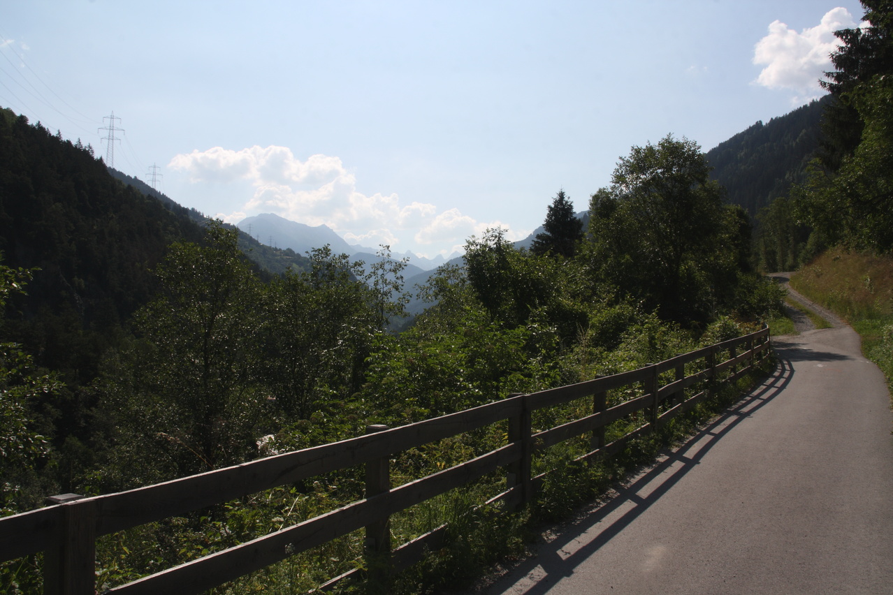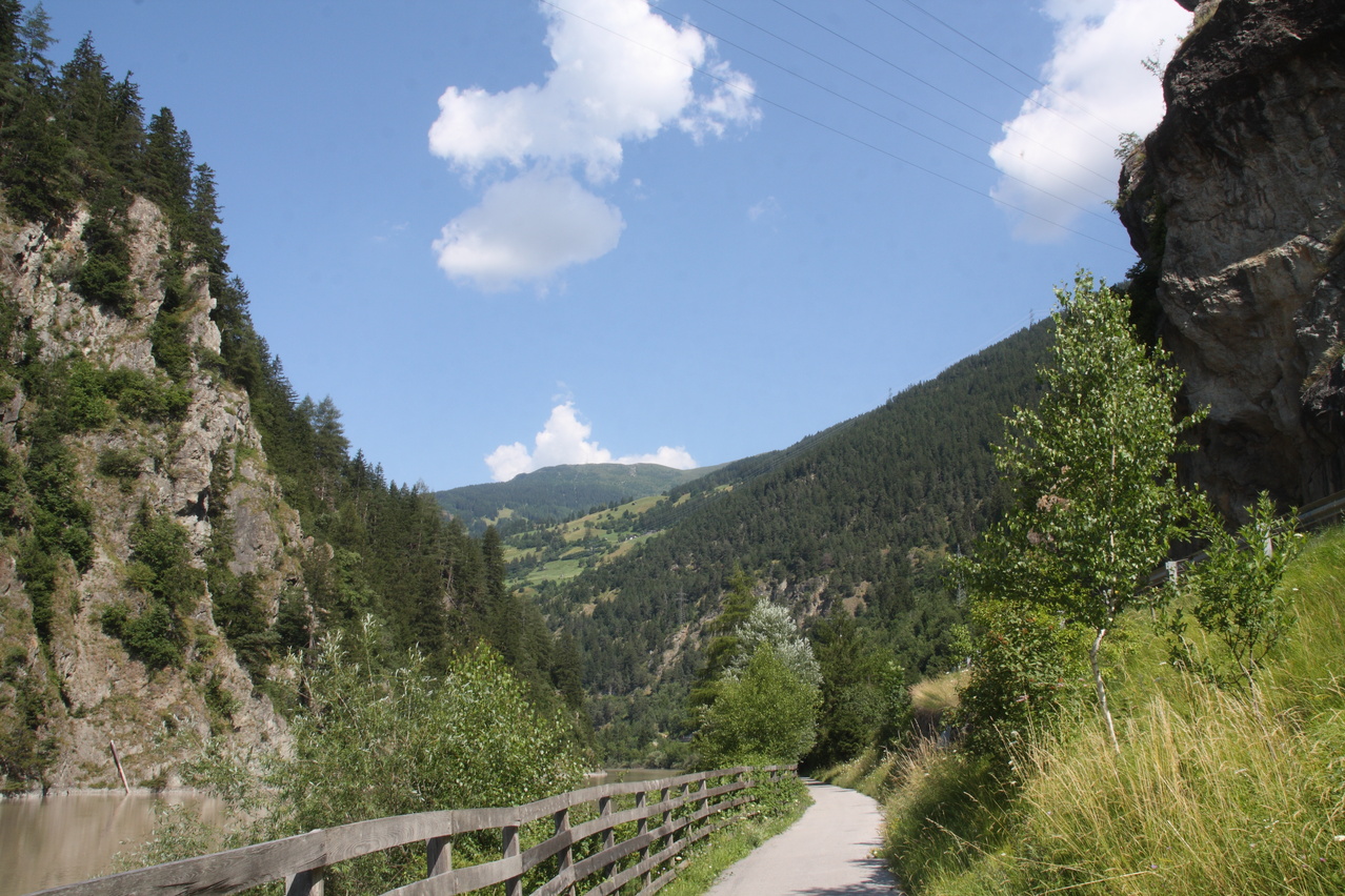 Beschreibung | Endlich war es soweit, die erste richtige Etappe der Alpentour 2013 wurde gestartet. Die Sonne sorgte rasch dafür, dass im Oberinntal feuchtheiße Luft stand. Anders als im Jahr 2008 wurde gleich ab Landeck der Inntalradweg genutzt. War der Inntalradweg im Jahr 2008 noch eine Option gewesen, so war er dieses Mal ab Ried im Oberinntal Pflicht, da die Straße ab dort für Fahrradfahrer gesperrt ist. Dafür ist der Inntalradweg nun durchgängig von Landeck bis zur Kajetansbrücke ausgebaut und beschildert. Der große Vorteil des Inntalradweges besteht darin, dass bis auf wenige Streckenabschnitte, wo er auf Nebenstraßen geführt wird oder er aus Platzgründen direkt neben der Straße verläuft, kein Stinkeverkehr die Fahrt stört. Dem steht als Nachteil gegenüber, dass er streckenweise wellig verläuft, was zusätzliche Höhenmeter ohne effektiven Höhengewinn mit sich bringt. Für die erste Etappe, die auch zum "Einrollen" diente, war das nicht optimal, aber dafür boten sich Ausblicke, die sich von der Straße aus im Jahr 2008 nicht geboten hatten. Außerdem ersparte die Nutzung des Inntalradweges bis zur Kajetansbrücke eine Fahrt auf der selben Strecke wie im Jahr 2008. Südlich der Kajetansbrücke führen zwei steile Kehren zur Reschenstraße nach Nauders, die hier nun das Oberinntal Richtung Reschenpass verlässt. Bis Nauders ist aus Platzgründen kein Radweg vorhanden. Nach der letzten Engstelle bei der Festung Nauders war auch die stickige Luft im Oberinntal Vergangenheit. Die Etappe endete mit einer Bergankunft in Nauders. Obwohl das zeitlich machbar gewesen wäre, wurde absichtlich nicht Reschen als Etappenziel gewählt, um die 02. Etappe nicht gleich mit einer längeren Abfahrt beginnen zu müssen. Abends zog von Westen her Regen auf, was nach der schwülen Hitze des Tages nicht weiter verwunderlich war. Anders als im Jahr 2008 funktionierte dieses Mal die Kamera, so dass es endlich Bilder von der Nordrampe des Reschenpasses gibt. |