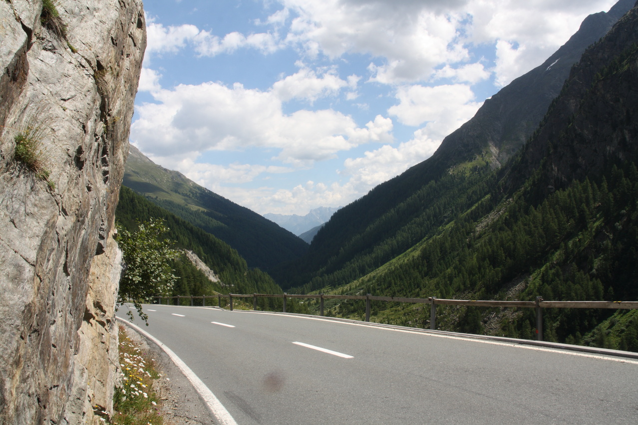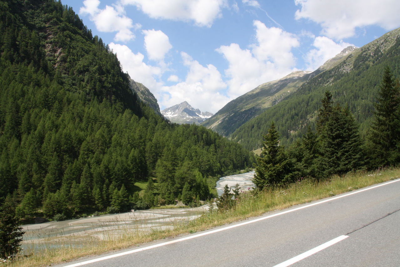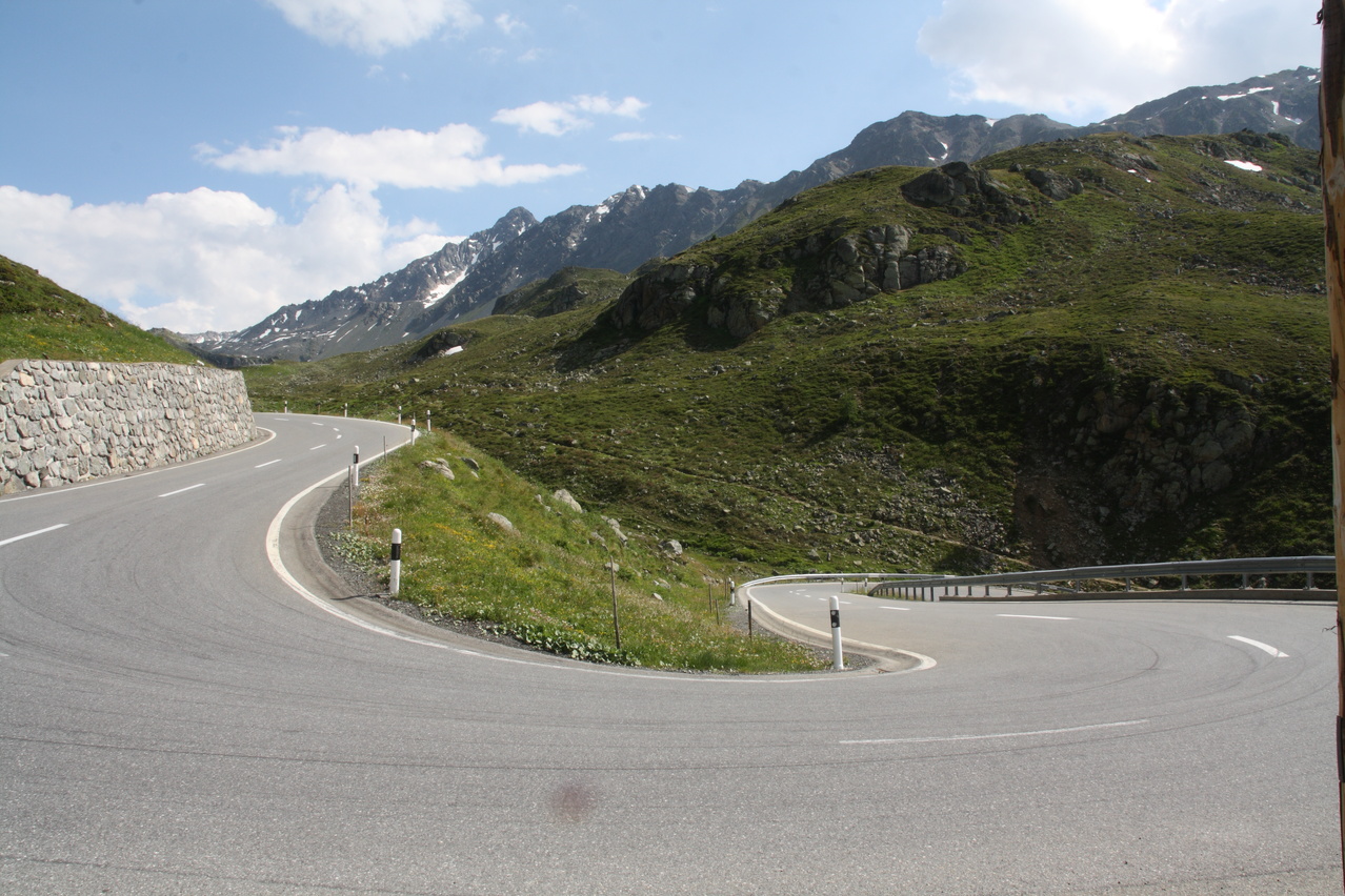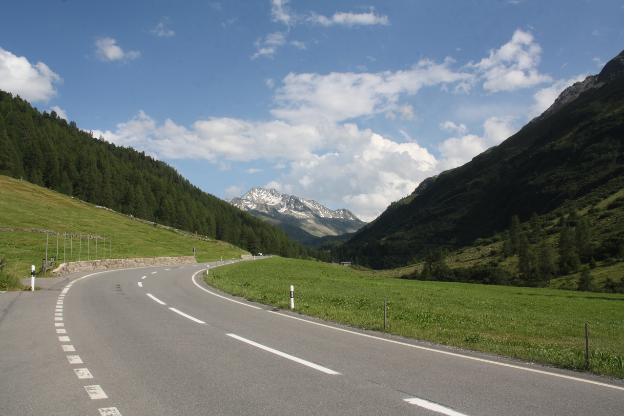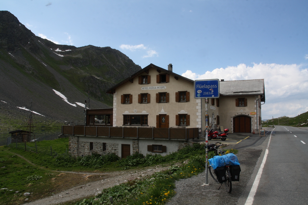 Beschreibung | Mit dem Flüelapass stand zwar nicht die Königsetappe, aber unter'm Strich wohl doch die schwerste Etappe an, denn die 955 Höhenmeter bergauf von Susch zur Passhöhe sind auf nur 13 Kilometer verteilt, was einer mittleren Steigung von 7,3 % entspricht. Da viele Schweizer Bergpässe noch zu Zeiten der Pferdefuhrwerke trassiert wurden, sind längere Abschnitte mit Steigungen über 10 % selten, was natürlich auch auf dem Fahrrad von Vorteil ist. Dafür gibt es am Flüelapass auf der Ostrampe praktisch keine flacheren Abschnitte. Man muss also gleich zu Beginn einen Rhythmus finden, den man bis oben hin durchhalten kann. Mit dem Flüelapass wurde das "Dach der Tour" erreicht, aber da noch drei weitere über 2000 Meter hohe Pässe auf dem Tourplan standen, war das nicht störend oder demotivierend. Äußerst lästig war natürlich, dass knapp einen Kilometer vor der Passhöhe Regen aufzog. Da dort weit und breit keine Möglichkeit bestand für die Dauer des Regenschauers unterzuziehen, wurden Helmüberzieher und Regenjacke angelegt und weiter gefahren. "Unten rum nass" wurde bei der Bergauffahrt in Kauf genommen. Auf der Passhöhe wurde die Pause etwas in die Länge gezogen, damit Fahrradhose, Socken und Schuhe trocknen konnten. Der Regen zog zwischenzeitlich auch ab und der Rest des Tages blieb trocken. In Davos-Dorf gestaltete sich die Ortsdurchfahrt etwas schwierig, da ein Volksfest die Durchgangsstraße blockierte. Derartige Verzögerungen so kurz vor dem Nachtquartier sind dann doch etwas nervig. |