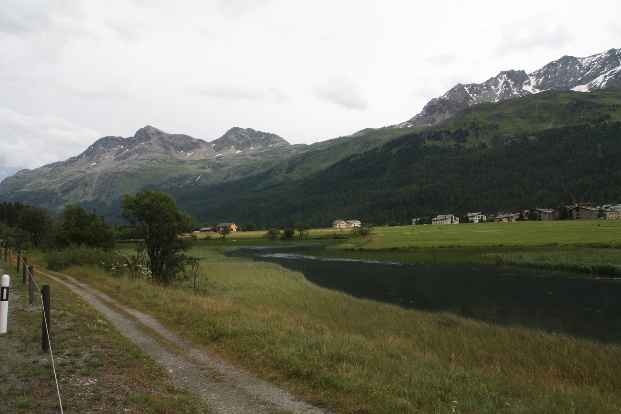 Blick über den Inn auf v. l. n. r.: den Piz Surlej, den Munt Arlas und Sils-Maria ![]() 300 dpi JPEG |