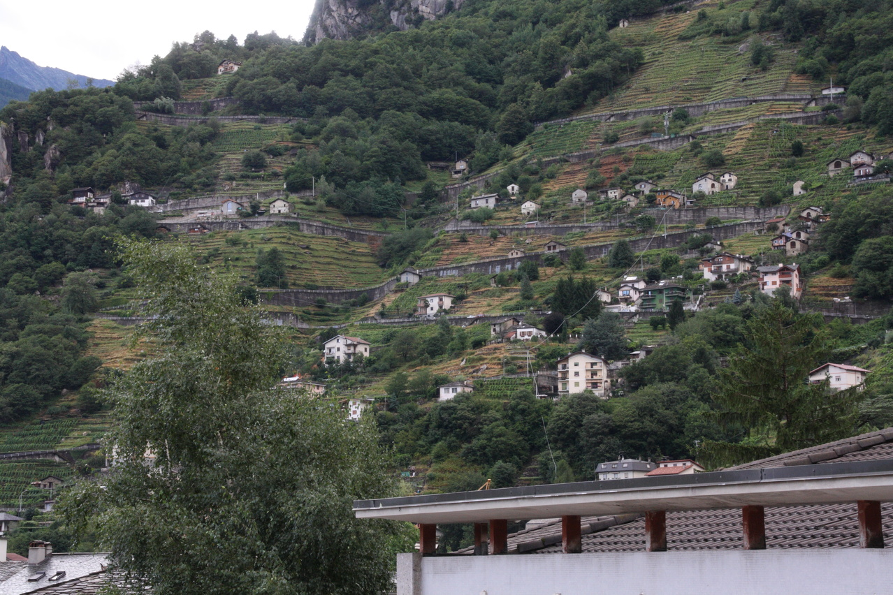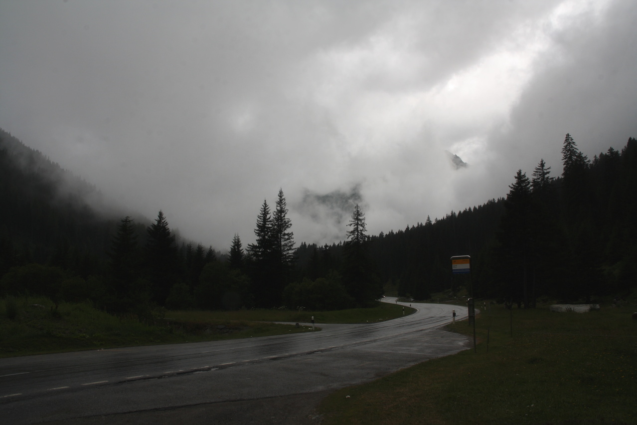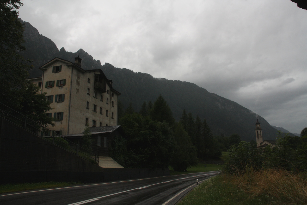 Beschreibung | Durch die notwendige Fahrradreparatur verzögerte sich der Etappenstart. Daher wurde in Silvaplana Mittag gegessen. Nach dem Mittagessen war das Fahrrad einsatzbereit, aber nun verhinderte ein Gewitter die Fahrt. ☈ Etappenstart war dann gegen 13:30 MESZ bei von ein paar Tropfen abgesehen zunächst trockenem Wetter. Der Malojapass, dessen Passhöhe im Ort Maloja liegt und nicht gekennzeichnet ist, ist etwas seltsam. Vom Engadin kommend ist ab Silvaplana keine Steigung bis zur Passhöhe auszumachen, nach Süden hin fällt die Straße jedoch steil ins Bergell ab. In Maloja kam sogar kurz die Sonne raus, aber über dem Bergell zogen dicke Regenwolken auf. Daher wurde gleich vor Beginn der Abfahrt "Nässeschutz" (Helmüberzieher, Regenjacke, Regenhose, Regengamaschen) angelegt. Später kamen auch noch die Regenhandschuhe dazu, womit der Rest der Etappe unter "Vollschutz" gefahren wurde. Bereits nach wenigen Minuten in der Abfahrt setzte zunächst leicher bis mäßiger Regen ein, der nur mit kurzen Starkregenschauern durchsetzt war, die unter Bäumen oder Bauwerken abgewartet wurden. Im Verlauf der Etappe intensivierte sich der Regen bis hin zum Dauerstarkregen, weshalb dann durchgefahren wurde. Das Ärgerliche am Regen ist nicht der Regen an sich. Dafür gibt es schließlich die "Norddeutsche Trachtenkleidung" und Müllsäcke für das Gepäck. Richtig ärgerlich sind das fehlende Bergpanorama und die stark eingeschränkten Möglichkeiten zum Fotografieren. Dafür fehlt zum einen das Bergpanorama und zum anderen ist die Kamera nicht wasserfest, weshalb nur von vor Regen geschützten Orten aus fotografiert werden kann. Während wenigstens ein Foto von den sich ins Bergell windenden Serpentinen gelang, musste auf das Fotografieren anderer Motive wie etwa die das Tal durchfließende Mera oder die in La Porta mitten durch einen Felsriegel gehauene alte Malojastraße, die wegen des für Fahrradfahrer gesperrten Tunnels bei Promontogno genutzt werden muss, verzichtet werden. In Castasegna wurde die Grenze nach Italien, Provinz Sondrio, überquert. Mit Italien wurde die Selbstversorger-Problemzone erreicht. Während in Österreich und der Schweiz selbst in kleinen Ortschaften an der Durchgangsstraße ein verhältnismäßig gut sortierter Lebensmittelladen leicht zu finden ist, kommt man in italienischen Ortschaften nur an gefühlt hundert Restaurants und Bars vorbei. Sogar in Städten ist das Finden eines Lebensmittelladens Zufall oder es dauert "etwas" länger. Dazu sind diese Läden oft dermaßen schlecht sortiert, dass man am liebsten gleich wieder raus gehen möchte. Weil die zeitraubende, kostspielige und extrem nervtötende italienische "sich-bedienen-lassen"-Kultur aber keine Alternative ist, kauft man notgedrungen irgendetwas aus dem kargen Sortiment. Am Abend hörte der Regen in Chiavenna endlich auf, dafür kamen aber die unangenehm hohen Temperaturen, die oftmals im Sommer südlich des Alpenhauptkamms herrschen, zurück. Im Nachtquartier war es dem entsprechend auch knuffig warm. Wenigstens trockneten dadurch die Klamotten bis zum nächsten Morgen. |