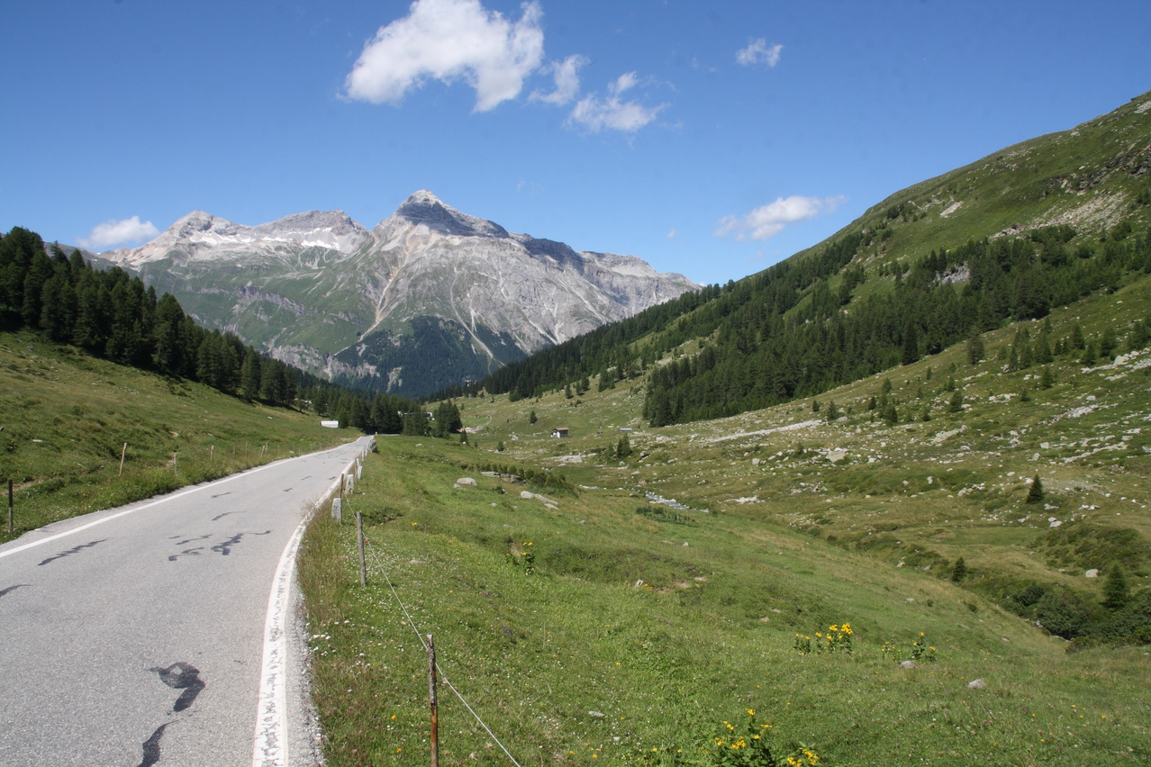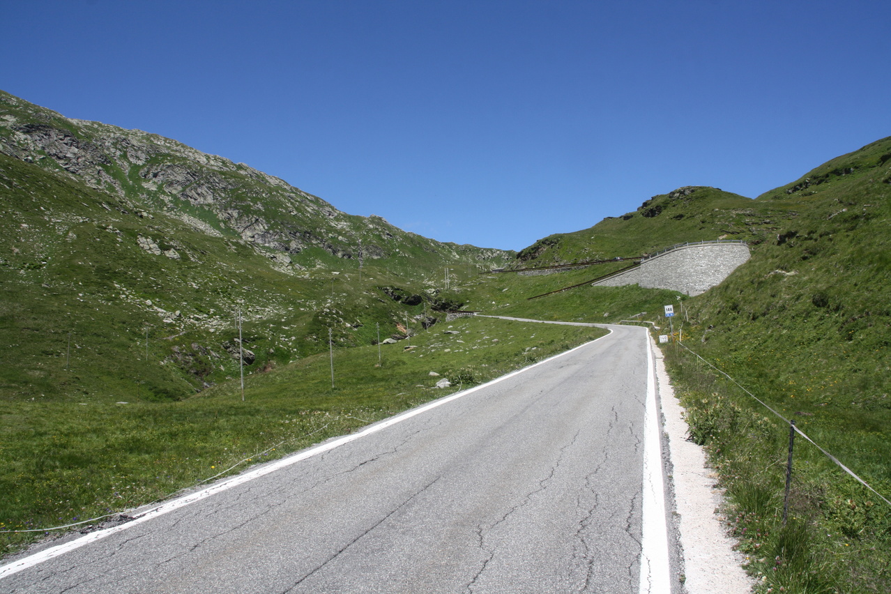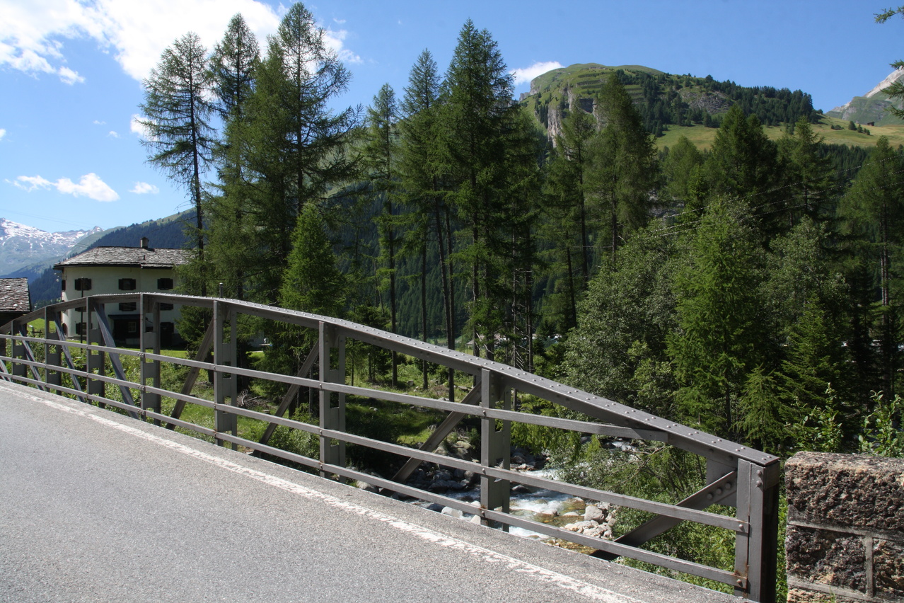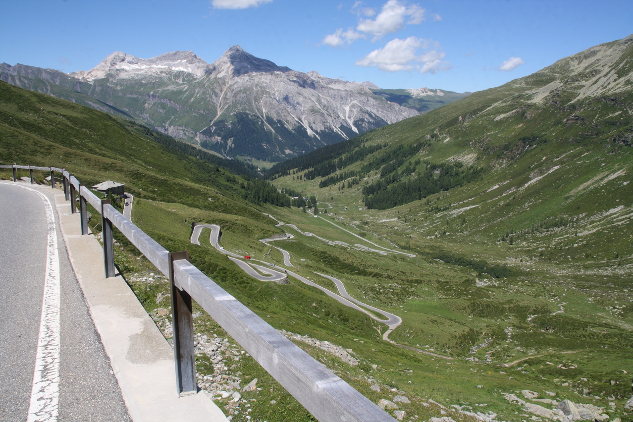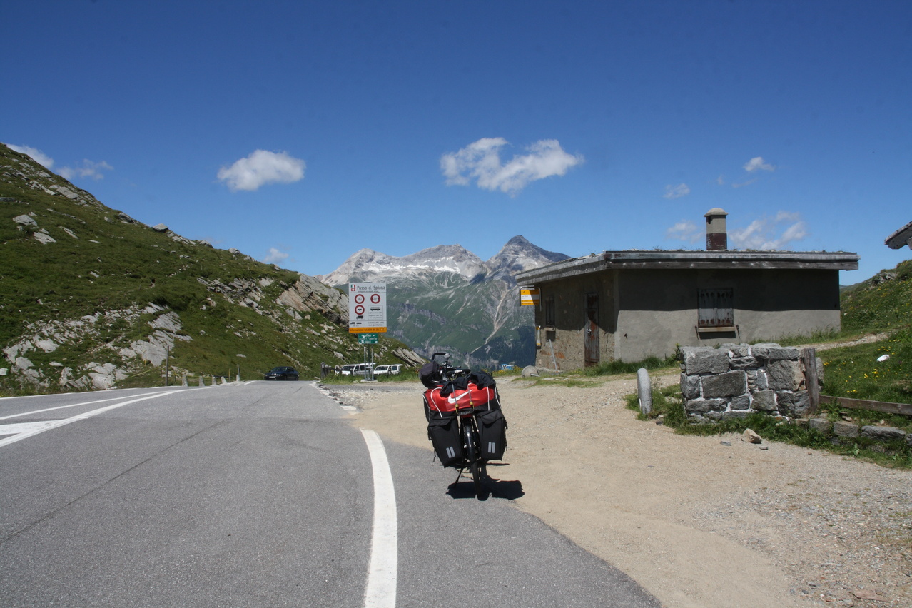 Beschreibung | Bei wolkenlosem Himmel startete diese Etappe zum vorletzten Pass der Tour. Anders als an den vorherigen sonnigen Tagen, an denen ab Mittag eine leichte Wolkenbildung einsetzte, blieben an diesem Tag Wolken die Ausnahme. Nur durch die verhältnismäßig große Höhe, in der die gesamte Etappe verlief, blieben die Temperaturen trotz ungehinderter Sonneneinstrahlung im erträglichen Bereich. Weg zum Einrollen gab es nicht, da die Splügenstraße von Pianazzo Richtung Passhöhe gleich mit über 10 % ansteigt. Weiter oben folgen etwas flachere Passagen in der Südrampe, die Fahrt um den Stausee Lago di Monte Spluga verläuft sogar eben. Da auf der Passhöhe des Splügenpasses keine Gastwirtschaft oder wenigstens eine Pommesbude oder Ähnliches steht, wurde in Monte Spluga eine Kleinigkeit gegessen. Auf der Passhöhe wurde die Grenze zur Schweiz passiert. Wanderer können diesen Pass wie schon vor hunderten von Jahren auf dem alten, immer noch gut erhaltenen Saumpfad, der "Via Spluga" passieren. Die Nordrampe enthält reichlich Serpentinen, die hier teilweise schon fast symmetrisch übereinander gelegt sind. Viele der Kehren weisen extrem enge Kurvenradien auf, die das Passieren von zwei Stinkern gleichzeitig verhindern, und auch auf dem Fahrrad lässt man stinkenden Gegenverkehr besser passieren, damit es nicht unnötig eng und gefährlich wird. Dafür wird man dort nicht mit Rasern konfrontiert, denn die Straße gibt die maximal fahrbare Geschwindigkeit vor — und die liegt sehr niedrig! Nach einer längeren mehr oder weniger geraden Abfahrt liegt vor Splügen eine weitere Kehrengruppe, die, da sie teilweise im Wald verläuft, etwas unübersichtlich ist. In Splügen fand sich dann ganz anders als in Italien ohne langes Suchen ein Lebensmittelladen. |