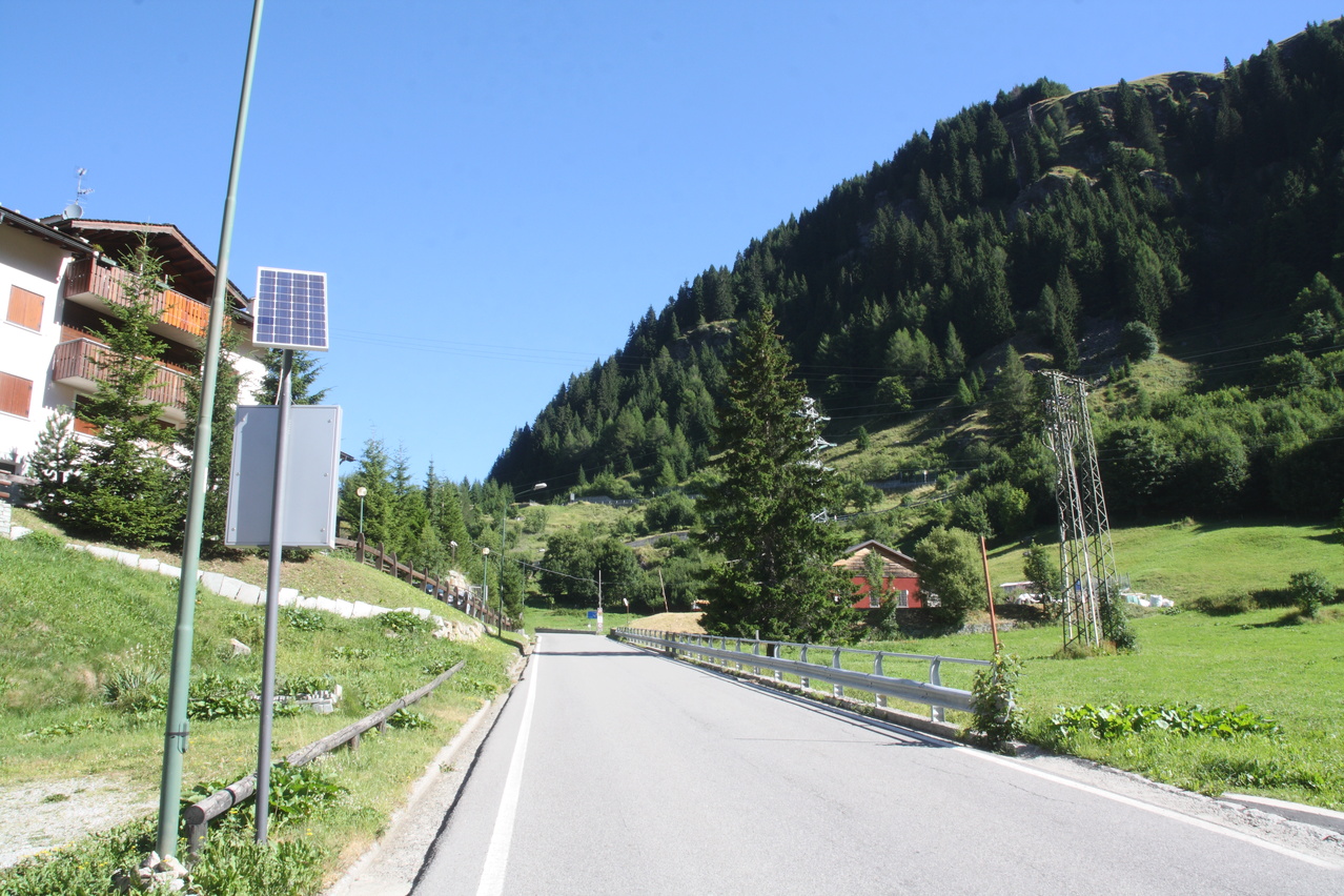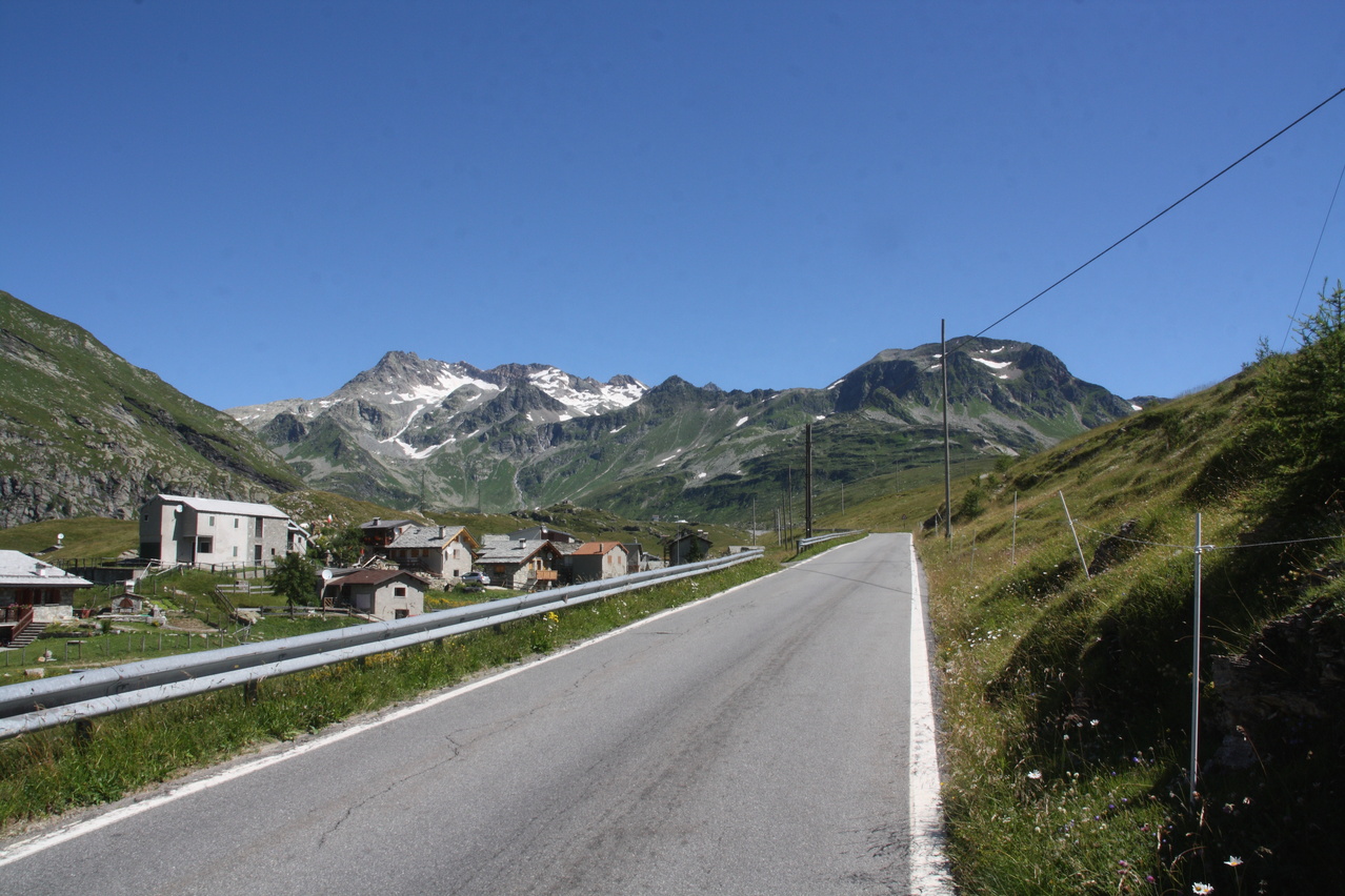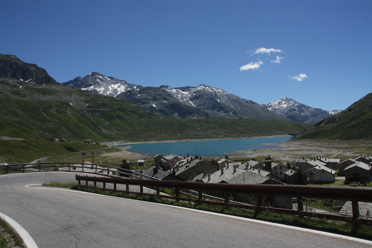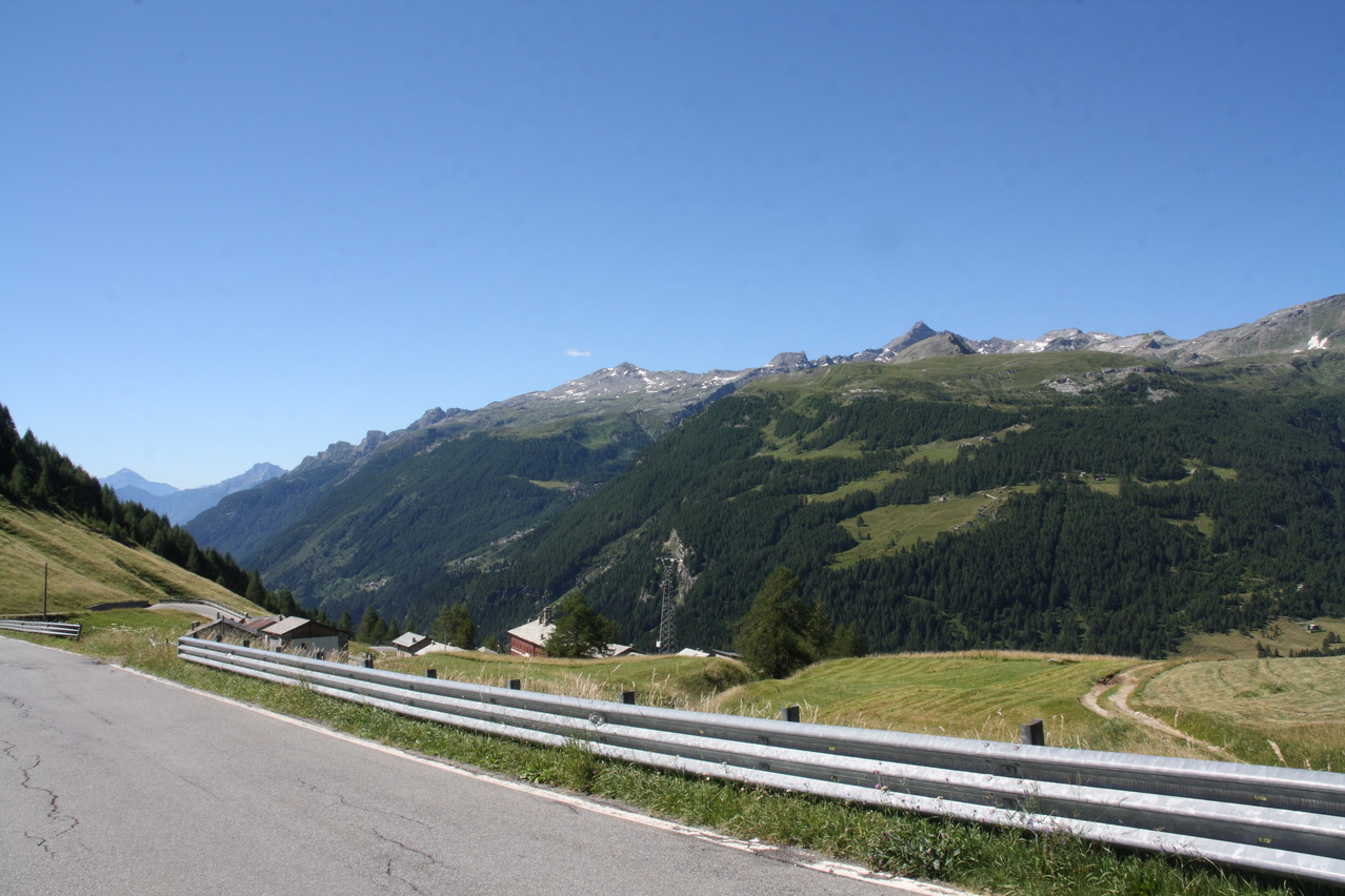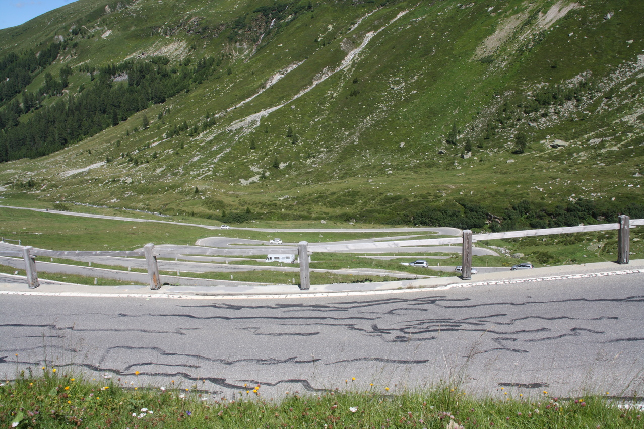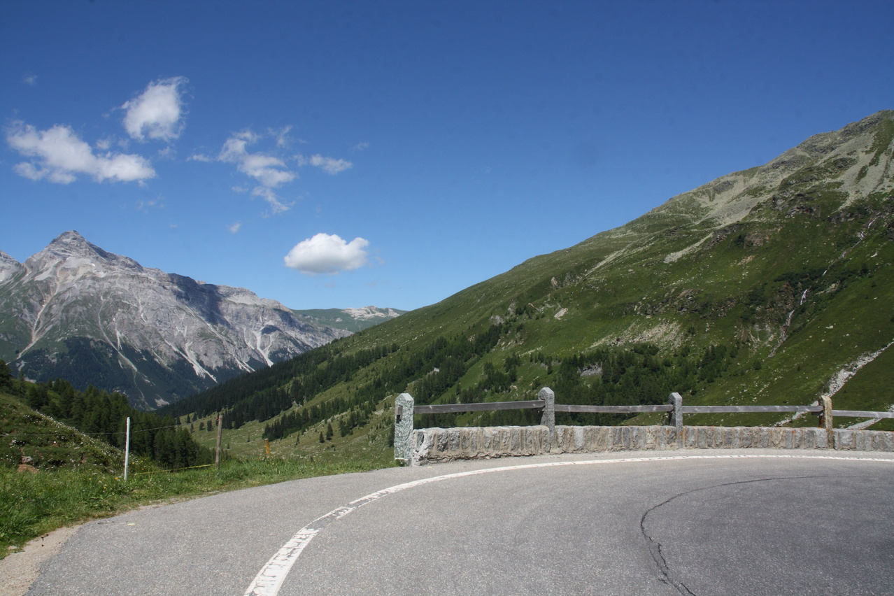 Beschreibung | Bei wolkenlosem Himmel startete diese Etappe zum vorletzten Pass der Tour. Anders als an den vorherigen sonnigen Tagen, an denen ab Mittag eine leichte Wolkenbildung einsetzte, blieben an diesem Tag Wolken die Ausnahme. Nur durch die verhältnismäßig große Höhe, in der die gesamte Etappe verlief, blieben die Temperaturen trotz ungehinderter Sonneneinstrahlung im erträglichen Bereich. Weg zum Einrollen gab es nicht, da die Splügenstraße von Pianazzo Richtung Passhöhe gleich mit über 10 % ansteigt. Weiter oben folgen etwas flachere Passagen in der Südrampe, die Fahrt um den Stausee Lago di Monte Spluga verläuft sogar eben. Da auf der Passhöhe des Splügenpasses keine Gastwirtschaft oder wenigstens eine Pommesbude oder Ähnliches steht, wurde in Monte Spluga eine Kleinigkeit gegessen. Auf der Passhöhe wurde die Grenze zur Schweiz passiert. Wanderer können diesen Pass wie schon vor hunderten von Jahren auf dem alten, immer noch gut erhaltenen Saumpfad, der "Via Spluga" passieren. Die Nordrampe enthält reichlich Serpentinen, die hier teilweise schon fast symmetrisch übereinander gelegt sind. Viele der Kehren weisen extrem enge Kurvenradien auf, die das Passieren von zwei Stinkern gleichzeitig verhindern, und auch auf dem Fahrrad lässt man stinkenden Gegenverkehr besser passieren, damit es nicht unnötig eng und gefährlich wird. Dafür wird man dort nicht mit Rasern konfrontiert, denn die Straße gibt die maximal fahrbare Geschwindigkeit vor — und die liegt sehr niedrig! Nach einer längeren mehr oder weniger geraden Abfahrt liegt vor Splügen eine weitere Kehrengruppe, die, da sie teilweise im Wald verläuft, etwas unübersichtlich ist. In Splügen fand sich dann ganz anders als in Italien ohne langes Suchen ein Lebensmittelladen. |
